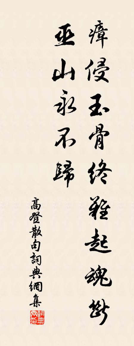 詩詞名句歷史字典書法欣賞書法字典國語詞典說文解字康熙字典古漢語字典標 題 作 者 詩 句 句作者:高登 朝代:宋代句原文瘴侵玉骨終難起,魂斷巫山永不歸。詩詞問答問:句的作者是誰?答:高登問:句寫於哪個朝代?答:宋代高登句書法欣賞句書法作品詩詞推薦閒居書事魏野〔宋代〕無才動聖君,養拙住山村。臨事知閒貴,澄心覺道尊。成家書滿屋,添口鶴生孫。仍喜多時雨,經春免灌園。輓霞溪高縣丞二首裘萬頃〔宋代〕公家原在洪崖宅,自是洪崖向上人。嗜酒一生真簡淡,風標八袠更精神。紛紛偶厭人間事,去去歸尋洞裡春。朱紱偈四首釋鼎需〔宋代〕懶翁懶不懶,最懶懶說禪。亦不重自己,亦不重先賢。又誰管你地,又誰管你天。物外翛然無個事,日上三竿猶更水仙曹彥約〔宋代〕盈盈蝶粉襯蜂黃,水國仙人內樣妝。同在寒梅應愧死,枯枝猶說傲冰霜。游西湖用中字韻呈直院高舍人沈繼祖〔宋代〕制兼內外文章伯,遠過當年高侍中。運筆不停池水黑,舉觴未厭酒珠紅。泛舟但仰膺門峻,登峴夫何湛輩同。儻以邦衡侍郎用洪範五行推薄命而成傑句嘆仰大手周必大〔宋代〕五行陳范推箕子,三壽為朋及魯申。二紀環周元附驥,四辰鱗次豈因人。交承紫掖追隨舊,遞宿金鑾契分申。人事再和孫應時〔宋代〕君詩音節中弦歌,報我英瑤百倍過。江村老人衣缽在,同參今有更人麽。雪後雨作范成大〔宋代〕瑞葉飛來麥已青,更煩膏雨發欣榮。東風不是厭滕六,卻怕雪天容易晴。春秋戰國門毛遂周曇〔唐代〕不識囊中穎脫錐,功成方信有英奇。平原門下三千客,得力何曾是素知。入局言懷喻良能〔宋代〕學省清秋好,無塵意趣長。講餘簾影靜,坐久彩衣涼。未有裨三族,真成耗太倉。顧慚麋鹿質,亦許玷朝行。往富平傷懷韋應物〔唐代〕晨起凌嚴霜,慟哭臨素帷。駕言百里途,惻愴復何為。昨者仕公府,屬城常載馳。出門無所憂,返室亦熙熙。今者水漲乘小舟樓鑰〔宋代〕一番凍雨洗郊丘,冷逼征衫四月秋。只喜青山瀉懸瀑,不知黃潦漲平疇。登途已厭頻輿轎,得意何妨且榜舟。處順鳳翀峰蘇大璋〔宋代〕早起聯鑣上翠微,瞰虛歷級步嶔崎。昔聞華頂蓮生藕,今見南山菊滿籬。縱眼橫看天地闊,壯懷唯有鬼神知。安期送淡公二首孟郊〔唐代〕燕本冰雪骨,越淡蓮花風。五言雙寶刀,聯響高飛鴻。翰苑錢舍人,詩韻鏗雷公。識本不識淡,仰詠嗟無窮。清韻貞元旱歲馬異〔唐代〕赤地炎都寸草無,百川水沸煮蟲魚。定應焦爛無人救,淚落三篇古尚書。岳王墳趙肅遠〔宋代〕來吊英雄骨尚香,一抔黃土當封疆。自從駐蹕來吳會,誰更提兵入洛陽。殯閣有燈秋樹暗,隧碑無字雨苔荒。寒鴉方山有求轉語之作並用韻二章杜范〔宋代〕觀物非外索,具眼以心會。微陽花病槁,寧供等閒醉。我嘗課前作,無言乃為最。譬彼清廟瑟,一唱弦越外。萬卉熙寧望祭岳鎮海瀆十七首佚名〔宋代〕嵩稽衡霍,暨厥海江。時維長養,惠我南邦。肆嚴牲幣,神式來降。以侑以妥,百福是龐。茶中雜詠茶焙皮日休〔唐代〕鑿彼碧岩下,恰應深二尺。泥易帶雲根,燒難礙石脈。初能燥金餅,漸見乾瓊液。九里共杉林,相望在山側。次韻和張芸老阻風見寄孔武仲〔宋代〕聞道征帆卻滯留,蕭條湘岸正南頭。春光雖有將歸意,野色仍供不盡愁。破浪心期元萬里,揚帆目送已千舟。山齊名句推薦海畔風吹凍泥裂,枯桐葉落枝梢折。陳羽《從軍行》 憶君心似西江水,日夜東流無歇時。魚玄機《江陵愁望寄子安》 志忍私,然後能公;行忍情性,然後能修荀子《荀子·儒效》 一任紫玉無情,夜寒吹裂納蘭性德《琵琶仙·中秋》 漢帝重阿嬌,貯之黃金屋。李白《妾薄命》 上窗風動竹,月微明。呂渭老《小重山·七夕病中》 曾逐東風拂舞筵,樂遊春苑斷腸天。李商隱《柳》 一條藤徑綠,萬點雪峰晴。李白《冬日歸舊山》 相逢意氣為君飲,系馬高樓垂柳邊。王維《少年行四首》 天意眷我中興,吾皇神武,踵曾孫周發。黃中輔《念奴嬌·炎精中否》