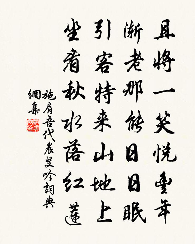 詩詞名句歷史字典書法欣賞書法字典國語詞典說文解字康熙字典古漢語字典標 題 作 者 詩 句 代農叟吟作者:施肩吾 朝代:唐代代農叟吟原文且將一笑悅豐年,漸老那能日日眠。引客特來山地上,坐看秋水落紅蓮。詩詞問答問:代農叟吟的作者是誰?答:施肩吾問:代農叟吟寫於哪個朝代?答:唐代問:代農叟吟是什麼體裁?答:七絕施肩吾代農叟吟書法欣賞代農叟吟書法作品注釋全唐詩:卷494-165詩詞推薦和張達道先生三首曹勛〔宋代〕杖屨從風入帝關,坐令爽氣滿西山。身隨清蹕雲煙上,心在華陽晻靄間。寄賀錢{左山右賁}薦福東林和尚釋紹曇〔宋代〕烹金爐去杳無蹤,沉影愁看雁過空。出手與渠重結了,未應碧眼是頑銅。永樂殷堯藩明府縣池嘉蓮詠雍陶〔唐代〕青蘋白石匝蓮塘,水裡蓮開帶瑞光。露濕紅芳雙朵重,風飄綠蒂一枝長。同心梔子徒夸艷,合穗嘉禾豈解香。不獨除夕感懷譚嗣同〔清代〕我輩蟲吟真碌碌,高歌《商頌》彼何人。十年醉夢天難醒,一寸芳心鏡不塵。揮灑琴尊辭舊歲,安排險阻著孤身。次韻秦少游王仲至元日立春三首蘇軾〔宋代〕己卯嘉辰壽阿同,願渠無過亦無功。明年春日江湖上,回首觚稜一夢中。花舞史浩〔宋代〕仙客之名從此有。多謝風流,飛馭陪尊酒。持此一卮同勸後。願花長在人長壽。小重山張生〔宋代〕杏火無煙燒斷腸。織成春恨切,柳絲長。當時誰是種花郎。卻不教,柳近杏花傍。柳道不須忙。春深須是有,絮飛偈頌一百一十七首釋紹曇〔宋代〕三月休徵,修文偃琥。治格太平,生靈鼓舞。無端塞馬嘶,又欲揚塵簸土。密運機籌,肅行師旅。塞北安南一戰收桃花曲劉秉忠〔元代〕茸茸芳草,漫漫長路,匆匆行李。佳人在何許,渺雲山千里。莫惜千金沽一醉。道劉郎、不宜憔悴。春歸寂寞語,歲暮感懷陸游〔宋代〕征塵十載暗戎衣,虛負名山採藥期。少日覆氈曾草檄,即今橫槊尚能詩。昏昏殺氣秋登隴,颯颯飛霜夜出師。曾有初秋戲作山居雜興俳體十二解楊萬里〔宋代〕暑入秋來午更強,風排兩遣曉差涼。如何遶砌千枝蕙,只是開門一陣香。諸暨道中五首葛紹體〔宋代〕曉煙晴日過楓橋,橋面山尖春半嬌。一簇誰家嫩楊柳,淡黃襟帶學宮腰。臨江仙 壽李長卿王旭〔元代〕十月小春天氣好,堯*五葉初開。長庚曾記夢中來。襟靈元灑落,風骨不塵埃。瑞靄雲生香滿室,安排北海尊*。歸朝歡(別憶)嚴仁〔宋代〕朱戶綠窗深窈窕。閃閃華旗紅乾小。相逢斜柳絆輕舟,渚香不斷苹花老。西風吹夢草。題詩未了還驚覺。獨傷心,荊江漁父竹枝詞九首和夔師□侍郎韻為荊師範項安世〔宋代〕第一歌頭緩緩催,且看漁父壽圖來。天明轉向牙旗外,六千里地繡屏開。送方岩夫四首方回〔宋代〕紫陽山下一燈寒,曾守桐廬七里灘。空手去官□一物,詩名聊得繼方乾。東寺詩僧照上人 訪予於普明寺,贈以詩楊萬里〔宋代〕故人深住白雲隈,欲到何因只寄梅。歲晚觀山吾獨立,泥中騎馬子能來。轉頭不覺三年別,病眼相看一笑開。說似讀王伯大都承奏疏王邁〔宋代〕聒耳喧啾厭畢逋,朝陽忍聽鳳凰孤。朝廷若貶饒州老,我亦甘心拜尹洙。贈瑕丘王少府李白〔唐代〕皎皎鸞鳳姿,飄飄神仙氣。梅生亦何事,來作南昌尉。清風佐鳴琴,寂寞道為貴。一見過所聞,操持難與群。毫揮蘄州別友柴望〔宋代〕客中逢客上夷陵,輾轉淒涼睡不成。無酒送君之遠道,有誰吹角向江城。白髮亂生人漸老,青燈相對雨無情。詰朝名句推薦恨入空帷鸞影獨,淚凝雙臉渚蓮光,薄情年少悔思量。顧敻《浣溪沙·荷芰風輕簾幕香》 股肱體合,則四海和平;上下猜貳,則封疆幅裂。姚察、姚思廉《梁書·列傳·卷五十六》 雄州霧列,俊采星馳。王勃《滕王閣序》 獨出前門望野田,月明蕎麥花如雪。白居易《村夜》 日照香爐生紫煙,遙看瀑布掛前川。李白《望廬山瀑布》 雲山有意,軒裳無計,被西風吹斷功名淚劉致《山坡羊·燕城述懷》 老農家貧在山住,耕種山田三四畝。張籍《野老歌 / 山農詞》 畫船捶鼓催君去。高樓把酒留君住。舒亶《菩薩蠻·畫船捶鼓催君去》 一沐三捉髮,一飯三吐哺。司馬遷《史記·魯周公世家》 繞池閒步看魚游,正值兒童弄釣舟。白居易《觀游魚》