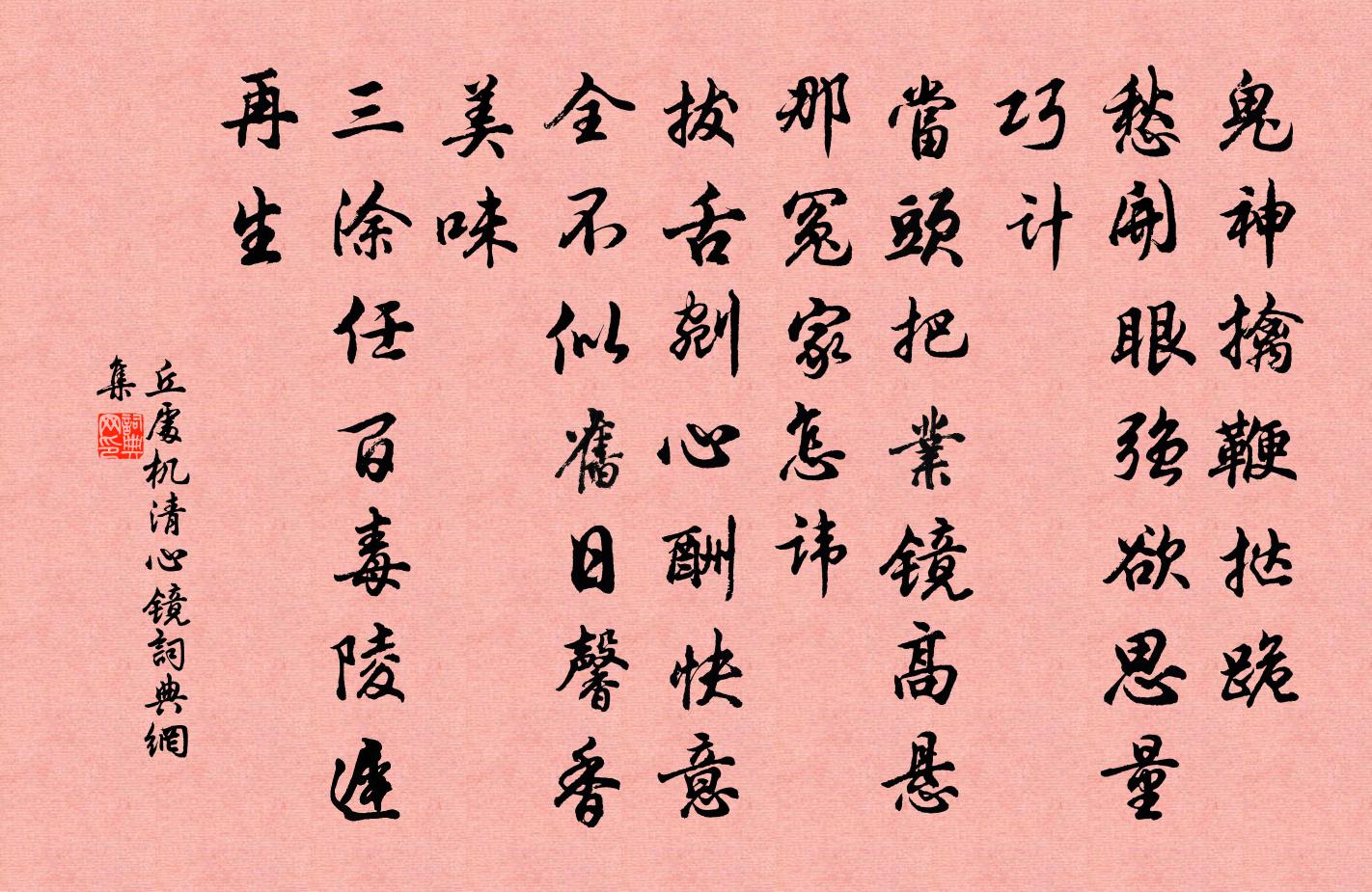 詩詞名句歷史字典書法欣賞書法字典國語詞典說文解字康熙字典古漢語字典標 題 作 者 詩 句 清心鏡作者:丘處機 朝代:元代清心鏡原文鬼神擒,鞭撻跪。愁開眼,強欲思量巧計。當頭把業鏡高懸,那冤家怎諱。拔舌剜心酬快意。全不似舊日,馨香美味。三塗任百毒陵遲,再生詩詞問答問:清心鏡的作者是誰?答:丘處機問:清心鏡寫於哪個朝代?答:元代問:清心鏡是什麼體裁?答:詞丘處機清心鏡書法欣賞清心鏡書法作品詩詞推薦陪李郎中夜宴方乾〔唐代〕間世星郎夜宴時,丁丁寒漏滴聲稀。琵琶弦促千般語,鸚鵡杯深四散飛。遍請玉容歌白雪,高燒紅蠟照朱衣。人間觀子玉郎中草聖蘇軾〔宋代〕柳侯運筆如電閃,子云寒悴羊欣儉。百斛明珠便可扛,此書非我誰能雙。警急(時高公適領西川節度)杜甫〔唐代〕才名舊楚將,妙略擁兵機。玉壘雖傳檄,松州會解圍。和親知拙計,公主漫無歸。青海今誰得,西戎實飽飛。詠藕陶弼〔宋代〕萬頃金沙里,誰將玉節栽。絲應鮫乞與,津是蚌分來。盤貯冰猶結,刀侵雪易摧。防風骨外折,混沌竅中開。月寺寄澧陽吳使君齊己〔唐代〕南客西來話使君,涔陽風雨變行春。四鄰耕釣趨仁政,千里煙花壓路塵。去獸未勝除狡吏,還珠爭似復逋民。紅蘭中秋月邵雍〔宋代〕一年一度中秋夜,十度中秋九度陰。求滿直須當夜半,要明仍候到天心。無去照處情非淺,不睡觀時意更深。徒愛同王九題就師山房孟浩然〔唐代〕晚憩支公室,故人逢右軍。軒窗避炎暑,翰墨動新文。竹蔽檐前日,雨隨階下雲。同游清蔭偏,吟臥夕陽曛。江靜失題吳可〔宋代〕熱官惱狂士,冰山倚嚴冬。此計定不長,會作須臾空。先生踏金門,大節孝與忠。能事不掛口,處之如無功。高隱送魯漕四首吳芾〔宋代〕自別頻驚歲月遷,又來此地奉周旋。雖欣同會成三老,卻恨相從未一年。君已促裝行詣闕,我方投紱欲歸田。須知奉送從兄宰晉陵韋應物〔唐代〕東郊暮草歇,千里夏雲生。立馬愁將夕,看山獨送行。依微吳苑樹,迢遞晉陵城。慰此斷行別,邑人多頌聲。酬和友人見寄(一作冬日淮上別文上人)慕幽〔唐代〕勞歌好自看,終久偶齊桓。五字若教易,一名爭得難。侵窗紅樹老,蔭砌雪花殘。莫效齊僚屬,東歸剪釣竿。太上皇帝靈駕發引輓歌詞六首范成大〔宋代〕傳聖家人禮,凝神象帝先。勛華今歷數,汾社古山川。眾父尊歸父,中天更有天。壽宮何所厭,亟上白雲仙。和人湘中作李鹹用〔唐代〕湘川湘岸兩荒涼,孤雁號空動旅腸。一棹寒波思范蠡,滿尊醇酒憶陶唐。年華蒲柳雕衰鬢,身跡萍蓬滯別鄉。不及和君貺學士宿淮上見寄宋祁〔宋代〕使舲既邅回,淮溜劇沿泝。我行非不遠,君節自前路。煙汰歷濠汭,霧氛逗荊樹。感此言邁情,慰予索居慕。曰歸金國賀正旦使人到闕宸殿宴致語口號真德秀〔宋代〕榆關玉塞靜無塵,嘉定如今第四春。兩國交馳通好使,八荒同作太平人。翠鼉鼓奏娛嘉客,白獸樽浮賞諫臣。聖歷大雨後湖上有感吳芾〔宋代〕擬為紅蕖棹綠波,那知一夜作霶。風狂俄失雲中樹,雨漲全無水面荷。尋壑勝游先自減,泛湖樂事又多磨。老懷自石橋歌張伯端〔宋代〕吾家本住石橋北,山鎮水關森古木。橋下澗水徹崑崙,山下有泉香馥郁。吾居山內實堪夸,遍地均栽不謝花。山北句陳堯佐〔宋代〕部吏百函通爵里,從兵千騎屬鞦韆右健}櫜。箕山元好問〔金代〕幽林轉陰崖,鳥道人跡絕。許君棲隱地,唯有太古雪。人間黃屋貴,物外只自潔。尚厭一瓢喧,重負寧所屑,降衷贈童尼劉言史〔唐代〕舊時艷質如明玉,今日空心是冷灰。料得襄王惆悵極,更無雲雨到陽台。名句推薦自古驕兵多致敗,從來輕敵少成功。羅貫中《三國演義·第六十九回》 鼓吹助清賞,鴻雁起汀洲。蘇轍《水調歌頭·徐州中秋》 惟德動天,無遠弗屆。滿招損,謙受益,時乃天道。佚名《尚書·虞書·大禹謨》 夫謀必素見成事焉,而後履之左丘明《國語·吳語·越王勾踐命諸稽郢行成於吳》 泰山嵯峨夏雲在,疑是白波漲東海。李白《早秋單父南樓酬竇公衡》 花明玉關雪,葉暖金窗煙。李白《折楊柳》 人之有能有為,使羞其行,而邦其昌。佚名《尚書·周書·洪範》 黃梅時節家家雨,青草池塘處處蛙。趙師秀《約客 / 有約》 問別來、解相思否。吳文英《惜秋華·七夕前一日送人歸鹽官》 隔水氈鄉,落日牛羊下,區脫縱橫。張孝祥《六州歌頭·長淮望斷》