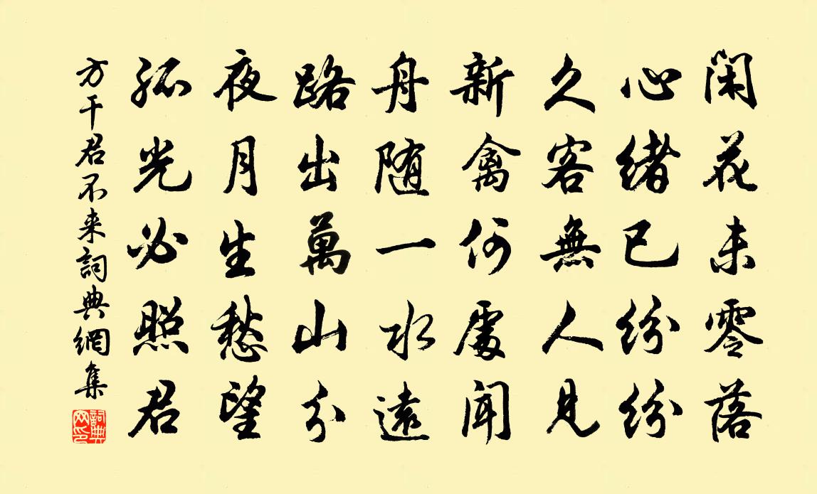 詩詞名句歷史字典書法欣賞書法字典國語詞典說文解字康熙字典古漢語字典標 題 作 者 詩 句 君不來作者:方乾 朝代:唐代君不來原文閒花未零落,心緒已紛紛。久客無人見,新禽何處聞。舟隨一水遠,路出萬山分。夜月生愁望,孤光必照君。詩詞問答問:君不來的作者是誰?答:方乾問:君不來寫於哪個朝代?答:唐代方乾君不來書法欣賞君不來書法作品注釋全唐詩:卷648-17詩詞推薦送無錫主簿王庾宋祁〔宋代〕莫嘆東南遠,須榮試吏才。客從梁苑至,家侍太邱來。木脫洲程迥,風長櫓意催。蟬知疁稻熟,鰌記海潮回。訟知題西門亭陳律〔宋代〕吾家四正峰前住,射策君門亦快哉。三島路從天外去,一枝香折月中來。鯉魚晴躍桃花浪,鸚鵡春傾竹葉杯。預宴杜宇周承勛〔宋代〕四海常為客,三春卻倦遊。能飛歸不得,雖去有何求。故國千年恨,行人萬里愁。年來風過耳,無淚與君流。偈傾一百六十九首釋智朋〔宋代〕頭頂天,腳踏地。開口吃飯,鼻孔出氣。死盡活,活盡死。百尺竿頭更進一步,未夢見衲僧巴鼻。達磨迢迢西來,次韻和吳沖卿秋意四首窺梨卑枝垂司馬光〔宋代〕端居倦煩暑,園圃久不窺。雨余秋氣新,紅葉生紫梨。形骸得蕭散,不知環堵卑。何能效流俗,把酒須菊枝。登高竹枝歌七首楊萬里〔宋代〕吳儂一隊好兒郎,只要船行不要忙。著力大家齊一拽,前頭管取到丹陽。喜收知舊書,復畏答,書二絕范成大〔宋代〕強裁尺互答相思,兩目眵昏腕力疲。牽率老夫令至此,門前猶說報書遲。重遊曲江韓偓〔唐代〕鞭梢亂拂暗傷情,蹤跡難尋露草青。猶是玉輪曾輾處,一泓秋水漲浮萍。重陽席上賦白菊白居易〔唐代〕滿園花菊鬱金黃,中有孤叢色似霜。還似今朝歌酒席,白頭翁入少年場。留別山家李頻〔唐代〕閒門不易求,半月在林丘。已與山水別,難為花木留。孤懷歸靜夜,遠會隔高秋。莫道無言去,冥心在重遊。答白杭州郡樓登望畫圖見寄張籍〔唐代〕畫得江城登望處,寄來今日到長安。乍驚物色從詩出,更想工人下手難。將展書堂偏覺好,每來朝客盡求看。見君題畫四首唐寅〔明代〕萬仞芝山接太虛,一泓萍水嬈吾廬。日長全賴棋消遣,計取輸贏賭買魚。瀟湘神黃公紹〔宋代〕月明中。月明中。滿湖春水望難窮。欲學楚歌歌不得,一場離恨兩眉峰。沁園春·十萬瓊枝陳維崧〔清代〕題徐渭文《鐘山梅花圖》,同雲臣、南耕、京少賦。十萬瓊枝,矯若銀虬,翩如玉鯨。正困不勝煙,香浮南內;嬌太皇太后合春帖子趙湘〔唐代〕九奏清新稱玉斝,八珍和旨奉蘭羞。須知天子娛親意,不為乘春事燕遊。西江月(十之十)夏元鼎〔宋代〕行處青牛引道,飛來鶴頂呈丹。談玄玉局在西川。此日方當龍漢。千載寂寥吾道,可憐平叔多言。畫蛇添足悟真篇九日席上賦得茱萸韓維〔宋代〕寥落霜園樹,萸房獨照秋。實兼蘭佩結,香近玉卮浮。嗔蕊醒殘醉,紉紅感舊遊。三英佳句在,殊喜繼風流。送李徽州赴湖北漕范成大〔宋代〕徂徠千丈松,閱世聳絕壁。高標上霄漢,峻節貫金石。惟有孤生竹,亭亭附微植。月夜借清景,春朝分秀色。托根晚春臥病喜振上人見訪李益〔唐代〕臥床殊舊日,窺戶易傷春。靈壽扶衰力,芭蕉對病身。道心空寂寞,時物自芳新。旦夕誰相訪,唯當揖上人。寄趙子昂戴表元〔宋代〕溪上輕雲去若飛,花間密石靜相依。遲行自愛款段馬,雜坐誰嗔短後衣。江海於人元不薄,風流如此欲安歸。集賢名句推薦馬穿楊柳嘶,人倚鞦韆笑,探鶯花總教春醉倒。王磐《清江引·清明日出遊》 愁顏與衰鬢,明日又逢春。戴叔倫《除夜宿石頭驛》 繡帳已闌離別夢,玉爐空裊寂寥香。馮延巳《浣溪沙·春到青門柳色黃》 日星隱曜,山嶽潛形;范仲淹《岳陽樓記》 風引龍虎旗,歌鐘昔追攀。李白《登邯鄲洪波台置酒觀發兵》 空山松子落,幽人應未眠。韋應物《秋夜寄邱員外 / 秋夜寄丘二十二員外》 羌笛何須怨楊柳,春風不度玉門關。王之渙《涼州詞二首·其一》 明君用人,如大匠用材,隨其巨細長短,以施規矩繩墨。宋濂、王褘《元史·列傳·卷四十四》 君子成人之美,不成人之惡;小人反是。孔子弟子《論語·顏淵篇》 小酌酒巡銷永夜,大開口笑送殘年。白居易《雪夜小飲贈夢得》
