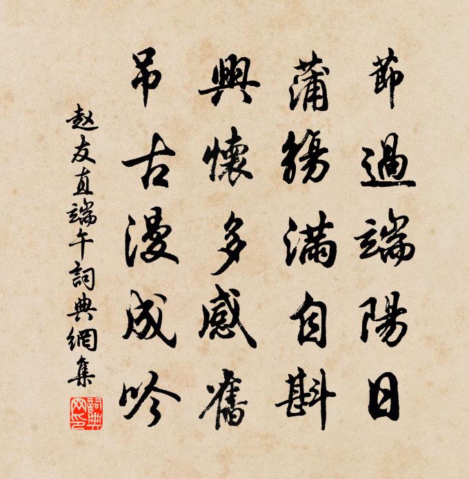詩詞名句歷史字典書法欣賞書法字典國語詞典說文解字康熙字典古漢語字典標 題 作 者 詩 句 端午作者:趙友直 朝代:宋代端午原文節過端陽日,蒲觴滿自斟。興懷多感舊,弔古漫成吟。詩詞問答問:端午的作者是誰?答:趙友直問:端午寫於哪個朝代?答:宋代趙友直端午書法欣賞端午書法作品詩詞推薦別內赴征三首李白〔唐代〕王命三征去未還,明朝離別出吳關。白玉高樓看不見,相思須上望夫山。出門妻子強牽衣,問我西行幾日歸。歸時仙人篇曹植〔魏晉〕仙人攬六箸,對博太山隅。湘娥拊琴瑟,秦女吹笙竽。玉樽盈桂酒,河伯獻神魚。四海一何局,九州安所如。韓終次韻蘇公和南新道中詩二首晁補之〔宋代〕山園芙容開,寂莫歲雲晚。公來無與同,念我百里遠。寒飆吟空林,白日下重巘。興盡還獨歸,挑燈古囊滿。獻徐舍人李中〔唐代〕清名喧四海,何止並南金。奧學群英伏,多才萬乘欽。秩參金殿峻,步歷紫微深。顧問承中旨,絲綸演帝心。褒雄范參政自建康得資政宮祠六詩寄呈趙蕃〔宋代〕風月滄浪自逐臣,煙波甫里亦遺民。未聞官號大學士,辭遜雍容得退身。書事杜牧〔唐代〕自笑走紅塵,流年舊復新。東風半夜雨,南國萬家春。失計拋漁艇,何門化涸鱗?是誰添歲月,老卻暗投人?送聶秘丞宰桐城二首司馬光〔宋代〕七載一相見,怳然如路衢。形骸漸枯槁,志業轉荒蕪。往事雲過眼,新悲雪染須。明朝又分首,上馬即重湖。柳宋祁〔宋代〕濯濯縈春晚,依依帶暝饒。楚宮皆餓死,無計學織腰。更漏子孫光憲〔唐代〕聽寒更,聞遠雁,半夜蕭娘深院。扃繡戶,下珠簾,滿庭噴玉蟾。人語靜,香閨冷,紅幕半垂清影。雲雨態,蕙蘭水龍吟(雨詞)趙長卿〔宋代〕淡煙輕靄濛濛,望中乍歇凝晴晝。才驚一霎催花,還又隨風過了。清帶梨梢,暈含桃臉,添春多少。向海棠點點,頌古一百首釋智愚〔宋代〕海運鵬摶日月忙,夜光潛透鬥牛傍。非惟按劍屢生子,瞎眼波斯滿大唐。璇璣圖蘇蕙〔南北朝〕琴清流楚激弦商秦曲發聲悲摧藏音和詠思惟空堂心憂增慕懷慘傷仁。芳廊東步階西遊王姿淑窈窕伯邵南周風興自後句陳渙〔宋代〕炊餅擔頭挑取去,白衣補上喝將來。深居雜興六首林逋〔宋代〕隱居松籟細錚然,何獨微之重碧蘚。已被遠峰擎{左山右雙}{左山右雙},更禁初月吐娟娟。門庭靜極霖苔露,句釋希晝〔宋代〕曉天金馬路,晚歲石霜心。送劉吏部得請三茅崇禧觀陳舜俞〔宋代〕老臣連上皂囊封,去訪三茅駕鶴翁。曾為蒼生論敝事,因從紫府得仙風。收身物外光陰好,回首人間寵辱空。果滿木蓮樹生巴峽山谷間巴民亦呼為黃心樹白居易〔唐代〕大者高五丈涉冬不凋身如青楊有白文葉如桂厚大無脊花如蓮香色艷膩皆同獨房蕊有異四月初始開自開迨謝僅二十日和邱提刑寄湖南賈度支蔡襄〔宋代〕何處多離感,山郵霽野光。清吟貫騷雅,遠意屬荊湘。霜樹呈秋色,風蘭生晚香。使軺偏倚望,摛藻寄迴腸。山中方岳〔宋代〕寂寞空山久掩扉,殘書誰與解重圍。推豗時作橐駝坐,恍惚化為蝴蝶飛。春事已歸雙雪鬢,生涯盡在一荷衣。夜寒送康判官往新安賦得江路西南永(一作劉長卿詩)皇甫冉〔唐代〕不向新安去,那知江路長。猿聲比廬霍,水色勝瀟湘。驛樹收殘雨,漁家帶夕陽。何須愁旅泊,使者有輝光。名句推薦塵世難逢開口笑,菊花須插滿頭歸。杜牧《九日齊山登高》 非其地而樹之,不生也。劉向《說苑·雜言》 應知早飄落,故逐上春來。何遜《詠早梅 / 揚州法曹梅花盛開》 冉冉秋光留不住,滿階紅葉暮。李煜《謝新恩·冉冉秋光留不住》 念去去,千里煙波,暮靄沉沉楚天闊。柳永《雨霖鈴·寒蟬淒切》 若似月輪終皎潔,不辭冰雪為卿熱。納蘭性德《蝶戀花·辛苦最憐天上月》 雨恨雲愁,江南依舊稱佳麗。王禹偁《點絳唇·感興》 桃花春色暖先開,明媚誰人不看來。周朴《桃花》 故君子力事日強,願欲日逾,設壯日盛。墨子《墨子·02章 修身》 春思遠,誰嘆賞、國香風味。周密《繡鸞鳳花犯·賦水仙》