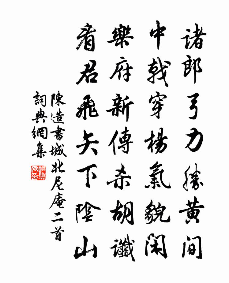 詩詞名句歷史字典書法欣賞書法字典國語詞典說文解字康熙字典古漢語字典標 題 作 者 詩 句 書城北尼庵二首作者:陳造 朝代:宋代書城北尼庵二首原文諸郎弓力勝黃間,中戟穿楊氣貌閒。樂府新傳殺胡讖,看君飛矢下陰山。詩詞問答問:書城北尼庵二首的作者是誰?答:陳造問:書城北尼庵二首寫於哪個朝代?答:宋代陳造書城北尼庵二首書法欣賞書城北尼庵二首書法作品詩詞推薦送友潘及甫〔宋代〕聚首渾無益,送君將奈何。已經貧病後,一任別離多。鬢髮新霜雪,衣裳舊薜蘿。不堪明月夜,揮手唱驪歌。促妝鍾楊備〔宋代〕枕面鐘聲及早催,錦衾香疊百花堆。蟾蜍影落珊瑚架,照得仙娥下界來。送張生還和州梅堯臣〔宋代〕山頭孤石望來久,天外行人今獨歸。藥囊自有留生術,不管淮南木葉飛。橫途歸路錢時〔宋代〕山花榮,山禽鳴,綠楊碧澗聲泠泠。此時山翁尋故人,筍輿伊軋兮度密穿青,且行且止兮草軟沙平。溪雲山雨相送謝新胥口監生趙立之程公許〔宋代〕魯壁嶧碑遠莫睹,艱哉河流訊鞀鼓。披荒摸搭不厭多,繙閱端能助稽古。向來四壁風雨秋,誰遣彯纓群玉府。終年和樂天誚失婢榜者劉禹錫〔唐代〕把鏡朝猶在,添香夜不歸。鴛鴦拂瓦去,鸚鵡透籠飛。不逐張公子,即隨劉武威。新知正相樂,從此脫青衣。附米黻所作輓詩五首蘇軾〔宋代〕小冠白疊步東園,元是青城欲度仙。六合著名猶似窄,八周御魅訖能旋。道如韓子頻離世,文比歐公復並年。我不十月廿五日有詔以予班六卿賜對衣金帶鞍馬二岳珂〔宋代〕綴跡中朝十四春,精{繆去糹加金}兩錫兩圍新。賜袍又見光蹄褭,沃轡不妨翔苑麟。有馬可乘存史闕,無衣謾賦散步西園張耒〔宋代〕歲晚傷侷促,散懷唯小園。鳴禽下荒寂,孤木倚高寒。閏月長蔬甲,清霜瘦竹竿。荊人重鮮食,怪我厭魚餐。上巳感懷仇遠〔宋代〕一春無況嬾游山,風景依然三月三。十里楊花深似雪,馬蹄無路入江南。秋懷二首郭印〔宋代〕窗戶寒生不幕羅,無邊愁緒費長喔。有情尚覺天公老,不飲爭如月色何。歲序崢嶸雙鬢改,乾坤離亂一身多。年來體之推官侍親出使聊書短篇以浼行色張舜民〔宋代〕游梁並困洛,誰是故人情。未盡環中說,俄成劍外行。路遙詩篋重,雪映彩衣明。預想東歸日,相逢指渭城。明堂觀禮雜詠十三首回龍橋望駕王同祖〔宋代〕兩行衛士錦宮袍,成歲聲長徹九皋。過盡羽旄風細細,彩雲不動御爐高。走筆和君錫堯夫司馬光〔宋代〕先生洛社坐忘機,大尹朝天去佐時。今日梅花浮別酒,青雲早晚重來披。江村雜述錢秉鐙〔清代〕自來生計少,難後更何營?襆被讓寒女,稻梁分老兄。兒知鹽米貴,天與利名輕。得飽殊非易,明年我欲耕。周郎玉笙謠楊維楨〔元代〕周郎學仙吹玉笙,玉笙吹得丹山七十二鳳之和鳴。曾侍瑤池阿母宴,座中調笑董雙成。謫向人間赤松洞,洞口桃花【正宮】叨叨令 嘆世楊朝英〔元代〕想他腰金衣紫 * ,笑俺燒丹煉藥修行處。俺笑他封妻蔭子叨天祿,不如我逍遙散誕茅庵住。倒大來快活也末哥偈頌十五首釋寶印〔宋代〕律身行業凜冰霜,接物機關走雷電。七千餘指渴思漿,願為重提 * 眠。飄風荊溪敖陶孫〔宋代〕船頭月渾雲不度,轉眼光陰遽如許。江湖無地寄風威,短蓑遺作胡旋舞。還將老病入孤舟,碧波為人生白頭。闌中田父吟五首葉茵〔宋代〕桃花深映水邊莊,夫婦相攜笑語香。耕耨有糧蠶有種,丁男戽水婦要桑。名句推薦今我來思,雨雪霏霏。佚名《採薇》 雪霏霏,風凜凜,玉郎何處狂飲?魏承班《滿宮花·雪霏霏》 林下春晴風漸和,高崖殘雪已無多。王守仁《春晴》 不惜千金買寶刀,貂裘換酒也堪豪。秋瑾《對酒·不惜千金買寶刀》 閒來無事不從容,睡覺東窗日已紅。程顥《秋日》 無肉令人瘦,無竹令人俗。蘇軾《於潛僧綠筠軒》 君子周而不比,小人比而不周。孔子弟子《論語·為政篇》 春色滿園關不住,一枝紅杏出牆來。葉紹翁《遊園不值》 唯君子為能通天下之志。佚名《易傳·彖傳上·同人》 好風憑藉力,送我上青雲。曹雪芹《臨江仙·柳絮》
