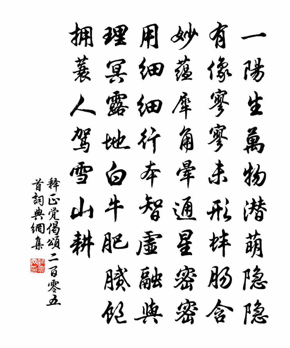詩詞名句歷史字典書法欣賞書法字典國語詞典說文解字康熙字典古漢語字典標 題 作 者 詩 句 偈頌二百零五首作者:釋正覺 朝代:宋代偈頌二百零五首原文一陽生,萬物潛萌。隱隱有像,寥寥未形。蚌腸含妙蘊,犀角暈通星。密密用,細細行,本智虛融與理冥。露地白牛肥膩飽,擁蓑人駕雪山耕。詩詞問答問:偈頌二百零五首的作者是誰?答:釋正覺問:偈頌二百零五首寫於哪個朝代?答:宋代釋正覺偈頌二百零五首書法欣賞偈頌二百零五首書法作品詩詞推薦憑欄人張可久〔元代〕江水澄澄江月明,江上何人掐[1]玉箏?隔江和淚聽,滿江長嘆聲。感懷孟郊〔唐代〕秋氣悲萬物,驚風振長道。登高有所思,寒雨傷百草。平生有親愛,零落不相保。五情今已傷,安得自能老。晨登哭刑部侍郎喬公詩徐鉉〔唐代〕舉世重文雅,夫君更質真。曾嗟混雞鶴,終日異淄磷。詞賦離騷客,封章諫諍臣。襟懷道家侶,標格古時人。逸老送陳養晦赴松陽校官戴表元〔宋代〕書生不用世,什九隱儒官。抱璞豈不佳,居貧良獨難。陳子剡中秀,盛年早彈冠。嘗搴丹丘雲,亦窺滄海瀾。仙真望江南淨圓〔宋代〕娑婆苦,身世一浮萍。蚊蚋睫中爭小利,蝸牛角上竊虛名。一點氣難平。人我盛,日夜長無明。地獄爭頭成隊入,趙逵明大社四月一日招游西湖十首楊萬里〔宋代〕風撩太液小荷欹,日麗長楊花影低。闌入苑中啼不歇,恨身不及一黃鸝。華州榜寄諸門生薛昭緯〔唐代〕時君過聽委平衡,粉署華燈到曉明。開卷固難窺浩汗,執衡空欲慕公平。機雲筆舌臨文健,沈宋章篇發詠清。自笑偈頌六十八首釋法薰〔宋代〕世尊拈花,迦葉微笑。 * 眼藏,永永流通。古佛今佛,心同道同。風從虎,雲從龍。節啟天基伸祝頌,壽齊南北中元連宿竹園劉叔嘉宅陳藻〔宋代〕朝朝風雨過中元,已熟之禾未易存。正是忙時人卻暇,且偷佳節倒芳尊。玉漏遲劉子寰〔宋代〕暮天初過。雨淒清,頓覺今年秋早。夜景虛明,仿佛露華清曉。蕙草繁花競吐,向暗裡、幽香縹緲。偈頌一百零四首釋紹曇〔宋代〕落賴門風,大家撐拄。量田底量田,種樹底種樹。帶雨犁綠野耕,和雲荷钁千峰去。有甚心情,管得南泉貓兒,趙和孫倅見貽八首曹勛〔宋代〕海色天容浸冷光,秋回山谷進風涼。不須悟性三關語,自有澄心一炷香。倦客棲遲歸意遠,暮林搖落晚山長。從來路逢襄揚楊少府入城,戲呈楊四員外綰杜甫〔唐代〕寄語楊員外,山寒少茯苓。歸來稍暄暖,當為劚青冥。翻動神仙窟,封題鳥獸形。兼將老藤杖,扶汝醉初醒。曉發杉木陳與義〔宋代〕古澤春光淡,高林露氣清。紛紛世上事,寂寂水邊行。客子凋雙鬢,田家自一生。有詩還忘記,無酒卻思傾。先寄邢子友沈伯達〔宋代〕作客今年樂有餘,邵陽岐路不崎嶇。山川好處欹紗帽,桃李香中度筍輿。欲見舊交驚歲月,剩排幽話說艱虞。人間山家劉因〔宋代〕馬蹄踏水亂明霞,醉袖迎風受落花。怪見溪童出門望,雀聲先我到山家。春日東齋梅堯臣〔宋代〕剝剝禽敲竹,薰薰日照花。耳中無俗聽,眼底有閒夸。迸筍過幽草,吹香到別家。吾懷方自得,切莫問生涯。偈頌二百零五首釋正覺〔宋代〕吸盡西江向汝道,馬師不肯落荒草。三千剎海一成秋,明月珊瑚冷相照。偈頌一百二十三首釋崇岳〔宋代〕今朝月半,見成公案。臨濟德山,猶是鈍漢。靈隱恁麽道,也是不著便。累日文符沓至悵然有感陸游〔宋代〕豪氣人言苦不除,固應屏跡向江湖。封侯萬里獨心在,餬口四方何事無?薄俗更堪開眼看,老翁寧辦折腰趨?鼠肝名句推薦君臣無禮,而上下無別。劉向《戰國策·齊六·貂勃常惡田單》 以天下為沈濁,不可與莊語。莊子《莊子·雜篇·天下》 城上日出群烏飛,鴉鴉爭赴朝陽枝。柳宗元《跂烏詞》 湘西一杯酒,渺渺紅葉換。趙蕃《次韻酬吳德夫去秋送行之作》 曾經滄海難為水,除卻巫山不是雲。元稹《離思五首·其四》 以色事他人,能得幾時好。李白《妾薄命》 絲絲楊柳絲絲雨。春在溟濛處。蔣捷《虞美人·梳樓》 大堤欲上誰相伴,馬踏春泥半是花。竇鞏《襄陽寒食寄宇文籍》 歌沉玉樹,古寺空有疏鍾發。李綱《六么令·次韻和賀方回金陵懷古鄱陽席上作》 時危見臣節,世亂識忠良。鮑照《代出自薊北門行》