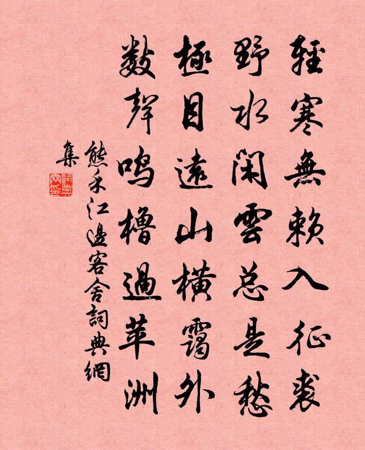 詩詞名句歷史字典書法欣賞書法字典國語詞典說文解字康熙字典古漢語字典標 題 作 者 詩 句 江邊客舍作者:熊禾 朝代:宋代江邊客舍原文輕寒無賴入征裘,野水閒雲總是愁。極目遠山橫靄外,數聲鳴櫓過苹洲。詩詞問答問:江邊客舍的作者是誰?答:熊禾問:江邊客舍寫於哪個朝代?答:宋代熊禾江邊客舍書法欣賞江邊客舍書法作品詩詞推薦和黃秋三衢舟中韻趙必象〔宋代〕壯志曾期捋虎鬚,中年跛鱉困泥途。糟{左米右離}富貴幾場醉,盧雉功名一擲呼。世事看來真塞馬,吾才只可比寄題佛智忠禪師實庵方回〔宋代〕皴皮槁項換兒童,依舊恆河見性同。作繭蠶寧長戀葉,蛻形蟬待別嘶風。雙趺可逐茶毗盡,只履誰知窣堵空。設上侍宴桃花園詠桃花應制徐彥伯〔唐代〕源水叢花無數開,丹跗紅萼間青梅。從今結子三千歲,預喜仙遊復摘來。趙提舉求作字余辭以不能工仍作詩謝之家鉉翁〔宋代〕少年振臂入場屋,寸晷謾書夸拙速。中年收斂歸法度,不能為顏僅為谷。晚歲頗為憂患困,弱腕不禁事物逐。要之題王黃州墨跡後黃庭堅〔宋代〕掘地與斷木,智不如機舂。聖人懷余巧,故為萬物宗。世有斲泥手,或不待郢工。往時王黃州,謀國極匪躬。朝聞懷錢塘舊居胡仲弓〔宋代〕錢塘漂泊久,別後夢連宵。忽聽灘頭水,猶疑江上潮。暗塵侵竹簡,夜雨洗芭蕉。料得蘇堤路,西風犯柳條。宣城倅館吳山〔宋代〕一年荒宿敬亭嵐,世路如今亦頗諳。鴉帶夕陽來舍北,雁傳秋信到江南。王曾素志非溫飽,毛義微名為旨甘。料得豆粥胡仲弓〔宋代〕豆白宜烹玉糝糜,絕勝雲子雪翻匙。蕪蔞亭上冰霜里,曾與君療一飢。謝任瀘州師中寄荔枝文同〔宋代〕有客來山中,雲附瀘南信。開門得君書,歡喜失鄙吝。筠籢包荔子,四角具封印。童稚瞥聞之,群來立如陣。競言得舍弟行可鹽官病後書林亦之〔宋代〕荷花開盡蓼花紅,遊子今年秋又窮。千里病眠鴻雁影,一書愁殺月魚翁。天寒好處予煨芋,日落何山汝轉蓬。名利臨江仙山主〔元代〕萬象分明時景現,寒光不用磨揩。大千沙界盡融該。清虛雖昧,一氣貫三才。高下岳瀆平等相,毛鱗大小同階。凡頌古三十六首釋惟一〔宋代〕不落宮商太古音,無勞弦上發清聲。高山流水有餘意,除卻子期誰解聽。戶曹廬陵胡君引年求謝事予視其精力未衰留之張栻〔宋代〕出守嗟何晚,懷歸已倦遊。細看渾矍鑠,可是畏伊優。幕下傾三語,山中賦四愁。平生大小阮,來往足風流。望蓬萊高道寬〔元代〕真訊息,明月照天涯。玉兔彩蟾十五夜,金鳥飛去吐紅霞。一點道人茶。清霄外,靜隱紫丹砂。偃月爐中烹玉蕊,歸雲溪三首郭印〔宋代〕林園三載別,相見不相猜。燕雀垂空下,龜魚近水來。但辜新筍約,猶及白蓮開。從此休官去,風光日共陪。紹興釋奠武成王七首佚名〔宋代〕日惟上世,神顧精純。社備三獻,樂成七均。奄留洋洋,流福無垠。言還恍惚,空想如存。雜曲歌辭行路難二首高適適〔唐代〕君不見富家翁,昔時貧賤誰比數。一朝金多結豪貴,萬事勝人健如虎。子孫成長滿眼前,妻能管弦妾能舞。自矜一傳神悅躬上人梅堯臣〔宋代〕握中一寸毫,寶匣百鏈金。監貌不監道,寫形寧寫心。古人固不識,今人或所欽。依然見其質,儼爾恨無音。子誠即事吳可〔宋代〕勁敵謀應大,春來勢轉雄。烽煙驚北闕,鼙鼓戰東風。雪舞愁雲外,花飛淚眼中。翠華行樂處,戈甲照寒空。得江西報六言十首劉克莊〔宋代〕但見盈城盈野,誰能去食去兵。山東河北卷土,江右湖南失耕。名句推薦榆柳蔭後檐,桃李羅堂前。陶淵明《歸園田居·其一》 飛光飛光,勸爾一杯酒。李賀《苦晝短》 今歲今宵盡,明年明日催。史青《應詔賦得除夜》 萬里乘雲去復來,隻身東海挾春雷。秋瑾《黃海舟中日人索句並見日俄戰爭地圖》 荒城臨古渡,落日滿秋山。王維《歸嵩山作》 燒痕慘澹帶昏鴉,數盡寒梅未見花。陳孚《詠永州》 人生如夢,一尊還酹江月蘇軾《念奴嬌·赤壁懷古》 毛羽未成,不可以高蜚司馬遷《史記·蘇秦列傳》 方慚不耕者,祿食出閭里。韋應物《觀田家》 山明水淨夜來霜,數樹深紅出淺黃。劉禹錫《秋詞二首》