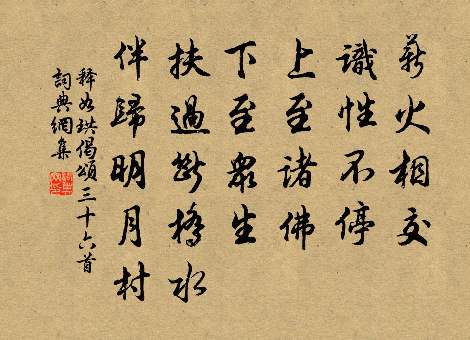 詩詞名句歷史字典書法欣賞書法字典國語詞典說文解字康熙字典古漢語字典標 題 作 者 詩 句 偈頌三十六首作者:釋如珙 朝代:宋代偈頌三十六首原文薪火相交,識性不停。上至諸佛,下至眾生。扶過斷橋水,伴歸明月村。詩詞問答問:偈頌三十六首的作者是誰?答:釋如珙問:偈頌三十六首寫於哪個朝代?答:宋代釋如珙偈頌三十六首書法欣賞偈頌三十六首書法作品詩詞推薦晚庭宋庠〔宋代〕蒼霤秋霖歇,高軒夕景遲。桐凋金井恨,蘭老玉琴悲。巢燕寒初失,風蟬晚屢移。黃昏禽語鬧,相喚宿何枝。惠州弟哀詩二首劉克莊〔宋代〕兩張遺墨六親悲,台下黃瓜摘漸稀。用北辰阡殊不亂,似南柯夢復疑非。向來豈有葡萄博,末後元無薏苡歸。七十呂公亭袁說友〔宋代〕仙翁何地不翱翔,底事三游只岳陽。不是朗吟飛過疾,洞庭張樂要迎將。感事陸游〔宋代〕陋巷何須嘆一瓢,朱門能守亦寥寥。衲衣先世曾調鼎,野褐家聲本珥貂。若悟死生均露電,未應富貴勝漁樵。千年留別定襄盧軍事馬戴〔唐代〕行行與君別,路在雁門西。秋色見邊草,軍聲聞戍鼙。酣歌擊寶劍,躍馬上金堤。歸去鹹陽里,平生志不迷。【南呂】一枝花_連雲棧上馬鄧玉賓〔元代〕連雲棧上馬去了銜,亂石灘里舟絕了纜。取驪龍頦下珠,飲鳩鳥酒中酣。闊論高談,是一個無斤兩的風雲怛,負賀新郎葛長庚〔宋代〕且盡杯中酒。問平生、湖海心期,更如君否。渭樹江雲多少恨,離合古今非偶。更風雨、十常 * 。長鋏歌彈明月送左協律京西從事曹松〔唐代〕辟書來幾日,遂喜就嘉招。猶向風沙淺,非於甸服遙。時平無探騎,秋靜見盤雕。若遣關中使,煩君問寂寥。雨後天津獨步邵雍〔宋代〕洛陽宮殿鎖晴煙,唐漢以來書可傳。多少升沉都不見,空餘四面舊山川。荷花董嗣杲〔宋代〕天機雪錦織鮫綃,艷朵亭亭倚畫橋。無垢自全君子潔,有姿誰想六郎嬌。翠房分菂蓮須褪,玉藕抽絲暑葉搖。花里繼而稍時禱而復雨喜而作詩馮伯規〔宋代〕連夕滂沱類建瓴,送將涼意滿郊坰。江邊草木太半綠,天外一峰無限青。卻信神龍元解事,豈容旱魃更爭靈。從今挽少師相國李公張元乾〔宋代〕淚盡西州路,碑留峴首名。買山緣荔子,為圃養黃精。所至登臨地,猶疑步履聲。堂堂真漢相,天忍閟佳城。泉張南史〔唐代〕泉,泉。色淨,苔鮮。石上激,雲中懸。津流竹樹,脈亂山川。扣玉千聲應,含風百道連。太液並歸池上,雲陽舊和錢穆父尚書蔣穎叔侍郎從駕景靈宮二首范祖禹〔宋代〕紫嵩清洛映重堙,舊隱荒蕪白髮新。麋鹿未能馴野性,鸞凰何敢望前塵。分班拜舞趨文陛,扈蹕賡歌紀慶辰。共助山中口占三首胡仲參〔宋代〕四野平田春水肥,前山隱隱帶殘暉。千林晚色無人共,時有樵翁獨自歸。七十三吟陸游〔宋代〕七十三年事事新,涵濡幸作六朝民。發無可白方為老,酒不能賒始覺貧。末路已悲身是客,此心猶與物為春。柴門暗思聯句皎然〔唐代〕斜風飄雨三十夜, ——疾(失姓)鄰女餘光不相借。 ——巨川(失姓)跡滅塵生古人畫, ——皎然洞房重扉觀荷方岳〔宋代〕蓮有濂溪梅有逋,兩家言句滿江湖。自惟尚與梅花隔,曾識先生太極圖。賣花聲·雨花台朱彝尊〔清代〕衰柳白門灣,潮打城還。小長乾接大長乾。歌板酒旗零落盡,剩有漁竿。秋草六朝寒,花雨空壇。更無人處一憑闌南柯子侯善淵〔元代〕匹配陰陽理,嬰公伴細腰。調和鉛汞要終朝。水底金精,移入火中燒。煉就通神劍,修成智慧刀。降龍伏虎斬邪妖名句推薦妝罷低聲問夫婿,畫眉深淺入時無。朱慶餘《近試上張籍水部 / 近試上張水部 / 閨意獻張水部》 早知潮有信,嫁與弄潮兒。李益《江南曲》 人有賢愚,任人勿求過己。來俊臣《羅織經·固榮卷第六》 葉潤林塘密,衣乾枕席清。杜甫《水檻遣心二首》 對此懷素心,千里共明月德隱《新秋晚眺》 傷情處,高城望斷,燈火已黃昏。秦觀《滿庭芳·山抹微雲》 梨花風起正清明,遊子尋春半出城。吳惟信《蘇堤清明即事》 示上以足,示下以惠,怨自削減。來俊臣《羅織經·固榮卷第六》 一道殘陽鋪水中,半江瑟瑟半江紅。白居易《暮江吟》 日下壁而沉彩,月上軒而飛光。江淹《別賦》