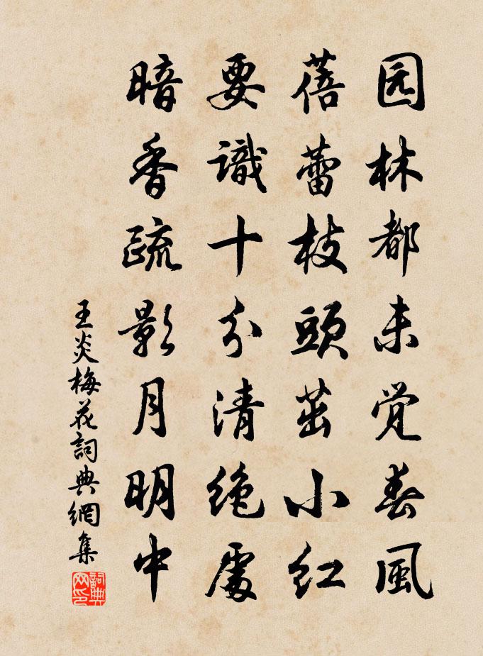 詩詞名句歷史字典書法欣賞書法字典國語詞典說文解字康熙字典古漢語字典標 題 作 者 詩 句 梅花作者:王炎 朝代:宋代梅花原文園林都未覺春風,蓓蕾枝頭茁小紅。要識十分清絕處,暗香疏影月明中。詩詞問答問:梅花的作者是誰?答:王炎問:梅花寫於哪個朝代?答:宋代王炎梅花書法欣賞梅花書法作品詩詞推薦寄題廬陵王晉輔先輩桂堂陸游〔宋代〕楚人記草木,桂在椒蘭中,我懹小山句,妙絻窮化工。唐人作山水,亦以桂配松,丹葩間綠葉,錦繡相疊重。不知雪中會孫洙舍人飲王氏西堂戲成三絕蘇轍〔宋代〕新歲逼人無一日,殘冬飛雪已三回。百分琥珀從君勸,十里瓊瑤走馬來。南國高人真巨源,華堂邂逅接清樽。十年送徐璣徐照〔宋代〕一舸寒江上,梅花共別離。不來相送處,愁有獨歸時。去夢千峰遠,為官三歲期。思君難可見,新集見君詩。天人陳杰〔宋代〕天上分明暗,人間澀喜嗔。及魚殃本妄,得馬福非真。酒薄還圍趙,渠成適利秦。聖賢惟任道,兩不系天人。有美一人行釋文珦〔宋代〕有美一人閒且都,天然自與常人殊。奔逸絕塵遺步趨,宛在大海之東隅。珠宮貝闕非凡居,鮫綃被體雲霞裾。朝乘寄玉梁施道士林逋〔宋代〕子云遺構住丹房,天鼓時聞數叩霜。真景截波尋鐵柱,怪書披月看銅牆。氳氳顥氣朝胎息,熠熠辰輝夜步網。大靜梅梁殿馬之純〔宋代〕太極初時欠一梁,漂流偶見石城傍。曾聞禹廟還如此,可見川只欲效祥。不但千年無朽蠹,能令滿殿有芬香。要將題靈洞路范端臣〔宋代〕傍溪多立石,逕轉特勾衣。雲兼晚色至,葉帶秋聲飛。孤鷺忽驚去,片雲明殘暉。鹽車重楊維楨〔元代〕鹽車重,鹽車重,官驥牽不動。官鉈私秤秤不平,秤秤束縛添畸令。鹽車重,重奈何,旑令帶多私轉多。大商鬻不聞罷方岳〔宋代〕面骨岩棱不入流,放歸何止四宜休。束書自可供兒讀,斗酒聊須與婦謀。舊藁如山應有誤,老夫於世本無求。一犁筆占示要君奇宋理宗〔宋代〕許負往昔矣,天綱今何之。誰知千載後,復遇林君奇。過廣愛寺,見三學演師,觀楊惠之塑寶山、朱蘇軾〔宋代〕妙跡苦難尋,茲山見幾層。亂峰螺髻出,絕澗陣雲崩。措意元同畫,觀空欲問僧。莫教林下意,終老嘆何曾。寄吳士矩端公五十韻(此後並江陵士曹時作)元稹〔唐代〕昔在鳳翔日,十歲即相識。未有好文章,逢人賞顏色。可憐何郎面,二十才冠飾。短髮予近梳,羅衫紫蟬翼。伯舅梅花林逋〔宋代〕吟懷長恨負芳時,為見梅花輒入詩。雪後園林才半樹,水邊籬落忽橫枝。人憐紅艷多應俗,天與清香似有私。堪笑行路難梅堯臣〔宋代〕途路無不通,行貧足如縛。輕裘誰家子,百金負六博。蜀道不為難,太行不為惡。平地乏一錢,寸步鄰溝壑。劉兵曹贈酒張籍〔唐代〕一瓶顏色似甘泉,閒向新栽小竹前。飲罷身中更無事,移床獨就夕陽眠。寄田郎姜夔〔宋代〕楚楚田郎亦大奇,少年風味我曾知。春城寒食誰相伴,夜月犁花有所思。剪燭屢呼金鑒落,倚窗閒品玉參差。含情頌證道歌證道歌釋印肅〔宋代〕早時成佛於今在,瓶傾不出周沙界。妙音遐暢廣宣揚。念者念兮拜者拜。次韻德麟吳越山水陳師道〔宋代〕吳山那可說,已覺心耳靜。忍事如忍欲,可遏不可騁。人生如此耳,黃白滿朝鏡。寧懷斗升粟,不理東南艇。君從閒居書懷趙時韶〔宋代〕檐溜垂籌未收,一年樂事負春遊。新添華發羞開鏡,貪看青山懶下樓。天地至今多岡象,功名到底總蚍蜉。祗因知名句推薦易挑錦婦機中字。難得玉人心下事。劉克莊《玉樓春·戲林推》 春生、夏長、秋收、冬藏,天之正也王詡《鬼谷子·持樞》 秋風別蘇武,寒水送荊軻。庾信《擬詠懷二十七首·其二十六》 有眼不識泰山。施耐庵《水滸傳·第二回》 一切福田,不離方寸;從心而覓,感無不通。袁黃《了凡四訓·立命之學》 庭院深深深幾許,楊柳堆煙,簾幕無重數。歐陽修《蝶戀花·庭院深深深幾許》 花前失卻遊春侶,獨自尋芳。馮延巳《採桑子·花前失卻遊春侶》 有客躊躇,古庭空自吊孤影。史達祖《齊天樂·中秋宿真定驛》 勝日尋芳泗水濱,無邊光景一時新。朱熹《春日》 不信妾斷腸,歸來看取明鏡前。李白《長相思·其二》