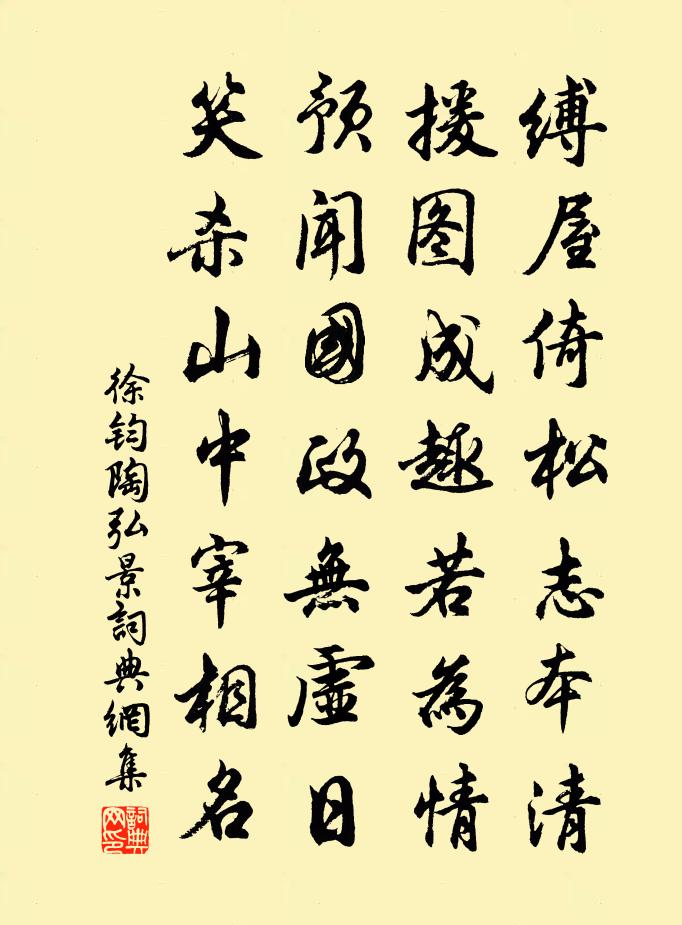 詩詞名句歷史字典書法欣賞書法字典國語詞典說文解字康熙字典古漢語字典標 題 作 者 詩 句 陶弘景作者:徐鈞 朝代:宋代陶弘景原文縛屋倚松志本清,援圖成趣若為情。預聞國政無虛日,笑殺山中宰相名。詩詞問答問:陶弘景的作者是誰?答:徐鈞問:陶弘景寫於哪個朝代?答:宋代徐鈞陶弘景書法欣賞陶弘景書法作品詩詞推薦荷葉鋪水面康與之〔宋代〕春光艷冶,遊人踏綠苔。千紅萬紫競香開。暖風拂鼻籟,驀地暗香透滿懷。荼縻似錦裁。嬌紅間綠白,只怕迅速春藏春峽四首陳瓘〔宋代〕主人心地冷如灰,只把園花取次栽。峽外漫多閒雨露,直須並此入山來。探梅分韻得香字於石〔宋代〕絕壁兩屨雲,荒村半橋霜。孤往欲何之,林下幽徑長。寒梅在何許,臨風幾徜徉。誰家斷籬外,一枝寄林塘。水靜太湖石歌吳融〔唐代〕洞庭山下湖波碧,波中萬古生幽石。鐵索千尋取得來,奇形怪狀誰能識。初疑朝家正人立,又如戰士方狙擊。又如水調歌頭(饒風嶺上見梅)王質〔宋代〕花上插蒼碧,花下走清湍。濃霜深覆殘雪,更有月相參。似我竹溪茅屋,欲曉未明天氣,扶杖繞籬看。秦楚五千里早春吳激〔金代〕寂寂重寂寂,出門春草齊。晚芳猶著樹,江漲欲平溪。山暝有時雨,村深何處雞。遠山緣底恨,故作傍人低。和王微之登高齋三首王安石〔宋代〕六朝人物隨煙埃,金輿玉幾安在哉。鍾山石城已寂寞,只見江水雲端來。百年故老有存者,尚憶世宗初伐淮。魏王淮上遇洛陽李主簿韋應物〔唐代〕結茅臨古渡,臥見長淮流。窗里人將老,門前樹已秋。寒山獨過雁,暮雨遠來舟。日夕逢歸客,那能忘舊遊。晚秋西省寄上李韓二舍人司空曙〔唐代〕晝漏傳清唱,天恩禁旅秋。雁親承露掌,砧隔曝衣樓。賜膳中人送,餘香侍女收。仍聞勞上直,晚步鳳池頭。獻知府張少卿強至〔宋代〕當年直氣吐虹霓,因使平津位晚躋。大筆驅馳爭化匠,纖機擺落得天倪。名隨婺女雙溪遠,詩壓休文八詠低。官是賢者之孝二百四十首陶侃林同〔宋代〕陶公宴參佐,限極每歡余。憶與亡親約,悽然不敢逾。取蘭梅置几上三首張嵲〔宋代〕崇蘭梅蘂竝時芳,更得春風為發揚。還似高人有常德,年年只作舊時香。點絳唇張孝祥〔宋代〕萱 * 花,畫堂永晝風清暑。麝團菰黍。助泛菖蒲醑。兵辟神符,命續同心縷。宜歡聚。綺筵歌舞。歲歲酬端午。句張俞〔宋代〕欲作外臣誰是友,白雲孤鶴在岩扉。游清都觀尋沈道士得芳字趙中虛〔唐代〕青溪阻千仞,姑射藐汾陽。未若游茲境,探玄眾妙場。鶴來疑羽客,雲泛似霓裳。寓目雖靈宇,游神乃帝鄉。道存下桂江龍目灘宋之問〔唐代〕停午出灘險,輕舟容易前。峰攢入雲樹,崖噴落江泉。巨石潛山怪,深篁隱洞仙。鳥游溪寂寂,猿嘯嶺娟娟。揮袂次韻子厚弟小春偶成王之道〔宋代〕強插梨花做小春,風前詩思有餘清。路逢野老那知姓,耳聽幽禽自喚名。歲晚山林松檜色,天寒關塞鼓鞞聲。枕流浣溪沙張炎〔宋代〕艾蒳香消火未殘。便能晴去不多寒。冶遊天氣卻身閒。帶雨移花渾懶看,應時插柳日須攀。最堪惆悵是東欄。自嘲白須三首基楊萬里〔宋代〕客傅涅須法,老子付一笑。借令白再玄,能令年再少。八聲甘州汪莘〔宋代〕惜余春、蛺蝶引春來,杜鵑趣春歸。算何如桃李,渾無言說,開落忘機。多謝黃鸝舊友,相逐落花飛。芳草連天遠名句推薦斟酌姮娥,九秋宮殿冷。史達祖《齊天樂·中秋宿真定驛》 江淮度寒食,京洛縫春衣。王維《送綦毋潛落第還鄉 / 送別》 攜籮驅出敢偷閒,雪脛冰須慣忍寒。范成大《雪中聞牆外鬻魚菜者求售之聲甚苦有感》 揚雲霓之晻藹兮,鳴玉鸞之啾啾。屈原《離騷》 南國辛居士,言歸舊竹林孟浩然《都下送辛大之鄂》 舉杯互敬屠蘇酒,散席分嘗勝利茶。 * 《元旦口占用柳亞子懷人韻》 使能,國之利也。左丘明《左傳·文公·文公六年》 稻花香里說豐年。聽取蛙聲一片。辛棄疾《西江月·夜行黃沙道中》 治國無法則亂,守法而弗變則悖,悖亂不可以持國。呂不韋《呂氏春秋·覽·慎大覽》 屋上春鳩鳴,村邊杏花白。王維《春中田園作》