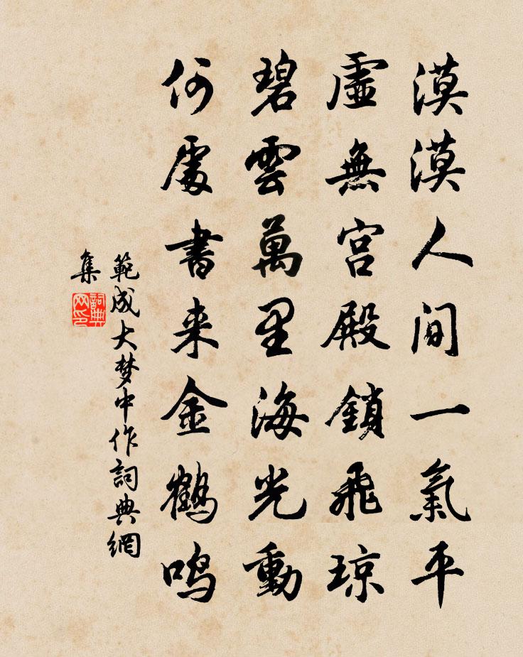 詩詞名句歷史字典書法欣賞書法字典國語詞典說文解字康熙字典古漢語字典標 題 作 者 詩 句 夢中作作者:范成大 朝代:宋代夢中作原文漠漠人間一氣平,虛無宮殿鎖飛瓊。碧雲萬裏海光動,何處書來金鶴鳴。詩詞問答問:夢中作的作者是誰?答:范成大問:夢中作寫於哪個朝代?答:宋代問:范成大的名句有哪些?答:范成大名句大全范成大夢中作書法欣賞夢中作書法作品詩詞推薦曾先生第一百三十六文天祥〔宋代〕江海日淒涼,賢聖盡蕭索。西河共風味,顧步涕橫落。偈頌七十八首釋正覺〔宋代〕道綿綿兮用也不勤,道綿綿兮寂也不滅。二乘困墮於空無,眾生執迷於分別。菩薩區區於進修,諸佛嘮嘮於演說。菩薩蠻(去歲壽李嗣立)郭應祥〔宋代〕誕辰遲似秋三日。草堂已有新涼入。鬢綠未全霜。欣然把一觴。吟松新納祿。共享清閒福。兩個老人星。君家難弟通天岩王奇〔宋代〕松羅石室中,清雅勝支公。地靜無塵到,天高有穴通。秦樓月 書合曲詩卷劉敏中〔元代〕秋蕭索。秋來不奈情懷惡。情懷惡。西風一曲,醉鄉寥廓。宮聲自與商聲約。珠喉玉管都忘卻。都忘卻。行雲不散社日小飲陸游〔宋代〕社日西風吹角巾,一樽強醉汝江濱。杏梁燕子還堪恨,歸去匆匆不報人。次韻子瞻感舊蘇轍〔宋代〕還朝正三伏,一再趨未央。久從江海游,苦此劍佩長。夢中驚和璞,起坐憐老房。為我忝丞轄,置身願並涼。此心城中赴范純甫酒有感陳著〔宋代〕杜鵑啼斷洛陽橋,心與萍流絮與飄。風雨故都同死夢,山林晚景十年饒。相逢得醉有今日,萬事忘言付落潮。見說將至南都途中感舊二首寄錢穆父孔文仲〔宋代〕北風吹雪滿皇州,攜手同為落魄游。霄漢路歧騰萬里,江湖塵土積千憂。世情共逐飛蓬轉,人事都如激浪流。只待已亥雜詩 197龔自珍〔清代〕一百八下西溪鍾,一十三度溪花紅。是恩是怨無性相,冥祥記里魂朦朧。病中次務觀通判韻周必大〔宋代〕老眼亂蟬翼,樂事嘆何有。經年不銜杯,更暇問濡首。愛山空在山,擿埴詎容走。塵埃登高帽,生澀彈棋手。三年羑里廟洪皓〔宋代〕羑河依舊羑城空,十畝頹基象四墉。重易待更三聖備,諸侯那得七年從。斯文未喪今猶在,遺像雖存祭不供。尚有村居二首白居易〔唐代〕田園莽蒼經春早,籬落蕭條盡日風。若問經過談笑者,不過田舍白頭翁。門閉仍逢雪,廚寒未起煙。貧家重寥落,去年孫從之示玉蕊佳篇時過未敢賡和今年此花周必大〔宋代〕食菜曾饕三百囷,種花重看一番新。洞仙舊賞輪無跡,工部高吟筆有神。疊雪雅宜歌白雪,送春仍欲買青春。向來送禪雅歸姑蘇鄭獬〔宋代〕秋風江上白雲飛,江氣飄蕭欲灑衣。正是荷花滿吳國,詩人靈徹故山歸。夏自然惠五言古體久之以律體和謝方回〔宋代〕古五言詩今罕見,把看愈久愈精神。何能筆下有斯作,似覺眼中無此人。政用整嚴藏細潤,元從冷淡出清新。著鞭頌古九十八首釋印肅〔宋代〕何處無雲不是門,藏鋒不露理難論。雪峰未盡玄沙意,惹得村人村又村。戲聯回文體黃春伯〔宋代〕水連天渺渺,山映月亭亭。尾櫂依鳧渚,頭船過蓼汀。鬼神號暝壑,煙霧靄疎欞。美醖浮觴玉,輕衣拂劍星。代和陳郎中丹桂三首陳耆卿〔宋代〕露沐煙梳冉冉時,朗然新月似蛾眉。傍人盡向天邊覓,不信蟾宮在樹枝。謝王元才見惠峨嵋山菩薩石晁公溯〔宋代〕久聞光明山,下有太古雪。大冬劇嚴凝,厚地愈融結。崢嶸成層冰,千歲終不滅。野翁因斸荒,得此走城闕。初非名句推薦九華山路雲遮寺,清弋江村柳拂橋。杜牧《宣州送裴坦判官往舒州時牧欲赴官歸京》 樂易者常壽長,憂險者常夭折。荀子《荀子·榮辱》 今古長如白練飛,一條界破青山色。徐凝《廬山瀑布》 想得此時情切,淚沾紅袖黦。韋莊《應天長·別來半歲音書絕》 黃葉古祠寒雨積,清山荒冢白雲多。于謙《岳忠武王祠》 闌乾風冷雪漫漫,惆悵無人把釣竿。姜夔《釣雪亭》 燕子重來,往事東流去。吳文英《點絳唇·時霎清明》 寒雨連江夜入吳,平明送客楚山孤。王昌齡《芙蓉樓送辛漸》 玉人初上木蘭時。懶妝斜立澹春姿。吳文英《浣溪沙·題李中齋舟中梅屏》 惜恐鏡中春。不如花草新。張先《菩薩蠻·憶郎還上層樓曲》