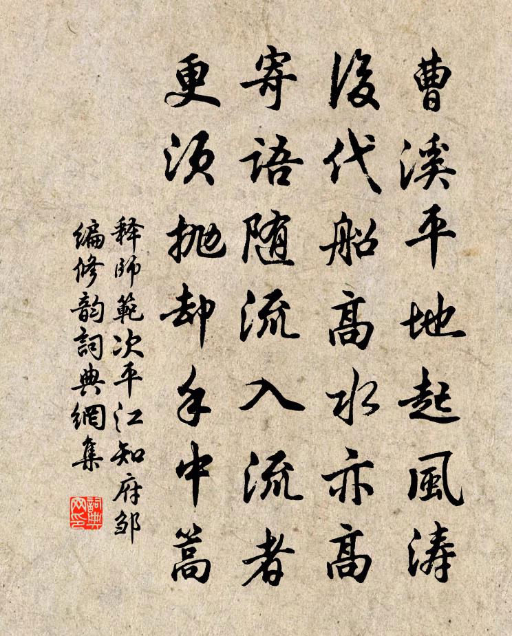 詩詞名句歷史字典書法欣賞書法字典國語詞典說文解字康熙字典古漢語字典標 題 作 者 詩 句 次平江知府鄒編修韻作者:釋師範 朝代:宋代次平江知府鄒編修韻原文曹溪平地起風濤,後代船高水亦高。寄語隨流入流者,更須拋卻手中篙。詩詞問答問:次平江知府鄒編修韻的作者是誰?答:釋師範問:次平江知府鄒編修韻寫於哪個朝代?答:宋代釋師範次平江知府鄒編修韻書法欣賞次平江知府鄒編修韻書法作品詩詞推薦三游洞鄧深〔宋代〕詰曲山蹊晚,清冷石澗秋。三門儼呀豁,四壁極琱鎪。上穴重岩閟,中龕一室幽。斐然成五字,聊爾繼乘風。雪後觀梅吳芾〔宋代〕春色三分已一分,江梅猶自占青春。有花堪折須拼醉,莫待東風吹作塵。閒居雜詠三十二首禮陳淳〔宋代〕禮者人之門,節文自中根。所主一以敬,出入無不存。章質夫帥廣時以酒六壺寄東坡於惠州書到而酒朱翌〔宋代〕西樞鎮番禺,紹聖之初年。覆露落南人,雅意極周旋。六尊南海春,萬里羅浮仙。先生洗破觥,使者張空拳。五十新春張嵲〔宋代〕人生一世竟何哉,老去萬緣如死灰。愛惜分陰成底用,不如惡夢早醒來。和因上人三首王之道〔宋代〕白雲飛處是吾家,石眼泠泠水一車。醉日到來應種竹,梅時過盡好藏茶。遙憐壺棗初成實,似說占禾半吐花。已得公辨再贈,複次韻范成大〔宋代〕書生活計極蕭騷,爝火微明似束蒿。犬子地寒徒壁立,元龍身懶謾樓高。筆端未辦夸三絕,酒里猶能掃二豪。又向送張無夢歸天台山戚綸〔宋代〕應悔名高藏不得,朝天翻喜放身歸。知時多順時人話,溫俗猶披俗士衣。有伴指期玄鶴老,無心高羨白雲飛。赤城喜杜仲高移居清湖高翥〔宋代〕笑攜雞犬入城居,無復游從嘆闊疏。河水通船堪載酒,桐陰近屋可修書。飯香休憶辛田米,羹美何慚丙穴魚。我亦句李良臣〔宋代〕簡州何處景最佳,東溪清絕人最夸。漢宮春佚名〔宋代〕點點江梅,對寒威強出,一弄新奇。零珠碎玉,為誰密上南枝。幽香冷艷,縱孤高、卻遣誰知。惟只有、江頭驛畔和人游嵩山十二題其十三醉石范仲淹〔宋代〕巍巍八仙壇,上有三醉石。憐此高陽徒,如樂華胥域。憔悴澤邊人,獨醒良可惜。秋晴獨立南亭楊發〔唐代〕晝對南風獨閉關,暗期幽鳥去仍還。如今有待終身貴,未若忘機盡日閒。心似蒙莊游物外,官慚許掾在人間。開襟達哉樂天行(一作健哉樂天行)白居易〔唐代〕達哉達哉白樂天,分司東都十三年。七旬才滿冠已掛,半祿未及車先懸。或伴遊客春行樂,或隨山僧夜坐禪。二年大中祥符封禪十首真宗〔宋代〕毖祀柔祗,報功厚載。思文太宗,侑神嚴配。鍾石斯和,籩豆鹹在。永錫坤珍,資生為大。送賓書記自揚歸吳門張榘〔宋代〕一葉黃蘆渡渺茫,誤隨野鶴上維揚。角聲吹斷梅花夢,依舊楓灣半葉霜。偈頌一百三十六首釋惟一〔宋代〕九月授衣,無衣可受。衲僧門下,別有要妙。新糊紙被烘來暖,一覺和衣到五更。聞得上方鍾皷動,又添一日在浮滿江紅辛棄疾〔宋代〕塗堂上,三鼓方醒。國華賦詞留別,席上和韻。青塗,端仁堂名也宿酒醒時,算只有、清愁而已。人正在、青塗堂寄海會之長老釋重顯〔宋代〕百花開後一花開,風遞清香遠遠來。誰問黃梅不平事,照中依舊惹塵埃。省過程端蒙〔宋代〕此道從來信不疑,安行何處履危機。無心更與世俯仰,有口不談人是非。悔吝愆尤須謹細,存亡得失要知幾。師門名句推薦教婦初來,教兒嬰孩。顏之推《顏氏家訓·教子篇》 厭名利之談者,未必盡忘名利之情。陳繼儒《小窗幽記·集醒篇》 言則稱於湯文,行則譬於狗豨。墨子《墨子·46章 耕柱》 春去花還在,人來鳥不驚。王維《畫》 打起黃鶯兒,莫教枝上啼。金昌緒《春怨 / 伊州歌》 薊城通漠北,萬里別吾鄉。李頎《古塞下曲》 東船西舫悄無言,唯見江心秋月白。白居易《琵琶行 / 琵琶引》 說者成伍,煩言飾辭,而無實用。商鞅《商君書·農戰》 得人之道,在於知人;知人之法,在於責實。脫脫《宋史·列傳·卷九十七》 今夜鄜州月,閨中只獨看。杜甫《月夜》