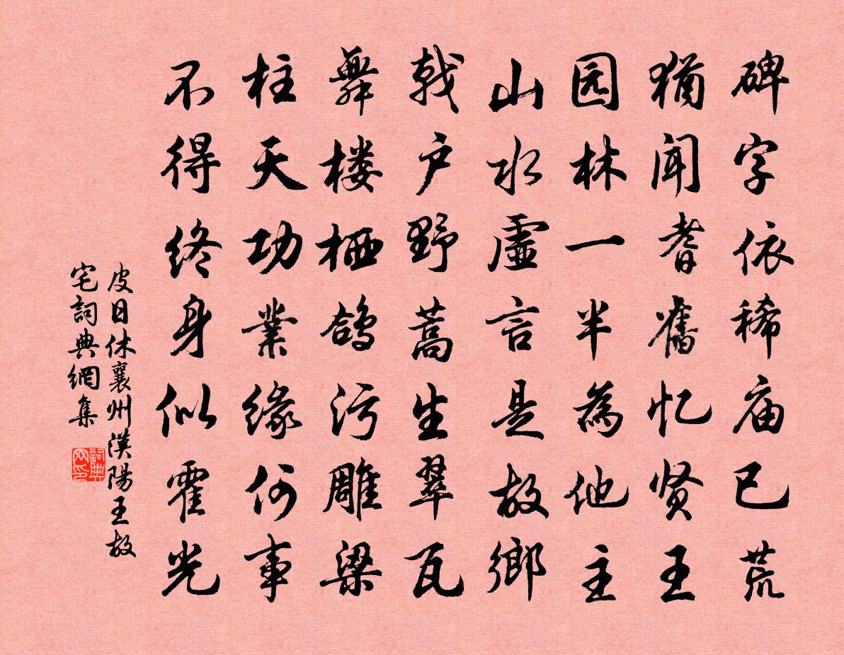 詩詞名句歷史字典書法欣賞書法字典國語詞典說文解字康熙字典古漢語字典標 題 作 者 詩 句 襄州漢陽王故宅作者:皮日休 朝代:唐代襄州漢陽王故宅原文碑字依稀廟已荒,猶聞耆舊憶賢王。園林一半為他主,山水虛言是故鄉。戟戶野蒿生翠瓦,舞樓棲鴿污雕梁。柱天功業緣何事,不得終身似霍光。詩詞問答問:襄州漢陽王故宅的作者是誰?答:皮日休問:襄州漢陽王故宅寫於哪個朝代?答:唐代問:襄州漢陽王故宅是什麼體裁?答:七律皮日休襄州漢陽王故宅書法欣賞襄州漢陽王故宅書法作品注釋全唐詩:卷613-12詩詞推薦點絳唇 越山見梅吳文英〔宋代〕春未來時,酒攜不到千岩路。瘦還如許。晚色天寒處。無限新愁,難對風前語。行人去。暗消春素。橫笛空山暮。浪淘沙李萊老〔宋代〕榆火換新煙。翠柳朱檐。東風吹得落花顛。簾影翠梭懸繡帶,人倚鞦韆。猶憶十年前。西子湖邊。斜陽吹入畫樓船學門肇開為諸兄弟劉宰〔宋代〕幾年黌宇傍城隈,禮樂文章蔽草萊。逵道一朝隨地辟,宮牆數仞倚天開。舉頭日月清光近,入眼湖山秀氣來。寄語初晴王安石〔宋代〕幅巾慵整露蒼華,度隴深尋一徑斜。小雨初晴好天氣,晚花殘照野人家。擬寒山拾得二十首王安石〔宋代〕李生場蕩蕩,所見實奇哉。問渠前世事,答我燒炭來。炭成能然火,火過卻成灰。灰成即是土,隨意立根栽。嘉熙丁酉七月上游大滌題住山龔沖妙艮泓軒吳泳〔宋代〕舊與清泉白石盟,身閒方作洞霄行。青山延客元無鎖,碧澗流花似有情。古洞欲隨仙隱去,高岡終待鳳來鳴。道人【雙調】沉醉東風關漢卿〔元代〕伴夜月銀箏鳳閒,暖東風繡被常慳。信沉了魚,書絕了雁,盼雕鞍萬水千山。本利對相思若不還,則告與那能索債獻主司孟賓於〔唐代〕那堪雨後更聞蟬,溪隔重湖路七千。憶昔故園楊柳岸,全家送上渡頭船。修竹為王俊卿園正賦所居也姜特立〔宋代〕入門見修竹,茲士已可人。不必問寒溫,使可飲清醇。此興諒不淺,此意亦已真。安得王子猷,相與共卜鄰。滿江紅(壽太守·四月三十)梁大年〔宋代〕九十炎光,又過了、三分之一。記當年光際,誕生良弼。崧岳降神鍾秀氣,孕成間世真英傑。妙文章、拾芥立功名過昭武訪李友山詩社諸人戴復古〔宋代〕吟過長亭復短亭,喜於溪上訪詩朋。雕鎪已被天公怒,狂狷仍遭俗子憎。故故愁人長夜雨,明明照我短檠燈。休思句王隨〔宋代〕梧桐風細初吹葉,河漢雲疏欲護霜。登郡前山羊士諤〔唐代〕洛陽歸客滯巴東,處處山櫻雪滿叢。峴首當時為風景,豈將官舍作池籠。箕山操楊維楨〔元代〕箕之山兮可耕而樵,箕之水兮可飲而游。牽牛何來兮飲吾上流,彼以天下讓兮我以之逃。世豈無堯兮應堯之求,吾送伊闕王大夫歌司馬光〔宋代〕於嗟古之道邈即遠兮,日陵夷而就衰。群儒角逐異端競進兮,聖塗榛枳幽昧而難知。君獨恥從眾人之後兮,軒然高病中追賦游武夷劉子翬〔宋代〕建水日夜淺,清灘自迢迢。漁舠愕已無,忽點淨練遙。老身寄其上,兀若棲危苕。松風知我狂,隨舷助傾搖。探幽行路難·其一李白〔唐代〕金樽清酒斗十千,玉盤珍羞直萬錢。(羞 通:饈;直 通 值)停杯投箸不能食,拔劍四顧心茫然。欲渡黃河冰蝶戀花·辛苦最憐天上月納蘭性德〔清代〕辛苦最憐天上月,一昔如環,昔昔都成玦。若似月輪終皎潔,不辭冰雪為卿熱。無那塵緣容易絕,燕子依然,軟踏十二時頌釋文準〔宋代〕日南午,理事相諳更相互。三門拈向燈籠頭,休問他家覓歸路。禱雨木欄堂四首陳造〔宋代〕絕知豐凶有數,豈必天地不仁。鵓鳩底用緘口,晨霞徒解欺人。名句推薦強攜酒、小橋宅,怕梨花落盡成秋色。姜夔《淡黃柳·空城曉角》 藍橋春雪君歸日,秦嶺秋風我去時。白居易《藍橋驛見元九詩》 不積小流,無以成江海。荀子《勸學》 夜來小雨新霽,雙燕舞風斜。万俟詠《訴衷情·送春》 采菱人語隔秋煙,波靜如橫練。王惲《平湖樂·采菱人語隔秋煙》 花開不並百花叢,獨立疏籬趣未窮。鄭思肖《畫菊》 為害常因不察,致禍歸於不忍。來俊臣《羅織經·閱人卷第一》 見人惡,即內省。有則改,無加警。李毓秀《弟子規·信》 透內閣香風陣陣,掩重門暮雨紛紛。王實甫《十二月過堯民歌·別情》 三冬暫就儒生學,千耦還從父老耕。陸游《觀村童戲溪上》