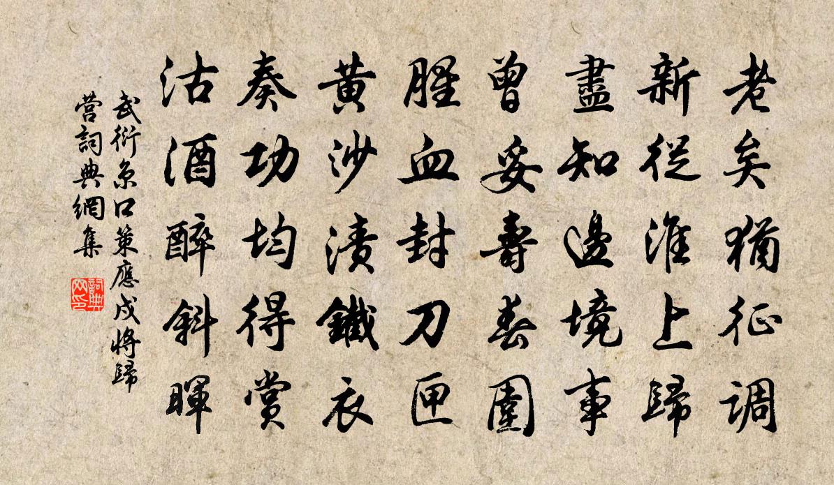詩詞名句歷史字典書法欣賞書法字典國語詞典說文解字康熙字典古漢語字典標 題 作 者 詩 句 京口策應戍將歸營作者:武衍 朝代:宋代京口策應戍將歸營原文老矣猶徵調,新從淮上歸。盡知邊境事,曾妥壽春圍。腥血封刀匣,黃沙漬鐵衣。奏功均得賞,沽酒醉斜暉。詩詞問答問:京口策應戍將歸營的作者是誰?答:武衍問:京口策應戍將歸營寫於哪個朝代?答:宋代武衍京口策應戍將歸營書法欣賞京口策應戍將歸營書法作品詩詞推薦和靖圖唐寅〔明代〕約閣江梅遠近山,一天風月繞柴關。休言鳥斷人絕,覓句逋仙正不閒。漁家傲 西方樂梵琦〔元代〕聽說西方無量樂。三賢十聖同依託。稽首彌陀圓滿覺。長參學。川流赴海塵成岳。佛性在躬如玉璞。須憑巧匠勤雕聞五月八日宸翰口號十首劉克莊〔宋代〕喜孝肅才令次對,攜明逸手與同登。臣於二老非儔匹,慚愧虛加學士稱。送趙子昂方回〔宋代〕文賦早知名,君今陸士衡。真能辨龍鮓,未可忘蓴羹。剩喜修途辟,深防俗目驚。時聞黃耳信,緩步取公卿。次韻子文客舍小樓范成大〔宋代〕客里仍攜一束書,閉門虹氣自凌虛。未聞光范延珠履,誰向甘泉從玉車。散盡生涯千答布,收將文價百車渠。淹留愁倚欄/春光好佚名〔宋代〕冰肌玉骨精神。不風塵。昨夜窗前都折盡,忽疑君。清淚拂拂沾巾。誰相念、折贈芳春。羌管休吹別塞曲,有人聽桂殿秋佚名〔宋代〕漓獸石,錯虬松。黛嵐終日下天風。杖藜攜我恣遙望,縹緲霓裳飛碧空。臨平湖顧況〔唐代〕采藕平湖上,藕泥封藕節。船影入荷香,莫沖蓮柄折。畏人杜甫〔唐代〕早花隨處發,春鳥異方啼。萬里清江上,三年落日低。畏人成小築,褊性合幽棲。門徑從榛草,無心走馬蹄。冬夜對書卷有感陸游〔宋代〕人生如夢終當覺,世事非天孰可憑?萬卷雖多當具眼,一言惟恕可銘膺。所聞要足敵憂患,吾道豈其無廢興?白髮和陳丞題陽家洞張明中〔宋代〕溪繚飛虹聽不潺,山雕翠玉望來寒。門牆面水臨橋靜,今古無虞枕自安。桐帽棕鞋非巧偽,花朝月夕幾團欒。箇中念奴嬌(叔母生日劉左史光祖以余春時所與為壽詞韻見貺馥用韻謝之)魏了翁〔宋代〕夢中猶記,來時路、五馬踟躕攢立。江北城南春澹沲,山鎖一天晴日。伊軋徵車,徊徨去意,只有東風識。如今還嘲風范成大〔宋代〕紛紅駭綠驟飄零,痴騃封姨沒性靈。報導海棠方熟睡,也須留眼為渠青。漢詔郡縣行鄉飲酒禮頌詩洪遵〔宋代〕詠仁蹈德,駸駸措刑。舄弈千載,薰為太平。題釣台俞成〔宋代〕千古英風想子陵,釣台緣此幾人登。誰知避諱更嚴氏,灘與州名總誤稱。挽鄭通判陳宓〔宋代〕厚重公清譽藹然,人言端似楚公賢。為官不取橫科勢,佐郡何妨二十年。徐貌價通常不變,陽城撫字已先傳。雙旌宮詞王珪〔唐代〕六龍觀稼奉宸游,齊賀豐年蘆麥秋。後苑宴回卿相出,內官金合送來麰。蒲圻道中遇雪二首王炎〔宋代〕馬上寒生手欲龜,田廬人靜爨煙稀。疑逢海上雙銀闕,想見雲中萬玉妃。野店避風聊解轡,地爐圍火自熏衣。勞生人月圓 春日湖上 北曲聊樂府前集今張可久〔元代〕東風西子湖邊路,白髮強尋春。盡教年少,金鞭俊影,羅帕香塵。蹇驢破帽,荒池廢苑,流水閒雲。惱余歸思,花送潭州陸戶曹之任(戶曹自處州司倉除)歐陽詹〔唐代〕三語又為掾,大家聞屈聲。多年名下人,四姓江南英。衡岳半天秀,湘潭無底清。何言驅車遠,去有蒙莊情。名句推薦夜來疏雨鳴金井,一葉舞空紅淺。王月山《齊天樂·夜來疏雨鳴金井》 靜夜沉沉,浮光靄靄,冷浸溶溶月。丘處機《無俗念·靈虛宮梨花詞》 天與三台座,人當萬里城。張九齡《奉和聖制送尚書燕國公赴朔方》 風吹仙袂飄颻舉,猶似霓裳羽衣舞白居易《長恨歌》 胡風吹代馬,北擁魯陽關。李白《豫章行》 黃河落天走東海,萬里寫入胸懷間。李白《贈裴十四》 從今後,夢魂千里,夜夜岳陽樓。徐君寶妻《滿庭芳·漢上繁華》 日永如年愁難度,高城回首,暮雲遮盡,目斷人何處惠洪《青玉案·絲槐煙柳長亭路》 斜陽草樹,尋常巷陌,人道寄奴曾住。辛棄疾《永遇樂·京口北固亭懷古》 疏條交映,有時見日。吳均《與朱元思書》