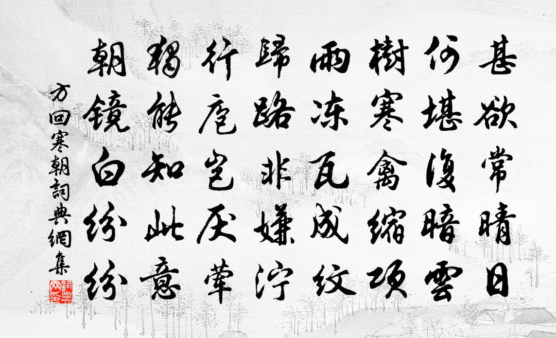 詩詞名句歷史字典書法欣賞書法字典國語詞典說文解字康熙字典古漢語字典標 題 作 者 詩 句 寒朝作者:方回 朝代:宋代寒朝原文甚欲常晴日,何堪復暗雲。樹寒禽縮項,雨凍瓦成紋。歸路非嫌濘,行庖豈厭葷。獨能知此意,朝鏡白紛紛。詩詞問答問:寒朝的作者是誰?答:方回問:寒朝寫於哪個朝代?答:宋代方回寒朝書法欣賞寒朝書法作品詩詞推薦一晝千萬思曾鞏〔宋代〕一晝千萬思,一夜千萬愁。晝思復夜愁,晝夜千萬秋。故人遠為縣,海邊勾踐州。故人道何如,不間也與周。我如隨鳳翔有何日在堤霜後路亂飛榆柳踏平沙之句鄭剛中〔宋代〕沐雨抗塵幾萬里,勞生令我憶山家。秋風小艇浮棋局,野色侵簾水見沙。晚自朝台津至韋隱居郊園許渾〔唐代〕秋來鳧雁下方塘,系馬朝台步夕陽。村徑繞山松葉暗,野門臨水稻花香。雲連海氣琴書潤,風帶潮聲枕簟涼。西下頌證道歌證道歌釋印肅〔宋代〕入深山,住蘭若,離色離聲無晝夜。撞鐘擊鼓不知鳴,地轉天回全不怕。借車孟郊〔唐代〕借車載家具,家具少於車。借者莫彈指,貧窮何足嗟。百年徒役走,萬事盡隨花。頌古三十二首釋明辯〔宋代〕蘿蔔頭禪聒噪人,霜刀累切了無痕。自古不通人咬嚼,只容衲子鶻崙吞。送林一甫試浙漕二首陳杰〔宋代〕偶題熟紙光浮桂,漫遣生綃色染藍。入手功名如此耳,人間看北會成南。錢道人不飲酒食肉囊中不畜一錢所須飯及草屨陸游〔宋代〕萬里飄如不繫船,空囊短褐過年年。食時無飯芒鞋破,只向街頭旋乞錢。聽霜鍾戴叔倫〔唐代〕寥亮來豐嶺,分明辨古鐘。應霜如自擊,中節每相從。靜聽非閒扣,潛應蘊聖蹤。風間時斷續,雲外更舂容。虛警二月八日二首劉克莊〔宋代〕百骸豈久堅牢者,兩曜寧逃薄蝕哉。有玉斧修圓復闕,無金篦刮膜難開。坐跏趺榻塵慵掃,手校讎書記不來。辜負送曾谹父還朝十首曹勛〔宋代〕老來百事大關身,惟有芳醪意甚真。憶著碧琳相覓去,問梅期醉水南春。【中呂】迎仙客_感舊鸚鵡洲張可久〔元代〕感舊鸚鵡洲,鳳凰樓,十年故人懷舊遊。杜陵花,陶令酒,酒病花愁,不覺的今春瘦。湖上送別釣錦鱗,棹紅雲,初出燕山樓鑰〔宋代〕去國三千里,還家第一程。都緣人意樂,便覺馬蹄輕。落日催心速,飛雲逐望生。莫嫌歸去晚,猶得趁清明。次前人為余置酒邑廳見示陳著〔宋代〕公事無多白日閒,笑談風月傲方千。馬鞍雖少難供賦,突兀南山翠撲鞍。送小師元賁釋重顯〔宋代〕愧爾求師,為吾弟子。學雖無聞。道亦可擬。平飛辯月,照複流水。斯意斯言兮如不忘,行行拂拂兮步蘭芷。發孔鎮晨炊漆橋道中紀行十首楊萬里〔宋代〕不但秋原雨冒田,坐看平地路成川。隔田山下青松外,不見人家只見煙。和絳台王都官見寄春日書事之什魏野〔宋代〕絳郡政閒聞,人家可閉門。馬嘶花下路,犬睡月中村。吏亦擎書卷,民皆挈酒樽。竹春思隱逸,多謝動吟魂。經故太尉段公廟許渾〔唐代〕靜想追兵緩翠華,古碑荒廟閉松花。紀生不向滎陽死,爭有山河屬漢家。頌十玄談心印釋印肅〔宋代〕歷劫坦然無異色,東西何立誰南北。若言別有一靈光,認子不真元是賊。歸宜興,留題竹西寺三首蘇軾〔宋代〕道人勸飲雞蘇水,童子能煎鶯粟湯。暫借藤慶與瓦枕,莫教辜負竹風涼。名句推薦殘月出門時,美人和淚辭。韋莊《菩薩蠻·紅樓別夜堪惆悵》 言必信,行必果。孔子弟子《論語·子路篇》 叩枻長歌,嫦娥欲下,萬里揮冰雪。趙秉文《大江東去·用東坡先生韻》 梧桐真不甘衰謝,數葉迎風尚有聲。張耒《夜坐·庭戶無人秋月明》 居軒冕之中,不可無山林的氣味;處林泉之下,須要懷廊廟的經綸。洪應明《菜根譚·概論》 戲馬台南山簇簇,山邊飲酒歌別曲。張籍《送遠曲》 長江春水綠堪染,蓮葉出水大如錢。張籍《春別曲》 佳人亦何念,淒斷陽關曲。蘇軾《送頓起》 有美一人,清揚婉兮。佚名《野有蔓草》 言之易,行之難呂不韋《呂氏春秋·論·不苟論》