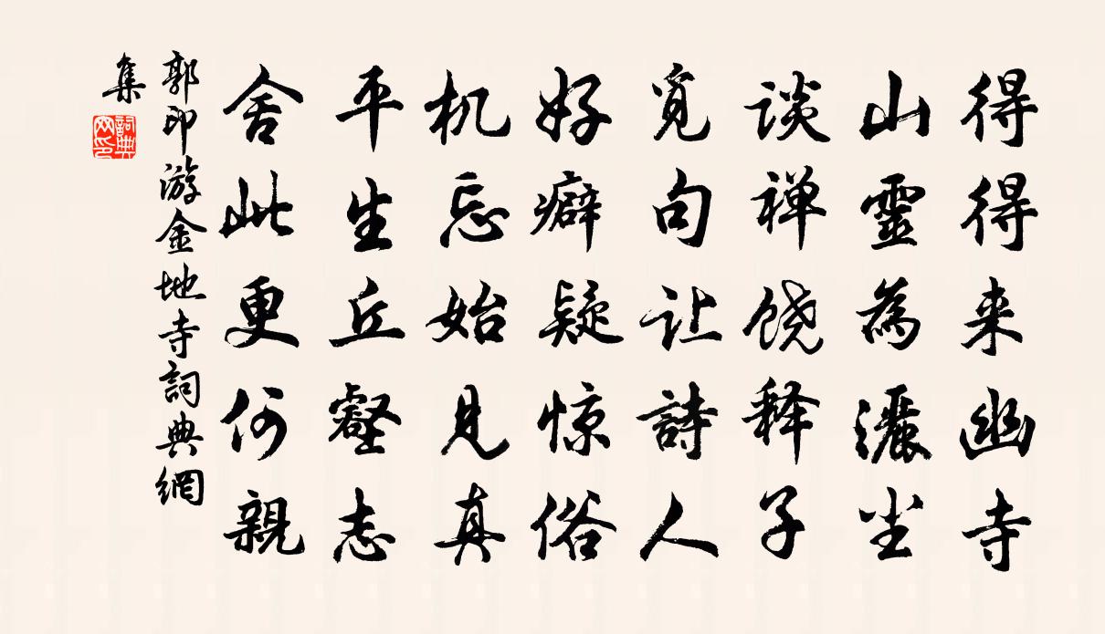 詩詞名句歷史字典書法欣賞書法字典國語詞典說文解字康熙字典古漢語字典標 題 作 者 詩 句 游金地寺作者:郭印 朝代:宋代游金地寺原文得得來幽寺,山靈為灑塵。談禪饒釋子,覓句讓詩人。好癖疑驚俗,機忘始見真。平生丘壑志,舍此更何親。詩詞問答問:游金地寺的作者是誰?答:郭印問:游金地寺寫於哪個朝代?答:宋代郭印游金地寺書法欣賞游金地寺書法作品詩詞推薦登胥山贈長老淨曇二首張嵲〔宋代〕詩律遙追粲可流,安禪總不礙聞修。勸君著意搜新句,準擬他年有惠休。念奴嬌佚名〔宋代〕今年秋早,似常年、人世光陰如電。君看老仙風度別,綠髮芳瞳長健。細數平生,三千功行,一一修持遍。通明殿和曼叔賦斷蓬見別韓維〔宋代〕霜蓬飛無根,歲暮隨驚風。翻翻走寒野,日以去故叢。譬如遠遊子,飄泊從西東。一感潁上別,慨嘆發予衷。覽中丞尚書譙陳二郡新詩宋祁〔宋代〕自頃辭台路,陪京擁使珂。遺音追正始,新韻遍中和。贈答劉公數,登臨叔子多。腸回初有感,耳熱遂成歌。驚夢禪人並化主寫真求贊釋正覺〔宋代〕目深額聳,口方鼻端。秋雲消兮天青而闊,夜月上兮水白而寒。看看,影像隨應兮明珠走盤。送僧南遊吳融〔唐代〕戰鼙鳴未已,瓶屨抵何鄉?偶別塵中易,貪歸物外忙。後蟬拋鄠杜,先雁下瀟湘。不得從師去,殷勤謝草堂。晝夜樂(二之二·中呂宮)柳永〔宋代〕秀香家住桃花徑。算神仙、才堪並。層波細翦明眸,膩玉圓搓素頸。愛把歌喉當筵逞。遏天邊,亂雲愁凝。言語似挽蔡西山先生曾極〔宋代〕天子中年後,名家信有初。身罹鉤黨禍,學稿啟蒙書。木直宜行伐,蘭芳竟自鋤。首陽千駟馬,後世定何如。董侍郎生日三首魏了翁〔宋代〕紫氣飛騫一馬驄,當年輕下五雲東。詩書意味江都相,琴鶴規模清獻公。長嘯驅風靜秋戍,精神喚雨作年豐。列城水調歌(題弩社頭籌簇)程節齋〔宋代〕都尉部千弩,舊事漢材官。連拳一臂三石,夜半破陰山。曾使中有捫足,造次摧堅挫銳,分白辱寵涓。省括一機耳次韻趙賓暘見寄長句方回〔宋代〕百憂攻心成白首,不少自寬死已久。我初作郡猶未貧,□□比□□□□。立夏奉祀太一宮劉筠〔宋代〕舜柏森森拂絳霄,薰風瑟瑟動雲璈。琳房遍設沉榆席,金檠齊燃綠桂膏。秘冊十行開鳳檢,靈輝三燭駐霓旄。香飄臘八日夜直曾國藩〔清代〕翻從官宿得閒時,仙掖深深晝掩帷。靜向古人書易入,寒偏今日酒堪持。濃饘說獻宮中佛,晴雪看分禁里墀。日暮同吳王送杜秀芝赴舉入京李白〔唐代〕秀才何翩翩,王許回也賢。暫別廬江守,將游京兆天。秋山宜落日,秀水出寒煙。欲折一枝桂,還來雁沼前。臨終偈釋行元〔宋代〕來亦無所從,去亦無所至。來去既一如,春風滿天地。寄暢當李端〔唐代〕麥秀草芊芊,幽人好晝眠。雲霞生嶺上,猿鳥下床前。顏子方敦行,支郎久住禪。中林輕暫別,約略已經年。春暮思平泉雜詠二十首西嶺望鳴皋山李德裕〔唐代〕高秋對涼野,四望何蕭瑟。遠見鳴皋山,青峰原上出。晨興採薇蕨,向暮歸蓬蓽。詎假數揮金,餐和養余日。減字木蘭花王觀〔宋代〕三皇五帝。古代英雄閒爭氣。勇猛韓彭。十大功勞空有名。休談人我。大限催煎如何嚲。前酌觥舡。祝壽如同海月華山張喬〔唐代〕青蒼河一隅,氣狀杳難圖。卓傑三峰出,高奇四岳無。力疑擎上界,勢獨壓中區。眾水東西走,群山遠近趨。天回寶學連公輓詩二首李彌遜〔宋代〕弱冠論交老更堅,平生風義想前賢。銀峰告政一千里,雁塔聯名四十年。漫許赤心酬雨露,終成白髮傲林泉。酸風名句推薦憶對中秋丹桂叢。花在杯中。月在杯中。辛棄疾《一剪梅·中秋元月》 論如析薪,貴能破理。劉勰《文心雕龍·論說》 黃河九天上,人鬼瞰重關。元好問《水調歌頭·賦三門津》 意內稱長短,終身荷聖情。杜甫《端午日賜衣》 世事茫茫難自料,春愁黯黯獨成眠。韋應物《寄李儋元錫》 玄都觀里桃千樹,儘是劉郎去後栽。劉禹錫《元和十年自朗州至京戲贈看花諸君子 / 玄都觀桃花》 溪雲初起日沉閣,山雨欲來風滿樓。許渾《鹹陽城東樓 / 鹹陽城西樓晚眺 / 西門》 西門秦氏女,秀色如瓊花。李白《秦女休行》 重幃深下莫愁堂,臥後清宵細細長。李商隱《無題·重幃深下莫愁堂》 違山十里,蟪蛄之聲,猶在於佚名《孔子家語·子路初見》