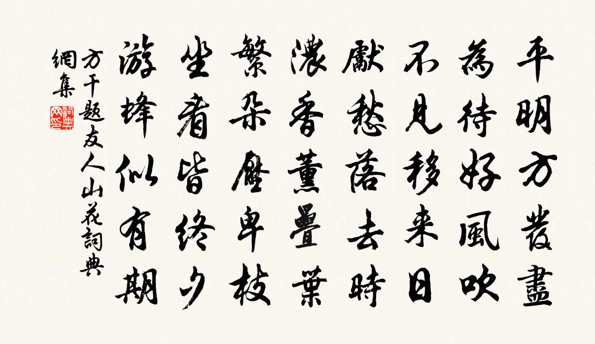 詩詞名句歷史字典書法欣賞書法字典國語詞典說文解字康熙字典古漢語字典標 題 作 者 詩 句 題友人山花作者:方乾 朝代:唐代題友人山花原文平明方發盡,為待好風吹。不見移來日,先愁落去時。濃香薰疊葉,繁朵壓卑枝。坐看皆終夕,游蜂似有期。詩詞問答問:題友人山花的作者是誰?答:方乾問:題友人山花寫於哪個朝代?答:唐代問:題友人山花是什麼體裁?答:五律方乾題友人山花書法欣賞題友人山花書法作品注釋全唐詩:卷649-31詩詞推薦鵲橋仙(歇指調)柳永〔宋代〕屆征途,攜書劍,迢迢匹馬東去。慘離懷,嗟少年易分難聚。佳人方恁繾綣,便忍分鴛侶。當媚景,算密意幽歡,紅林擒近·壽詞·滿路花陳允平〔宋代〕三萬六千頃,玉壺天地寒。庾嶺封的皪,淇園折琅玕。漠漠梨花爛漫,紛紛柳絮飛殘。直疑潢潦驚翻,斜風溯狂瀾句張先〔宋代〕但怪鱸鄉一旦成,分卻松江半秋色。園步雜興張鎡〔宋代〕懽意千年孰與齊,恰如穉子候門時。八旬半載爭多少,匹似淵明已較遲。踏莎行盧炳〔宋代〕雅淡容儀,溫柔情性。偏伊賦得多風韻。明眸剪水玉為肌,鳳鞋弓小金蓮襯。相見雖頻,歡娛無定。蠻箋寫了憑誰賈天錫惠寶薰乞詩多以兵衛森畫戟燕寢凝清香黃庭堅〔宋代〕險心游萬仞,躁欲生五兵。隱几香一炷,露台湛空明。一枝花劉志淵〔元代〕玉壺金世界。日月同光彩。仙童為活計、戀風采。覓藥川源,日日西南采。收拾歸碧海。始結金晶,九變還元不壞曉上人還浙東釋法平〔宋代〕鳥宿柴門靜,更深別意傾。孤燈寒有暈,細雨夜無聲。渡曉人爭立,潮平櫓亂鳴。君今成獨往,老罷苦為情。八月八日發潭州後得絕句四十首趙蕃〔宋代〕一年風月屬中秋,今昔相傳無異流。定自天公亦興此,故教雨腳破雲頭。東林寺再遇僧益大德韋莊〔唐代〕見師初事懿皇朝,三殿歸來白馬驕。上講每教傾國聽,承恩偏得內官饒。當時可愛人如畫,今日相逢鬢已凋。若向摸魚兒王哲〔元代〕嘆骷髏、臥斯荒野。伶仃白骨瀟灑。不知何處遊蕩子,難辨女男真假。拋棄也。是前世無修,只放猿兒傻。今生墮夏日南軒陳深〔宋代〕羔水軒窗宜夏居,夜涼如水似和初。科頭枕石臥明月,仰面迎風看太虛。好事近佚名〔宋代〕更一聲啼鳥。從宋憲登萬景樓晁公溯〔宋代〕勝地熊開傑觀,熊大川壯重關。使者領我來,共此須臾閒。玉節照綠野,銀熊落青綸。酒酣望八極,氣豪吞百蠻。句張夏〔宋代〕疇庸國邑開。田舍雜興懷長兄四首廖行之〔宋代〕少休廛市喧囂耳,來聽田農應和歌。畟畟耕疇皆帝力,欣欣時物自天和。山雲亭午半未斂,溪雨黃昏清更多。但得贈劉琨詩二十首 四盧諶〔魏晉〕王室喪師。私門播遷。望公歸之。視險忽艱。茲願不遂。中路阻顛。仰悲先意。俯思身愆。菩薩蠻(述古席上)蘇軾〔宋代〕娟娟缺月西南落。相思撥斷琵琶索。枕淚夢魂中。覺來眉暈重。華堂堆燭淚。長笛吹新水。醉客各西東。應思陳孟虞兵級宥康永年未六十一日相繼力求歸農余因吳芾〔宋代〕仕宦老不休,虞兵乃知止。低頭愧斯人,三嘆不能已。江西道院集戊申四月九日得請補外初出國門宿楊萬里〔宋代〕出卻金宮入梵宮,翠微綠霧染衣濃。三年不識西湖月,一夜初聞南澗鍾。藏室蓬山真昨戲,園翁溪友得今從。若非名句推薦荷風送香氣,竹露滴清響。孟浩然《夏日南亭懷辛大》 德者才之主,才者德之奴。洪應明《菜根譚·概論》 君子以行言,小人以舌言佚名《孔子家語·顏回》 金陵子弟來相送,欲行不行各盡觴。李白《金陵酒肆留別》 侵陵雪色還萱草,漏泄春光有柳條。杜甫《臘日》 東風惡,歡情薄。陸游《釵頭鳳·紅酥手》 古岩泉滴滴,幽谷鳥關關。令狐楚《賦山 / 一七令·山》 東風灑雨露,會入天地春。李白《送郄昂謫巴中》 秋風吹地百草乾,華容碧影生晚寒。李賀《開愁歌》 一生之內, 當無愧古人姚察、姚思廉《梁書·列傳·卷二十九》