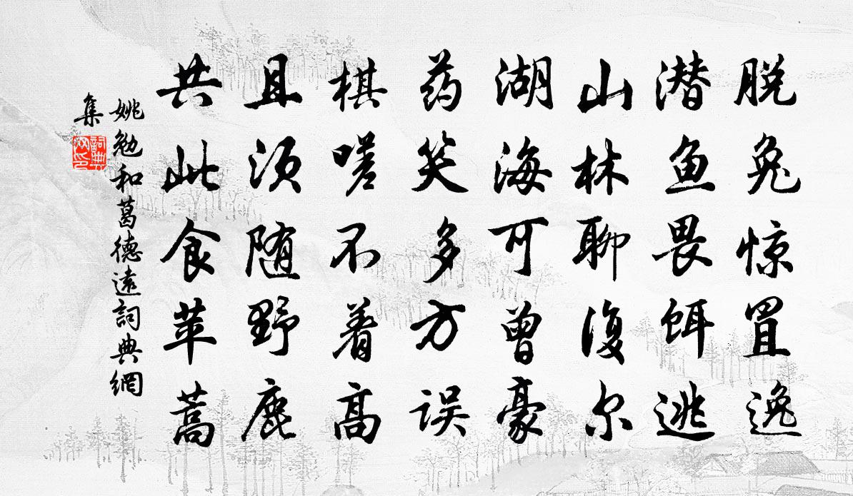 詩詞名句歷史字典書法欣賞書法字典國語詞典說文解字康熙字典古漢語字典標 題 作 者 詩 句 和葛德遠作者:姚勉 朝代:宋代和葛德遠原文脫兔驚罝逸,潛魚畏餌逃。山林聊復爾,湖海可曾豪。藥笑多方誤,棋嗟不著高。且須隨野鹿,共此食苹蒿。詩詞問答問:和葛德遠的作者是誰?答:姚勉問:和葛德遠寫於哪個朝代?答:宋代姚勉和葛德遠書法欣賞和葛德遠書法作品詩詞推薦寄趙紫芝徐照〔宋代〕頻年游闕下,近日喜言歸。及我成行役,與君還別離。夢長忘路遠,計拙任人非。楊柳塘何處,要看題壁詩。齊謝朏孫元晏〔唐代〕解璽傳呼詔侍中,卻來高臥豈疏慵。此時忠節還希有,堪羨君王特地容。村女陸游〔宋代〕白襦女兒系青裙,東家西家世通婚。採桑餉飯無百步,至老何曾識別村!荒村倪瓚〔元代〕踽踽荒村客,悠悠遠道情。竹梧秋雨碧,荷芰晚波明。穴鼠能人拱,池鵝類鶴鳴。蕭條阮遙集,幾屐了餘生?真珠簾(壽元春兄八十策)陳著〔宋代〕如梅在壑清標格。襟懷好、又是融融春拍。鴛夢早驚飛,慣一窗岑寂。譜曲裁詩心自在,任雪月、風花需索。奇特用前韻謝吳知府釋寶曇〔宋代〕聞道江南庾子山,新詩脫手意長閒。未嘗臨鏡嗟遲暮,更約何人共往還。我有茅茨依橘柚,自憐風雨竄荊蠻。悲歡吳子野絕粒不睡過作詩戲之芝上人陸道士皆和蘇軾〔宋代〕聊為不死五通仙,終了無生一大緣。獨鶴有聲知半夜,老蠶不食已三眠。憐君解比人間夢,許我時逃醉後禪。會與同仲達雪後踰小山游蔡氏園得紅梅數枝奇絕因張耒〔宋代〕與君陟巘踏春泥,邂逅紅梅得一枝。失卻孤山風露格,卻成卯酒醉冰肌。奉和景純十四丈三絕王安石〔宋代〕身先諸老斡樞機,再見王門闔左扉。但恨東歸相值晚,豈知臨別更心違。病後謝友人顧問黃庚〔宋代〕索居坐孤陋,卻掃甘隱淪。荒徑無轍跡,蓬藋方蓁蓁。風雨撼四壁,一榻寄屈伸。誰念相如病,豈堪原憲貧。友人和劉過夏蟲五詠蛙孫應時〔宋代〕將軍鼓吹來,處乾非所喜。夸汝風月夕,天籟鳴悄已。汝姑勿自誇,坎井不可恃。當知馬伏波,笑殺公孫子。我思何所在李群玉〔唐代〕我思何所在,乃在陽台側。良宵相望時,空此明月色。歸魂泊湘雲,飄蕩去不得。覺來理舟楫,波浪春湖白。煙光伯父《送先人下第歸蜀》詩云︰人稀野店休安蘇軾〔宋代〕月明穿破裘,霜氣澀孤劍。歸來閉戶坐,默數來時店。贈江西詩客吳晦之〔宋代〕五言詩作七寶塔,四壁惟餘八尺床。一月二十九日醉,百年三萬六千場。閒居多暇追敘舊遊成一百十韻釋文珦〔宋代〕予生駑且鈍,良御謾加鞭。蹇步常居後,長途靡克前。於焉辭里塾,竟爾向林泉。魯誥方擩嚌,真乘又賾研。孳孳頌一百則釋重顯〔宋代〕雙收雙放若為宗,騎虎由來要絕功。笑罷不知何處去,只應千古動悲風。郊廟歌辭。祀九宮貴神樂章。福和佚名〔唐代〕祀既雲畢,明靈告旋。禮洽和應,神歆福延。動植鹹若,陰陽不愆。錫茲純嘏,天子萬年。天寧樂(銅人捧露盤引)賀鑄〔宋代〕斗儲祥,虹流祉,兆黃虞。未□□、□聖真符。千齡葉應,九河清、神物出龜圖。□□□□,□盛時、朝野歡娛。哭秘書彭止所文天祥〔宋代〕人物孤中秘,神山返異仙。目穿陪紼處,夢斷曝書年。玉質應無死,韋編豈不傳。奠芻和淚遣,此月向誰圓。習字乾隆〔清代〕間日視閣章,山莊有清暇,有暇亦何為,讀書及習射。書亦六藝一,自古重墨稼,棐幾鋪玉版,嘉蔭就松架。繕性名句推薦滿隄芳草不成歸,斜日畫橋煙水冷。吳翌鳳《玉樓春·空園數日無芳信》 瞿塘嘈嘈十二灘,此中道路古來難。劉禹錫《竹枝詞九首·其七》 秦樓月,年年柳色,灞陵傷別。李白《憶秦娥·簫聲咽》 丈夫不能再辱。班固《漢書·傳·李廣蘇建傳》 法不仁,不可以為法。墨子《墨子·04章 法儀》 今夜月明江上、酒初醒。黃庭堅《南歌子·槐綠低窗暗》 不剪春衫愁意態。過收燈、有些寒在。史達祖《夜行船·正月十八日聞賣杏花有感》 春水碧於天,畫船聽雨眠。韋莊《菩薩蠻·人人盡說江南好》 念去去,千里煙波,暮靄沉沉楚天闊。柳永《雨霖鈴·寒蟬淒切》 死別已吞聲,生別常惻惻。杜甫《夢李白二首·其一》