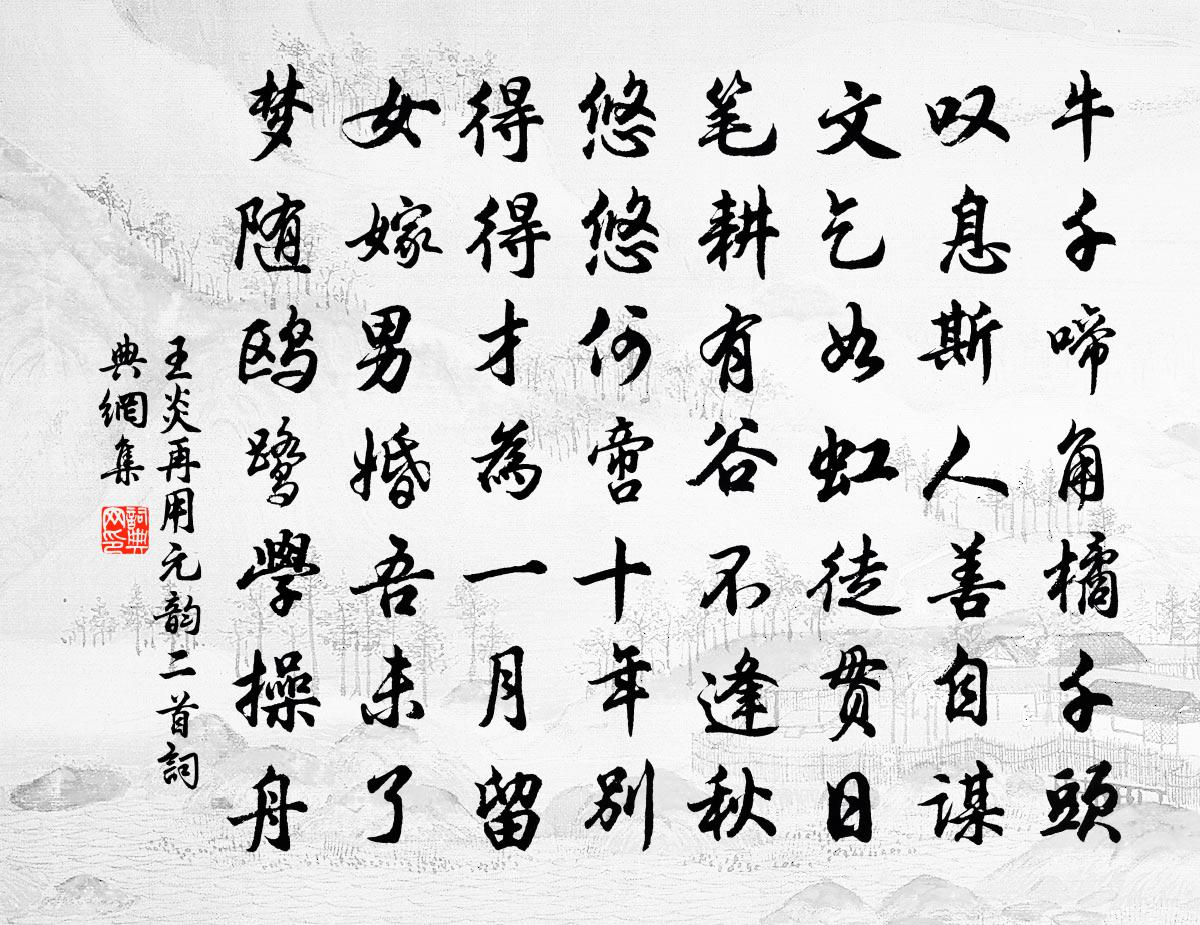 詩詞名句歷史字典書法欣賞書法字典國語詞典說文解字康熙字典古漢語字典標 題 作 者 詩 句 再用元韻二首作者:王炎 朝代:宋代再用元韻二首原文牛千啼角橘千頭,嘆息斯人善自謀。文乞如虹徒貫日,筆耕有谷不逢秋。悠悠何啻十年別,得得才為一月留。女嫁男婚吾未了,夢隨鷗鷺學操舟。詩詞問答問:再用元韻二首的作者是誰?答:王炎問:再用元韻二首寫於哪個朝代?答:宋代王炎再用元韻二首書法欣賞再用元韻二首書法作品詩詞推薦送沈寺丞知南昌縣司馬光〔宋代〕長江湛湛帶楓林,古木寒雲縣寺深。老吏不能容狡獪,細民無復有冤侵。洪崖丹井聞猶在,徐孺衡門說可尋。寧復酬談少府李白〔唐代〕一尉居倏忽,梅生有仙骨。三事或可羞,匈奴哂千秋。壯心屈黃綬,浪跡寄滄洲。昨觀荊峴作,如從雲漢游。老夫殘句:草屨布裘輕紫綬王禹偁〔宋代〕草屨布裘輕紫綬,角冠紗帽換朝簪。春晚樓上賀鑄〔宋代〕楊華吹復盡,春色但茫茫。獨立西樓上,持情向夕陽。小桃源李白〔唐代〕黟縣小桃源,煙霞百裡間。地多靈草木,人尚古衣冠。市向晡前散,山經夜後寒。 題桂籍姚勉〔宋代〕年來文物盛江西,捷幟聯翩報錦溪。好把香名題此籍,此題已兆杏園題。飲酒 其一陶淵明〔魏晉〕衰榮無定在,彼此更共之。邵生瓜田中,寧似東陵時!寒暑有代謝,人道每如茲。達人解其會,逝將不復疑;忽與挽參與蔡公三首劉克莊〔宋代〕蔡公遂委篤,朝野共噓欷。子不稅冕去,王將以袞歸。風濤如此急,人物眇然稀。自古難全傳,今無一可譏。讀經孟郊〔唐代〕垂老抱佛腳,教妻讀黃經。經黃名小品,一紙千明星。曾讀大般若,細感肸蠁聽。當時把齋中,方寸抱萬靈。忽復送陳世脩曾鞏〔宋代〕沙渚鴻飛入楚雲,遠林樵爨宿煙昏。娟娟野菊經秋淡,漠漠滄江帶雨渾。歸路賞心應駐節,客亭離思暫開樽。莫嗟送季明府赴太平粹戴復古〔宋代〕黃岩號難治,能者治何難。桃李民心悅,風霜吏膽寒。公行無不可,私請莫相干。三尺兒童輩,皆知好長官。依韻恭和聖制俯同太師文彥博玉津園賜宴席上王珪〔唐代〕上苑張瑤席,春風萬象新。誰知卦冠客,曾是釣璜人。感遇歸真主,勳勞念老臣。曲成雙鳳舞,酒入百花醇。日月次韻吳興李行中秀才見寄並求醉眠亭詩二首蘇轍〔宋代〕才堪簿領更無餘,贏得十年閒讀書。寵辱何須身自試,窮愁不待酒驅除。故人歸去無訊息,佳句新來屢卷舒。前日讀陸雲西志供定城墓有感書呈子勉總乾三首釋道璨〔宋代〕一艇東來公已仙,午天花柳為誰妍。深培根本存生意,把握春風有阿連。雙魚花朱翌〔宋代〕物生本不同,所貴以形似。如何小草間,或作潛淵類。宛然花葉分,有此尾鬣備。如以柳貫腮,十百共一蒂。可肩御史中丞秦公靖康小雅〔宋代〕天崩地陷,革我洪圖。孰敢爭之,維時醇儒。祈復明辟,義在捐軀。猛虎垂涎,遂捋其須。驪龍不睡,乃探其珠。嘆逝賦陸機〔魏晉〕昔每聞長老追計平生同時親故,或凋落已盡,或僅有存者。餘年方四十,而懿親戚屬,亡多存寡;昵交密友,亦不句歐陽炯〔唐代〕古人重到今人愛,萬局都無一局同。和世弼中秋月詠懷黃庭堅〔宋代〕一年中秋最明月,也照貧家門戶來。清光適從人意滿,壺觴政為詩社開。秋空高明萬物靜,此時乃見天地性。廣文不顯名大檀越請偈釋慧遠〔宋代〕報應差殊事不同,勞生何用出樊籠。欲知自性天真佛,盡在朝昏一念中。名句推薦繡帳已闌離別夢,玉爐空裊寂寥香。馮延巳《浣溪沙·春到青門柳色黃》 美功不伐,貴位不善佚名《孔子家語·弟子行》 守身必謹嚴,凡足以戕吾身者宜戒之王永彬《圍爐夜話·第九八則》 向淺洲遠渚,亭亭清絕。張炎《疏影·詠荷葉》 階下青苔與紅樹,雨中寥落月中愁。李商隱《端居》 桃花洞,瑤台夢,一片春愁誰與共?和凝《天仙子·柳色披衫金縷鳳》 千里之行,始於足下。老子《老子·德經·第六十四章》 不信妾腸斷,歸來看取明鏡前。李白《長相思三首》 民力盡於無用,財寶虛於待客。墨子《墨子·05章 七患》 東風力,快將雲雁高送。吳文英《宴清都·送馬林屋赴南宮分韻得動字》