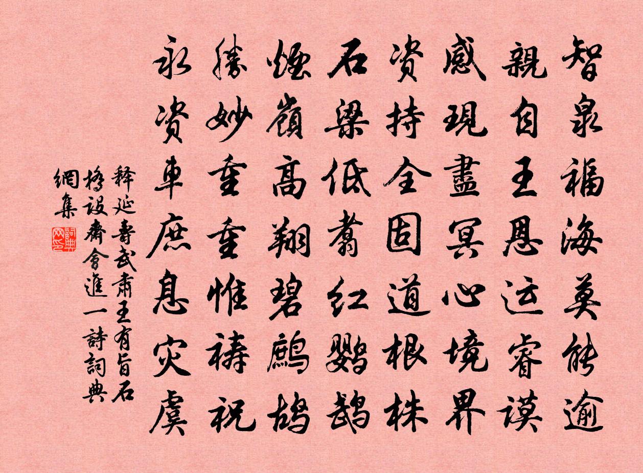 詩詞名句歷史字典書法欣賞書法字典國語詞典說文解字康熙字典古漢語字典標 題 作 者 詩 句 武肅王有旨石橋設齋會進一詩作者:釋延壽 朝代:宋代原文智泉福海莫能逾,親自王恩運睿謨。感現盡冥心境界,資持全固道根株。石樑低翥紅鸚鵡,煙嶺高翔碧鷓鴣。勝妙重重惟禱祝,永資車庶息災虞。詩詞問答問:《武肅王有旨石橋設齋會進一詩》的作者是誰?答:釋延壽問:該詩寫於哪個朝代?答:宋代書法欣賞武肅王有旨石橋設齋會進一詩書法作品詩詞推薦題釣雪圖趙蕃〔宋代〕空濛天外林,璀璨岸頭石。何許放舟回,寂然方自得。明禁忌蘇拯〔唐代〕陰陽家有書,卜築多禁忌。土中若有神,穴處何無祟。我識先賢意,本誡驕侈地。恣欲創樓台,率情染朱翠。四面晚興白居易〔唐代〕草淺馬翩翩,新晴薄暮天。柳條春拂面,衫袖醉垂鞭。立語花堤上,行吟水寺前。等閒消一日,不覺過三年,寄水竹胡仲弓〔宋代〕吳江江上望,平處少波濤。冬日思鱸鱠,天風落鳳毛。二難並四美,獨立仰三高。秀野曾招隱,清名不可逃。和季弟韻二十首劉克莊〔宋代〕且耕閒曠釣迷茫,風月佳時亦放狂。辟穀久從赤松子,對花幾換紫微郎。王何變晉為東晉,郊島催唐入季唐。此事木蘭花慢(社日有懷)嚴仁〔宋代〕東風吹霧雨,更吹起、袷衣寒。正莽莽叢林,潭潭伐鼓,鬱郁焚蘭。闌乾曲、多少意,看青煙如篆繞溪灣。桑柘綠和微之詩二十三首。和新樓北園偶集從孫公度…皆先歸白居易〔唐代〕聞君新樓宴,下對北園花。主人既賢豪,賓客皆才華。初筵日未高,中飲景已斜。天地為幕席,富貴如泥沙。嵇劉一叢花秦觀〔宋代〕年時今夜見師師。雙頰酒紅滋。疏簾半卷微燈外,露華上、煙裊涼風。簪髻亂拋,偎人不起,彈淚唱新詞。佳期。楊郎中新居和堯夫先生韻呂公著〔宋代〕高齋曠望極山川,卻顧卑居不值錢。二室峰巒凝畫碧,萬家樓閣帶輕煙。春濃繚繞環遊騎,地勝依稀寓列仙。唱發夜聲文同〔宋代〕秋風動衰草,摵摵響夜月。其下有鳴蛩,到曉啼不歇。乃知搖落時,眾籟自感發。安得苦吟人,不能為一{決冫換過金台天氣頓熱三首楊萬里〔宋代〕日曬船篷四面炊,幾時卻得出船時。江西未到何須恨,且到三衢也自奇。郡中白居易〔唐代〕鄉路音信斷,山城日月遲。欲知州近遠,階前摘荔枝。翻經台強至〔宋代〕失道從僧指,窮高聽鳥呼。千山四回抱,一徑百盤紆。人事空今昔,台基儻有無。吟邊嵐氣夕,落日伴猿狐。清明日欲宿石門,未到而風雨大作,泊靈星小楊萬里〔宋代〕峽山前夕石間行,泊得船時破膽驚。驚到今宵已無膽,聽風聽浪到天明。十六觀經頌中品中生釋遵式〔宋代〕若人至心一日夜,持戒持齋無破缺。以此功德回願生,七日華敷成記莂。過梅里七首家…今敝廬數堵猶存今列題於後。早梅橋李紳〔唐代〕早梅花,滿枝發。東風報春春未徹,紫萼迎風玉珠裂。楊柳未黃鶯結舌,委素飄香照新月。橋邊一樹傷離別,遊蕩偈頌一百四十一首釋師範〔宋代〕年年是好年,日日是好日。好事大家知,今朝正月一。拙叟釋文珦〔宋代〕拙叟百念無,眎身同木石。有客問生涯,笑指松與柏。客言人之生,當有資生策。縱曰遺聲利,其能去衣食。松柏緣識宋太宗〔宋代〕朱明日盛殘花卉,瓊苑爭游諠帝里。寶馬香車去復來,幾許人心歡不已,金明水上浮仙島,畫舸龍舟非草草。世寧點絳唇(趙育才席上用東坡韻贈歌者)楊無咎〔宋代〕小閣清幽,膽瓶高插梅千朵。主賓歡坐。不速還容我。換羽移宮,絕唱誰能和。伊知麽。暫聽些個。已覺絲成裹。名句推薦話須通俗方傳遠,語必關風始動人。馮夢龍《警世通言·卷十二》 末路驚風雨,窮邊飽雪霜文天祥《除夜》 沉憂能傷人,綠鬢成霜蓬。李白《怨歌行》 方以類聚,物以群分佚名《易傳·繫辭傳上·第一章》 滿則慮嗛,平則慮險,安則慮危荀子《荀子·仲尼》 有情不管別離久。情在相逢終有。晏幾道《秋蕊香·池苑清陰欲就》 應無所住而生其心。鳩摩羅什譯《金剛經·莊嚴淨土》 投我以桃,報之以李。佚名《抑》 歌鐘不盡意,白日落昆明。李白《經亂離後天恩流夜郎憶舊遊書懷贈江夏韋太守良宰》 悅其名而喪其實。尹文《尹文子·大道上》