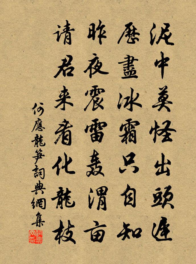 詩詞名句歷史字典書法欣賞書法字典國語詞典說文解字康熙字典古漢語字典標 題 作 者 詩 句 筍作者:何應龍 朝代:宋代筍原文泥中莫怪出頭遲,歷盡冰霜只自知。昨夜震雷轟渭畝,請君來看化龍枝。詩詞問答問:筍的作者是誰?答:何應龍問:筍寫於哪個朝代?答:宋代何應龍筍書法欣賞筍書法作品詩詞推薦再和廷邁洪咨夔〔宋代〕步障晴絲夾道青,土橋石磴向西坰。李烏奴宅空懷古,武阿婆祠懶乞靈。杜宇一聲猶客路,白雲萬里是親庭。只應溫泉羅鄴〔唐代〕一條春水漱莓苔,幾繞玄宗浴殿回。此水貴妃曾照影,不堪流入舊宮來。喜遷鶯(壽薛樞密)程珌〔宋代〕去年玉燕,記曾期今歲,瑤光入度。今日都人,從頭屈指,儘是黑頭公輔。爭道一朝語合,誰信千齡際遇。更積雨仙遊潭五首仙遊潭蘇轍〔宋代〕潭深不可涉,潭小不通船。路斷遊人止,龍藏白沫旋。翦藤量水短,插石置橋堅。橋外居民少,躬耕不用錢。鄰雪胡仲弓〔宋代〕萬玉叢中願卜鄰,世無和靖莫相親。石橋春澗留衣缽,端的先生是後人。禪人並化主寫真求贊釋正覺〔宋代〕萎萎羸羸,病起風姿。跛跛挈挈,老來事業。坐穩三際平,心空百念絕。森羅萬象信崝嶸,門門三昧從施設。湘中雜詠十絕王炎〔宋代〕江天雲暝雨垂垂,日暮移舟口岸時。拈筆欲題還袖手,細搜摩詰畫中詩。雜劇·玎玎璫璫盆兒鬼佚名〔元代〕楔子(沖末扮孛老楊從善上,詩云)暑往寒來春復秋,夕陽西下水東流。少年莫恃容顏好,不覺忙忙白了頭。老漢與山莊子仁侄東園看梅四首楊萬里〔宋代〕手種江梅五百窠,小窠開早更花多。就中一樹尤清絕,惱殺先生看殺他。步繞梅花遍一園,得花妙處忽欣然。元來游善區寺王諶〔宋代〕閒來古寺欲忘歸,無奈征塵染素衣。綠葉雲稠荒澗水,白雲青濕舊禪扉。窗涵遠色明丹篆,鍾冒嵐煙入翠微。盛世哀劉將軍鄭思肖〔宋代〕萬重圍裹力脫氛,匹馬勤王志不分。既抱忠貞仇敵國,莫於成改議將軍。身前名照江南月,地下心銜塞北雲。為痛許州題觀察判官廳薛能〔唐代〕三載從戎類系匏,重遊全許尚分茅。劉郎別後無遺履,丁令歸來有舊巢。冬暖井梧多未落,夜寒窗竹自相敲。纖腰宿鹽田驛用黃大聲韻李洪〔宋代〕使節經行地,南訛夏日長,盾威知畏仰,暑雨助清涼。叱馭登閩嶠,鳴珂入帝鄉。拂塵來者敬,妙墨尚淋浪。題秦隱君麗句亭戴叔倫〔唐代〕北人歸欲盡,猶自住蕭山。閉戶不曾出,詩名滿世間。祭酒芮公既歿四年門人呂某始以十詩哭之呂祖謙〔宋代〕殿前拜疏閱群公,獻替從違各異同。陛楯諸郎自相語,白頭祭酒最由衷。詩阮瑀〔魏晉〕臨川多悲風。秋日苦清涼。客子易為戚。感此用哀傷。攬衣起躑躅。上觀心與房。三星守故次。明月未收光。雞鳴句高似孫〔宋代〕蟹生溪味爽,梅報野香疏。雨曉方回〔宋代〕春空蒸小雨,漠漠復紛紛。枯石皆生水,平田亦出雲。氣溫衾暗覺,聲細枕微聞。今日迎人馬,西郊草欲薰。送張綰游鍾陵羅隱〔唐代〕南憶龍沙兩岸行,當時天下尚清平。醉眠野寺花方落,吟倚江樓月欲明。老去亦知難重到,亂來爭肯不牽情。西山劉阮洞晁公為〔宋代〕桃花開已繁,溪水濺濺去。不見持杯人,自嘆來何暮。名句推薦讀書志在聖賢,非徒科第;為官心存君國,豈計身家?朱柏廬《朱子家訓·全文》 樂易者常壽長,憂險者常夭折。荀子《荀子·榮辱》 不辭山路遠,踏雪也相過。張九齡《答陸澧》 青山隱隱水迢迢,秋盡江南草未凋。杜牧《寄揚州韓綽判官》 焦首朝朝還暮暮,煎心日日復年年。曹雪芹《紅樓夢·第二十二回》 小娃撐小艇,偷采白蓮回。白居易《池上》 口惠而實不至,怨菑及其身。戴聖《禮記·表記》 庭樹不知人去盡,春來還發舊時花。岑參《山房春事二首》 香聞流水處,影落野人家。道源《早梅》 別裁偽體親風雅,轉益多師是汝師。杜甫《戲為六絕句》