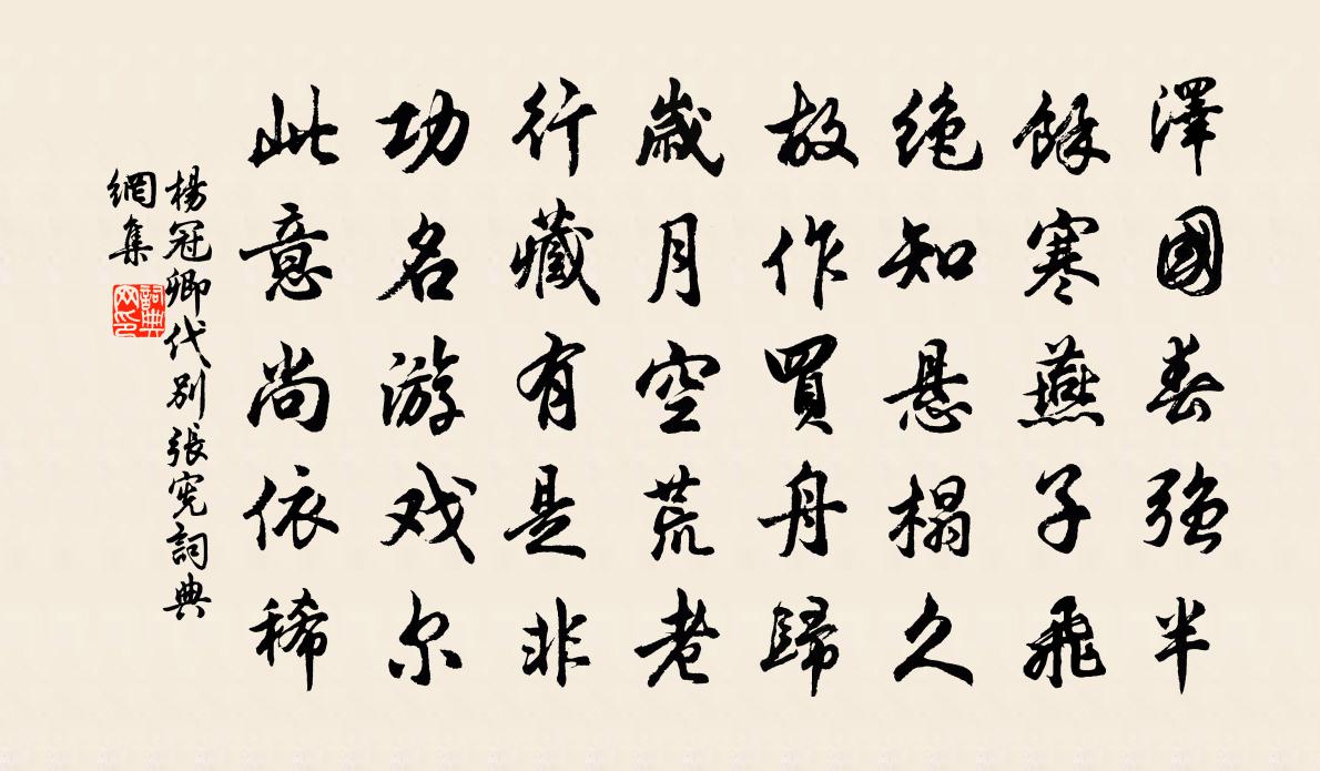 詩詞名句歷史字典書法欣賞書法字典國語詞典說文解字康熙字典古漢語字典標 題 作 者 詩 句 代別張憲作者:楊冠卿 朝代:宋代代別張憲原文澤國春強半,余寒燕子飛。絕知懸榻久,故作買舟歸。歲月空荒老,行藏有是非。功名遊戲爾,此意尚依稀。詩詞問答問:代別張憲的作者是誰?答:楊冠卿問:代別張憲寫於哪個朝代?答:宋代楊冠卿代別張憲書法欣賞代別張憲書法作品詩詞推薦三和劉克莊〔宋代〕自古名高易毀隨,誰令俶儻更權奇。心知吾友必中鵠,眼見乃翁初夢羆。所幸解驂逢晏子,不須結客報袁絲。古人七月二十四日以久不雨出禱磻溪是日宿虢縣二蘇軾〔宋代〕所建也夜久不寐見壁有前縣令趙薦留名有懷其人龕燈明滅欲三更,欹枕無人夢自驚。深谷留風終夜響,亂山銜月半送別友人詩沈約〔南北朝〕君東我亦西。銜悲涕如霰。浮雲一南北。何由展言宴。方作異鄉人。贈子同心扇。遙裔發海鴻。連翻出檐燕。春秋玉團兒(用周美成韻)盧炳〔宋代〕綠雲慢綰新梳束。這標緻、諸餘不俗。邂逅相逢,情懷雅合,全似深熟。耳邊笑語論心曲。把不定、紅生臉肉。若病足趙庚夫〔宋代〕老病侵陵藥不靈,雪窗燈火冷如螢。未應安隱青蓮足,便學蹁躚病鶴形。意蛩夢中輕獻璞,怒思天上去鞭霆。露華梅龍黃庚〔宋代〕孤根蟠屈浸冰壺,蟄裹陽和發朽枯。雪樹鱗封寒水玉,月梢頷吐夜明珠。暗香吹冷龍涎濕,疏影涵清蛻骨癯。安得郊祀慶成蘇轍〔宋代〕盛禮彌三祀,初元正七年。祭兼天地報,儀自祖宗傳。講義金華久,齋心玉食鮮。秋成通四海,廩實到窮邊。塵卷和柴監、劉宰〔宋代〕之之通才不受拘,妙年文史足三餘。司征關市方共二,宴啟華堂正樂胥。錦帳笙歌香霧繞,禪房風月夜窗虛。後生畫堂春(上老母壽)張孝祥〔宋代〕蟠桃一熟九千年。仙家春色無邊。書堂日暖卷非煙。晝永風妍。看取蔬封湯沐,何妨頻棹觥船。方瞳綠髮對儒仙。春遊佚名〔宋代〕到處笙蕭鼓笛中,詩人隨分得春風。提壺處處差監酒,布穀朝朝講勸農。答晁以道陳師道〔宋代〕轉走東南復帝城,故人相見眼偏明。十年作吏仍餬口,兩地為鄰闕寄聲。冷眼尚堪看細字,白頭寧復要時名。孰知失調名佚名〔宋代〕去不遠,路無多。霅城葉茵〔宋代〕愛向其中艤短篷,眼前景物總玲瓏。神仙窟宅垂揚裹,圖畫溪水落照中。甚是繁華輸俠少,也須幽勝屬衰翁。世間晦日宴高氏林亭周思鈞〔唐代〕早春驚柳穟,初晦掩蓂華。騎出平陽里,筵開衛尉家。竹影含雲密,池紋帶雨斜。重惜林亭晚,上路滿煙霞。三用韻十首楊公遠〔宋代〕不作皺眉事,何煩古押衙。且嘗桑落酒,更淪雨前茶。風銳霜初結,天寒日易斜。莫言秋色老,猶自有黃花。奉使契丹二十八首其二十二學士院端午帖子二蘇轍〔宋代〕南訛初應歷,五日未生陰。靈藥收農錄,薰風拂舜琴。上清宮文同〔宋代〕瓊台橫紫霄,上有縹緲居。雲霞抱窗戶,日月循庭除。飛羽下金輦,隱芝吟玉書。俯首視人間,人間臭如帤。幽州秋日聽王昭儀琴汪元量〔宋代〕瑤池宴罷夜何其,拂拭朱弦落指遲。彈到急時聲不亂,曲當終處意尤奇。雪深沙磧王嬙怨,月滿關山蔡琰悲。羈客寄呂德元時為督府屬二絕蘇籀〔宋代〕祖生晚節並劉琨,獨免聲消賈謐塵。虎士淮淝初小捷,謝庭蘭玉絕常倫。惜芳春·秋望喬吉〔元代〕千山落葉岩岩瘦,百尺危闌寸寸愁,有人獨倚晚妝樓。樓外柳,眉暗不禁秋。名句推薦唯不求利者為無害,唯不求福者為無禍。劉安及其門客《淮南子·詮言訓》 莫避春陰上馬遲。春來未有不陰時。辛棄疾《鷓鴣天·送歐陽國瑞入吳中》 山中一夜雨,樹杪百重泉。王維《送梓州李使君》 西施越溪女,出自薴蘿山。李白《西施 / 詠薴蘿山》 自與東君作別,剗地無聊。納蘭性德《風流子·秋郊即事》 山光忽西落,池月漸東上。孟浩然《夏日南亭懷辛大》 金風飄菊蕊,玉露泫萸枝。韋安石《奉和九日幸臨渭亭登高應制得枝字》 瑤草一何碧,春入武陵溪。黃庭堅《水調歌頭·遊覽》 鳥啼官路靜,花發毀垣空。張繼《清明日自西午橋至瓜岩村有懷》 半生已分孤眠過,山枕檀痕涴。納蘭性德《虞美人·曲闌深處重相見》