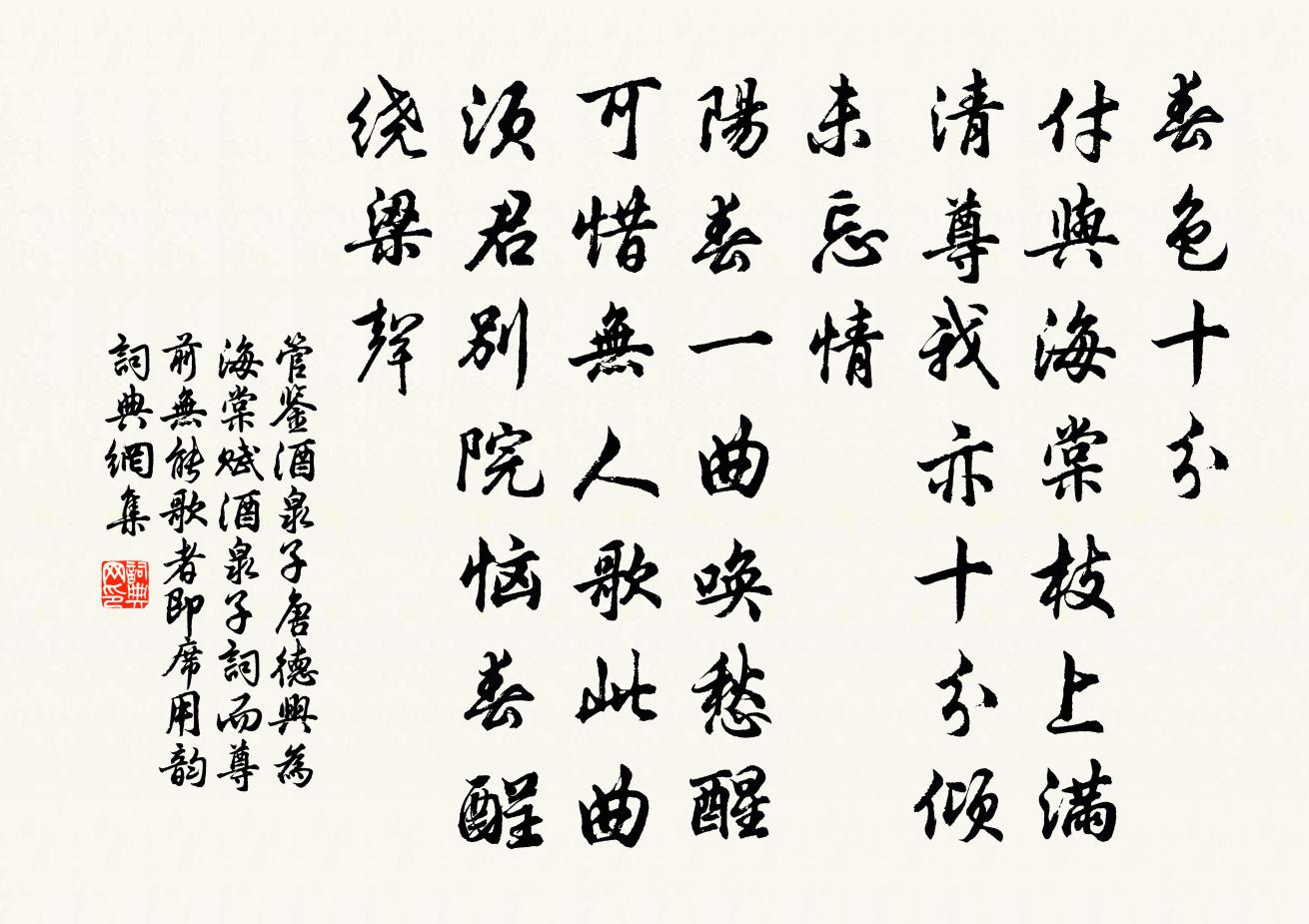 詩詞名句歷史字典書法欣賞書法字典國語詞典說文解字康熙字典古漢語字典標 題 作 者 詩 句 酒泉子(唐德興為海棠賦酒泉子詞,而尊前無能歌者,即席用韻)作者:管鑒 朝代:宋代原文春色十分。付與海棠枝上滿。清尊我亦十分傾。未忘情。陽春一曲喚愁醒。可惜無人歌此曲,須君別院惱春酲。繞樑聲。詩詞問答問:《酒泉子(唐德興為海棠賦酒泉子詞,而尊前無能歌者,即席用韻)》的作者是誰?答:管鑒問:該詩寫於哪個朝代?答:宋代問:該詩是什麼體裁?答:詞書法欣賞酒泉子(唐德興為海棠賦酒泉子詞,而尊前無能歌者,即席用韻)書法作品詩詞推薦紹興以後祀五方帝六十首佚名〔宋代〕在國之東,有壇崇成。節以和樂,式降式登。潔我佩服,璆琳鏘鳴。匪壇斯高,曷妥厥靈。金縷曲(五日和韻)劉辰翁〔宋代〕錦岸吳船鼓。問沙鷗、當日沈湘,是何端午。長恨青青朱門艾,結束腰身似虎。空淚落、嬋媛嬃女。我醉招累清醒六代祖師畫像贊五祖大滿禪師釋正覺〔宋代〕奇女之兒,雙峰之嗣。傳衣世稱乎妙齒,栽松我愧乎頹齒。前後兩身,古今一心。孤鸞風舞玻璃鏡,長鯨月轉珊瑚辛簿趙尉夜語新亭二首錢時〔宋代〕紛紛門外走紅塵,底是人間快活人。未判兩儀先太極,直須端的自家身。題王仲顯梅谷彭龜年〔宋代〕樓前梅十圍,負背花千樹。種花識花性,培養隨好惡。花無十日好。不憚千日慮。那知花已嬌,疲憊風能蠱。爭如題王恭父校書新辟書軒張鎡〔宋代〕仙翁眼力信非凡,到處偏工鑑別山。消得好烏巢屋上,旋移空翠入窗間。平生萬卷端能合,從此三杯不等閒。莫訝九日亭袁正規〔宋代〕不愧嘉名取次題,寓情彷佛古人齊。菊添細蕊金英重,松覆清幽蓋影低。上戴星辰全咫尺,傍躔日月自東西。宜將自朔方還與鄭式瞻崔稱鄭子周岑贊同會法雲寺三門避暑李益〔唐代〕予本疏放士,朅來非外矯。誤落邊塵中,愛山見山少。始投清涼宇,門值煙岫表。參差互明滅,彩翠竟昏曉。泠泠夢尋西山準上人錢起〔唐代〕別處秋泉聲,至今猶在耳。何嘗夢魂去,不見雪山子。新月隔林時,千峰翠微里。言忘心更寂,跡滅雲自起。覺來尊勝院劉倓〔宋代〕海角尋春雪未消,馬蹄無處避瓊瑤。己公屋下論文酒,爐火篝燈伴寂寥。拒霜花袁燮〔宋代〕誰將名字強稱揚,弱質區區敢傲霜。霜隕葉枯紅粉落,元來棖也未為剛。桃源憶故人王道亨〔宋代〕劉郎自是桃花主。不許春風閒度。春色易隨風去。片片傷春暮。返魂不用清香炷。卻有梅花淡佇。從此鎮長相顧。雍熙享先農六首佚名〔宋代〕明國紺壇,靈風肅然。登歌已闕,神馭將旋。道光帝籍,禮備公田。鑒茲躬家,永賜豈年。屺瞻道中馬廷鸞〔宋代〕波粼粼處淺溪沙,漁屋低迷舴艋家。地老天荒原野靜,江空歲晚水雲賒。淤泥日課黃金粟,清泚時吹白浪花。漫喜夏夜陸游〔宋代〕庭荒蔓草長,堂豁爽氣入。悠然推枕起,聊作倚杖立。飛螢亦避雨,黏棟光熠熠。南鄰輸稅歸,小婦愁夜汲。少稷勸飲每作色明遠忽拂袖去戲呈韓元吉〔宋代〕無多酌我蓋司隸,不能滿觴田將軍。坐中倖免沐猴舞,且復周旋非貴人。人言勁飲無惡意,君胡作惡使客起。少陵寄宋申錫評事時從李少師移軍回歸鮑溶〔唐代〕君逐元侯靜虜歸,虎旗龍節駐春暉。欲求岱嶽燔柴禮,已錫魯人縫掖衣。長劍一時天外倚,五雲多繞日邊飛。心期木蘭花慢(次岳總乾韻)黃機〔宋代〕問功名何處,算只合、付悠悠。怕僮僕揶揄,長年為客,楚尾吳頭。春來故園漸好,似不應、不醉把春休。剩買蔞東窗遣興陸游〔宋代〕巾屨長閒客,簾櫳薄暑天。巢空重乳燕,葉密未鳴蟬。壺箭看多算,圖書理斷編。悠然已日夕,卻上采菱船。春草唐彥謙〔唐代〕隨夢入池塘,無心在金谷。青風自年年,吹遍天涯綠。名句推薦秦中已久烏頭白,卻是君王未備知。李商隱《人慾》 林花掃更落,徑草踏還生。孟浩然《春中喜王九相尋 / 晚春》 父為考,母為妣。佚名《爾雅·釋親》 木落雁南度,北風江上寒。孟浩然《早寒江上有懷 / 早寒有懷 / 江上思歸》 莫道桑榆晚,為霞尚滿天。劉禹錫《酬樂天詠老見示》 記取西湖西畔,正暮山好處,空翠煙霏。蘇軾《八聲甘州·寄參寥子》 粗繒大布裹生涯,腹有詩書氣自華。蘇軾《和董傳留別》 奢侈之敗家,猶出常情;而慳吝之敗家,必遭奇禍。王永彬《圍爐夜話·第五九則》 盡教春思亂如雲,莫管世情輕似絮晏幾道《玉樓春·雕鞍好為鶯花住》 孤燈寒照雨,濕竹暗浮煙。司空曙《雲陽館與韓紳宿別》