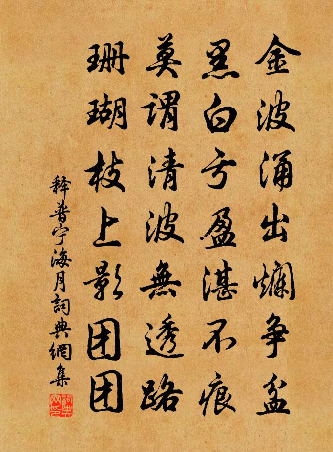 詩詞名句歷史字典書法欣賞書法字典國語詞典說文解字康熙字典古漢語字典標 題 作 者 詩 句 海月作者:釋普寧 朝代:宋代海月原文金波湧出爛爭盆,黑白虧盈湛不痕。莫謂清波無透路,珊瑚枝上影團團。詩詞問答問:海月的作者是誰?答:釋普寧問:海月寫於哪個朝代?答:宋代釋普寧海月書法欣賞海月書法作品詩詞推薦城隍廟賽雨二首羊士諤〔唐代〕零雨慰斯人,齋心薦綠蘋。山風簫鼓響,如祭敬亭神。積潤通千里,推誠尊一卮。回飆經畫壁,忽似偃雲旗。山亭柳杜安世〔宋代〕曉來風雨,萬花飄落。嘆韶光虛過。卻芳草萋萋,映樓台、淡煙漠漠。紛紛絮飛院宇,燕子過朱閣。玉容淡妝添寂次韻七夕洪咨夔〔宋代〕弄巧拙逾甚,合歡愁轉多。擘金盟似海,搔王淚成河。天運真旋磨,人生特擲梭。身閒涼月好,且與醉無何。九月十六日自許昌回至京師胥平叔宋中道迓於梅堯臣〔宋代〕今日至國門,二子來迎我。適遇信陵冢,冢棘秋葉墮。翩翻隨人飛,拂馬右或左。謂此獨無情,亦與吾意可。題曾氏山園十一詠蓼步張栻〔宋代〕扁舟橫薄莫,渺渺蓼知秋。家山有江湖,何必賦遠遊。雜興六言十首劉克莊〔宋代〕小臣素著狂直,先皇數獎忠嘉。叩額有厚倫疏,斷腕無起復麻。與獻臣希深伯中源叔景純會飲城東小園宋祁〔宋代〕林間曉日靜暉暉,判共山公倒接?。不信佳人唱花落,試尋欄畔有空枝。頌古三十三首釋師觀〔宋代〕漢既不管,秦亦不收。人平不語,水平不流。次韻和永叔石枕與笛竹簟梅堯臣〔宋代〕溪上枕剖龍卵石,蘄匠簟制蛇皮紋。客從東方一持贈,竹色蒸青石抱雲。磨沙斲骨自含潤,飽霜吊節無留塵。京師榴皮題壁葉三英〔宋代〕求仙那得仙來訪,多積陰功至有餘。欲悟東林沈東老,故留三十六玄書。昔游詩 其十一姜夔〔宋代〕昔游衡山上,未曉入幽谷。欲識所坐輿,橫版掛兩竹。狀如鞦韆垂,高下不傾覆。登山九千丈,中道多佛屋。一峰再用出郊韻似延慶老三首吳潛〔宋代〕菩提只在攝心官,日觀元同月觀看。萬種因緣都是結,一花根蒂幾曾殘。祖師曾誓瘡膿壞,講主能參屎橛乾。石碩臨江仙宋先生〔宋代〕說甚坎離龍共虎,休言火候周天。陽精不走自神全。雙關明有路,直上至泥丸。牢鎖金關並玉戶,日魂月魄烹煎。送陳令王安石〔宋代〕長溪流水碧潺潺,古木蒼藤暗兩山。把臂道人今在否,長官白首尚人間。句某教授〔宋代〕作法孰為涼。寄遠熊湄〔清代〕幾回聞雁憶連然,天末遙將錦字傳。萬里飄流羈遠客,十年迢遞阻回船。浮雲目斷蒼山外,落月魂消洱海邊。何日金陵官舍後圃散二首楊萬里〔宋代〕旋種花窠二百株,不知種了有花無。阿誰便向春工說,急搗紅藍染玉酥。題趙鷗波高士圖龔開〔宋代〕雪氣侵人臥欲僵,苦勞明府到藜床。主賓問答皆情語,何用閒名入薦章。好事近汪莘〔宋代〕天宇綠無雲,遲日江山如繡。是日輕衫團扇,笑折花相授。南山之北北山南,星鳥尚依舊。誰在松風高臥,作嵩陽蝶戀花王采〔宋代〕暈綠抽芽新葉斗。掩映嬌紅,脈脈群芳後。京兆畫眉樊素口。風姿別是閨房秀。新篆題詩霜實就。換得瓊琚,心事名句推薦見人惡,即內省。有則改,無加警。李毓秀《弟子規·信》 自笑堂堂漢使,得似洋洋河水,依舊只流東陳亮《水調歌頭·送章德茂大卿使虜》 無為在歧路,兒女共沾巾。王勃《送杜少府之任蜀州 / 送杜少府之任蜀川》 聞道故林相識多,罷官昨日今如何李頎《送陳章甫》 順風而呼,聲非加疾也,而聞者彰。荀子《勸學》 多謝月相憐,今宵不忍圓。朱淑真《菩薩蠻·山亭水榭秋方半》 用國者,得百姓之力者富,得百姓之死者強,得百姓之譽者榮。荀子《荀子·王霸》 片雲天共遠,永夜月同孤。杜甫《江漢》 普天皆滅焰,匝地盡藏煙。沈佺期《寒食》 蓮子已成荷葉老。青露洗、蘋花汀草。李清照《怨王孫·湖上風來波浩渺》