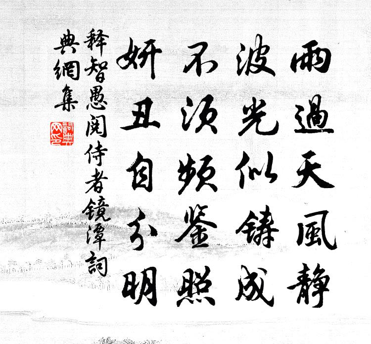 詩詞名句歷史字典書法欣賞書法字典國語詞典說文解字康熙字典古漢語字典標 題 作 者 詩 句 閱侍者鏡潭作者:釋智愚 朝代:宋代閱侍者鏡潭原文雨過天風靜,波光似鑄成。不須頻鑒照,妍醜自分明。詩詞問答問:閱侍者鏡潭的作者是誰?答:釋智愚問:閱侍者鏡潭寫於哪個朝代?答:宋代釋智愚閱侍者鏡潭書法欣賞閱侍者鏡潭書法作品詩詞推薦春歸五首 其一朱淑真〔宋代〕片片飛花弄晚暉,杜鵑啼血訴春歸。憑誰礙斷春歸路,更且留連伴翠微。一字至十字成章二首詠竹文同〔宋代〕竹,竹。森寒,潔綠。湘江濱,渭水曲。帷幔翠錦,戈矛蒼玉。心虛異眾草,節勁逾凡木。化龍杖入仙陂,呼鳳律贈劉師服韓愈〔唐代〕羨君齒牙牢且潔,大肉硬餅如刀截。我今呀豁落者多,所存十餘皆兀臲。匙抄爛飯穩送之,合口軟嚼如牛呞。妻兒贈存古楊茂盛卿方回〔宋代〕捲軸年深碎破時,我能補苴以完之。驚逢大桁重華典,喜見由庚束皙詩。王會周篇汲郡冢,儒生秦頌泰山碑。裝潢望漢月李遵勖〔宋代〕 * 一業臨砌。顆顆露珠裝綴。獨教冷落向秋天,恨東君不曾留意。雕闌新雨霽。綠蘚上,亂鋪金蕊。此花開後更宿朝宗驛游洞天游洞天四首王越石〔宋代〕藥盆丹灶石床間,龍虎當年向此盤。雲雙久登天穴路,仙風依舊拂衣寒。禪翁釋文珦〔宋代〕禪翁八十鬢如霜,冷坐雲邊舊竹房。唯放此身長懶散,更無餘事可思量。飛流激石泉珠迸,斜照入林松影長。即景桂州陪王都督晦日宴逍遙樓宋之問〔唐代〕晦節高樓望,山川一半春。意隨蓂葉盡,愁共柳條新。投刺登龍日,開懷納鳥晨。兀然心似醉,不覺有吾身。田家三詠葉紹翁〔宋代〕抱兒更送田頭飯,畫鬢濃調灶額煙。爭信春風紅袖女,綠楊庭院正鞦韆。卜運算元·不是愛風塵嚴蕊〔宋代〕不是愛風塵,似被前緣誤。花落花開自有時,總賴東君主。去也終須去,住也如何住!若得山花插滿頭,莫問奴歸滿庭芳·漢上繁華徐君寶妻〔宋代〕漢上繁華,江南人物,尚遺宣政風流。綠窗朱戶,十里爛銀鉤。一旦刀兵齊舉,旌旗擁、百萬貔貅。長驅入,歌台句滕邁〔唐代〕陶令門前罥接z5,亞夫營里拂朱旗。(《柳》,見《雲溪友議》)頌古釋慧空〔宋代〕大食波斯飲百杯,停杯把挹萬人魃。送風使過黃牛峽,不問瞿塘灩澦堆。句滕元發〔宋代〕寒日邊聲斷,春風塞草長。傳聞漢都護,歸奉萬年觴。惜雙雙(中呂宮)張先〔宋代〕城上層樓天邊路。殘照里、平蕪綠樹。傷遠更惜春暮。有人還在高高處。斷夢歸雲經日去。無計使、哀弦寄語。相和楊高品馬廄猢猻梅堯臣〔宋代〕嘗聞養騏驥,辟惡系獼猴。供春新教藝,將軍舊病偷。聊看緣柱杪,尚想傍崖頭。更祝南州使,如拳試為求。寄題張仲寅甘老堂楊萬里〔宋代〕屏山十論擇聖心,甘老十論刮古今。古今颳得都見髓,持獻玉工逢刖趾。玉皇左相華陽封,上與阿且雙周公。薦渠和族兄計院二首劉克莊〔宋代〕疇昔曾賡殿閣涼,君恩重管舊□□。□□□□□□誚,賀八惟宜道士裝。社裡戴花□□□,□□□□□差強。摩挲離亭賦得折楊柳二首李商隱〔唐代〕(其一)暫憑樽酒送無憀,莫損愁眉與細腰。人世死前惟有別,春風爭擬惜長條?(其二)含煙惹霧每依依,萬緒別詩二首·其一范雲〔南北朝〕洛陽城東西,長作經時別。昔去雪如花,今來花似雪。名句推薦遠書歸夢兩悠悠,只有空床敵素秋。李商隱《端居》 卓眾來東下,金甲耀日光。蔡琰《悲憤詩》 新歡不抵舊愁多,倒添了、新愁歸去范成大《鵲橋仙·七夕》 天山雪後海風寒,橫笛偏吹行路難。李益《從軍北征》 野老念牧童,倚杖候荊扉。王維《渭川田家》 海畔風吹凍泥裂,枯桐葉落枝梢折。陳羽《從軍行》 然而其持之有故,其言之成理。荀子《荀子·非十二子》 獨睡起來情悄悄,寄愁何處好。納蘭性德《謁金門·風絲裊》 畫樓洗淨鴛鴦瓦,彩繩半濕鞦韆架。王元鼎《醉太平·寒食》 弱冠弄柔翰,卓犖觀群書。左思《詠史八首·其一》