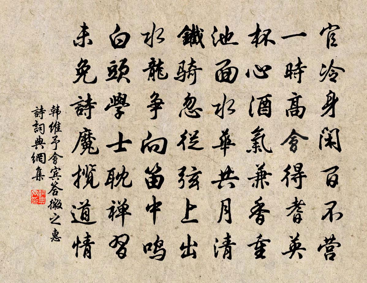 詩詞名句歷史字典書法欣賞書法字典國語詞典說文解字康熙字典古漢語字典標 題 作 者 詩 句 予會賓答微之惠詩作者:韓維 朝代:宋代予會賓答微之惠詩原文官冷身閒百不營,一時高會得耆英。杯心酒氣兼香重,池面水華共月清。鐵騎忽從弦上出,水龍爭向笛中鳴。白頭學士耽禪習,未免詩魔攬道情。詩詞問答問:予會賓答微之惠詩的作者是誰?答:韓維問:予會賓答微之惠詩寫於哪個朝代?答:宋代韓維予會賓答微之惠詩書法欣賞予會賓答微之惠詩書法作品詩詞推薦偈頌一百一十七首釋紹曇〔宋代〕榴柄短長,鍋兒大小,家醜奪端花擘了。狼籍不小,慚惶不少。藏方師兄,平跋則個。句洪天錫〔宋代〕平生要識瓊崖面,到此當堅鐵石心。長思仙 贈小張仙馬鈺〔元代〕小張仙。小張仙。款款搜尋汞與鉛。先須縛馬猿。氣綿綿。氣綿綿。龍虎相交玉蕊鮮。金丹一粒圓。依韻和永叔內翰酬寄楊州劉原甫舍人梅堯臣〔宋代〕東望淮海間,恨無鴻鵠羽。鴻鵠日已飛,風雪歲將暮。憶聽談老莊,達生無恐懼。我今齒髮疏,何異樹有蠹。離別哭德和伯氏六首林景熙〔宋代〕草枯霜白泣原鴒,五十三年老弟兄。風雨對床緣未了,荊花重合在來生。某竊慕東坡以鐵拄杖為樂全生日之壽今以大銅陳與義〔宋代〕不與觀音伴柳枝,要令奇相解公頤。會逢白氏編書日,猶夢陶家貯粟時。安用作盤供歃血,也勝為缽困催詩。千年文宣王及其弟子贊宋高宗〔宋代〕君子若人,單父之政。引肘寤君,放魚稟令。傅郭勿獲,遂能制命。百代理邑,用規觀聽。行香子 原誤作南香子 此下原有虞美人重陽飲佚名〔宋代〕一個蒼蠅,飛入腥盆。顧甜時、直入中心去,忘了抬身。沾其足,沾其翅,喪其形。我好嗟吁,怎不動心。甜中有兵後經永安法空寺寄悟禪師(其寺賊所焚)皎然〔唐代〕常說人間法自空,何言出世法還同。微蹤舊是香林下,餘燼今成火宅中。後夜池心生素月,春天樹色起悲風。吾知周十三丈約同馬三丈入青原山賦詩五首以記行趙蕃〔宋代〕渡江不待餉,勝士約三行。夢境故常在,重來年漫更。又成春霧掃,何日野田耕。要向思公問,燈明香縷橫。和劉賓客玉蕣薛濤〔唐代〕瓊枝玓瓅露珊珊,欲折如披雲彩寒。閒拂朱房何所似,緣山偏映日輪殘。示無住道人釋慧遠〔宋代〕打破從來淨潔禪,萬機攢簇髑髏前。橫身塞斷來時路,一句當機日麗天。和李文溪送青雲道人歸杭韻徐元傑〔宋代〕丹成會見君身蛻,我欲從之更問天。喚醒橫江孤鶴夢,憑君持此叩坡仙。江畔獨步尋花七絕句杜甫〔唐代〕江上被花惱不徹,無處告訴只顛狂。走覓南鄰愛酒伴,經旬出飲獨空床。稠花亂蕊畏江濱,行步欹危實怕春。詩酒外兄施伯侃下第赴並門叔父招梅堯臣〔宋代〕共是乾時者,同為失意人。言趨太原召,如忍宛陵親。笳鼓聽臨塞,琴書未離身。別君無斗酒,當識士安貧。樂庵初成二首李衡〔宋代〕投老庵居百事宜,早眠晏起不論時。更長睡足披衣坐,傾耳林間竹畫眉。獨坐劉子翬〔宋代〕獨坐高堂上,游觀思無極。重門雖晝關,遠岫如不隔。長林葉布陰,淺澗流波激。欣欣物態榮,淑氣生原隰。幽禽漫成七首張耒〔宋代〕溪水春來清盪沙,溪南溪北是人家。依依陌上多情柳,簇簇原頭自在花。長安感興鄭谷〔唐代〕徒勞悲喪亂,自古戒繁華。落日狐兔徑,近年公相家。可悲聞玉笛,不見走香車。寂寞牆匡里,春陰挫杏花。登山卻立府視一村風物殊可人意二絕陳文蔚〔宋代〕竹樹誰家跨小橋,清溪一逞抱山腰。不須更倩王摩詰,水墨平鋪百尺綃。名句推薦遠書歸夢兩悠悠,只有空床敵素秋。李商隱《端居》 瘦影自臨春水照,卿須憐我我憐卿。馮小青《怨》 微微風簇浪,散作滿河星。查慎行《舟夜書所見》 竹疏虛檻靜,松密醮壇陰。張泌《女冠子·露花菸草》 重陽過後,西風漸緊,庭樹葉紛紛。晏殊《少年游·重陽過後》 秋曉上蓮峰,高躡倚天青壁陸游《好事近·秋曉上蓮峰》 明年此會知誰健?醉把茱萸仔細看。杜甫《九日藍田崔氏莊》 謹身節用,以養父母孔子及其弟子《孝經·庶人》 少小離家老大回,鄉音無改鬢毛衰。賀知章《回鄉偶書二首·其一》 時雨降矣,而猶浸灌,其於澤也,不亦勞乎!莊子《莊子·內篇·逍遙遊》