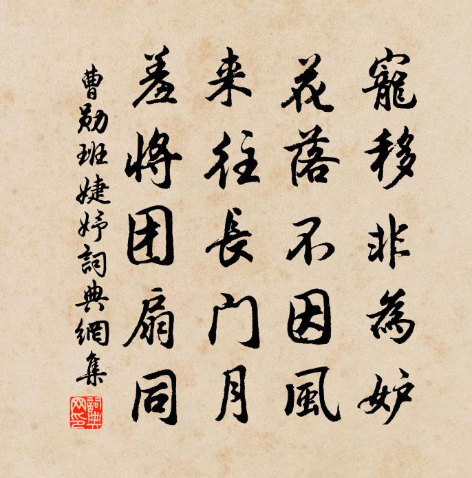 詩詞名句歷史字典書法欣賞書法字典國語詞典說文解字康熙字典古漢語字典標 題 作 者 詩 句 班婕妤作者:曹勛 朝代:宋代班婕妤原文寵移非為妒,花落不因風。來往長門月,羞將團扇同。詩詞問答問:班婕妤的作者是誰?答:曹勛問:班婕妤寫於哪個朝代?答:宋代曹勛班婕妤書法欣賞班婕妤書法作品詩詞推薦頌古十七首釋大觀〔宋代〕飢人貪食良農粟,渴漢錯飲蠱家水。對面還成千里遙,賊人有智過君子。歸雁鮑溶〔唐代〕南國春早暖,渚蒲正月生。東風吹雁心,上下和樂聲。繞水半空去,拂雲偕相迎。如防失群怨,預有侵夜驚。渺邈再用才子富文華校讎天祿閣韻贈周教授陳造〔宋代〕君家小阿韞,擇婿須才賢。我家小於菟,披霧欲窺天。鵲語燈著花,妙契默有傳。何當珠簾外,彩絲自相聯。和鄭元及第後秋歸洛下閒居( 同高侍郎下隔年及第)白居易〔唐代〕勤苦成名後,優遊得意間。玉憐同匠琢,桂恨隔年攀。山靜豹難隱,谷幽鶯暫還。微吟詩引步,淺酌酒開顏。門回瑣窗寒楊 * 〔宋代〕倦拂鴛衾,羞臨鵲鑒,懶開窗戶。韶華暗度,又過妒花風雨。掩熏爐、怕聞舊香,柳陰只有黃鶯語。似向人、欲說賀新郎(和吳明可給事安撫)辛棄疾〔宋代〕世路風波惡。喜清時、邊夫袖手,□將帷幄。正值春光二三月,兩兩燕穿簾幕。又怕個、江南花落。與客攜壺連夜摸魚兒(送邵瓜坡赴含山尉,且堅後約)張榘〔宋代〕正挑燈、共聽檐雨,問誰催動行色。風前千點離亭恨,惟有落梅知得。王謝宅。記前度斜陽,燕子曾相識。花香露沁園春劉過〔宋代〕畫鷁凌空,紅旗翻雪,靈鼉震雷。嘆沈湘去國,懷沙弔古,江山凝恨,父老興哀。正直難留,靈修已化,三戶真能次韻良佐歇心歌三首陶夢桂〔宋代〕鳥窠看了看蜂窠,才上坡來又下坡。松竹徑中逢野老,芰荷香里唱漁歌。歸來不見香風改,老去何愁明月多。況有破斧佚名〔先秦〕既破我斧,又缺我斨。周公東征,四國是皇。哀我人斯,亦孔之將。既破我斧,又缺我錡。周公東征,四國是吪。送客江行許渾〔唐代〕蕭蕭蘆荻花,郢客獨辭家。遠棹依山響,危檣轉浦斜。不寒澄淺石,潮落漲虛沙。莫與征徒望,鄉園去漸賒。寄謝蜀帥表起岩尚書閣學寄贈藥物二首楊萬里〔宋代〕臥雪先生冰雪胸,小迂星履領元戎。草堂衣缽風騷將,花屋笙簫造化工。杜宇催歸波正綠,海棠不睡燭斜紅。遨頭春光好曹勛〔宋代〕十年不見春光好,胡人馬齧長安草。長安草盡人已空,宮館園林跡如掃。東都西洛暗兵塵,晝引狐狸上黃道。長淮青杏兒姬翼〔元代〕人世太愚痴。虛幻里自作羈縻。妻男眷戀何時盡,同枝宿鳥,天明解散,各自東西。走骨與行屍。看不破、傀儡關蕙花趙孟堅〔宋代〕光風盪暖暖晴天,雅有幽香入簡編。尋見野花都不是,山峰引到石崖邊。和楊齊伯韻郭印〔宋代〕邪師挾幻術,念念皆狂圖。化出一切象,形容乃甚都。佛光亦幻成,非有與非無。煙霞異明晦,寥廓元太虛。離婁次韻石七三六言七首黃庭堅〔宋代〕看著莊周枯槁,化為胡蝶翾輕。人見穿花入柳,誰知有體無情。和劉中書仙詩沈約〔南北朝〕清旦發玄洲。是暮宿丹丘。崑山西北映。流泉東南流。霓裳拂流電。雲車委輕霰。崢嶸上不覩。寥廓下無見。送集賢盛諫議出牧維揚宋庠〔宋代〕江海多年滯軾熊,書林諫霤得儒宗。寬條一劄仙泥熟,慈宴千觴湛露濃。迎舸蔽川交畫鷁,隊笳橫浦細吟龍。輕揚懷友人陳烈陳襄〔宋代〕思君苦節直艱難,四十窮經草野間。文為周衰能力救,禮遭秦禍欲重刪。時無正說非楊墨,天與多才繼孔顏。吾主名句推薦迎醉面,暮雪飛花,幾點黛愁山暝。吳文英《十二郎·垂虹橋》 望家思獻壽,算甲恨長年。歐陽詹《除夜長安客舍》 春風十里揚州路,卷上珠簾總不如。杜牧《贈別》 能勝強敵者,先自勝者也。商鞅《商君書·畫策》 昨日屋頭堪炙手,今朝門外好張羅白居易《放言五首·其四》 車轔轔,馬蕭蕭,行人弓箭各在腰。杜甫《兵車行》 人歸落雁後,思發在花前。薛道衡《人日思歸》 洞庭春溜滿,平湖錦帆張。陰鏗《渡青草湖》 喜怒豈妄發哉?皆逆之所犯也。列子及其弟子《列子·黃帝》 煙霏霏。雪霏霏。雪向梅花枝上堆。吳淑姬《長相思令·煙霏霏》