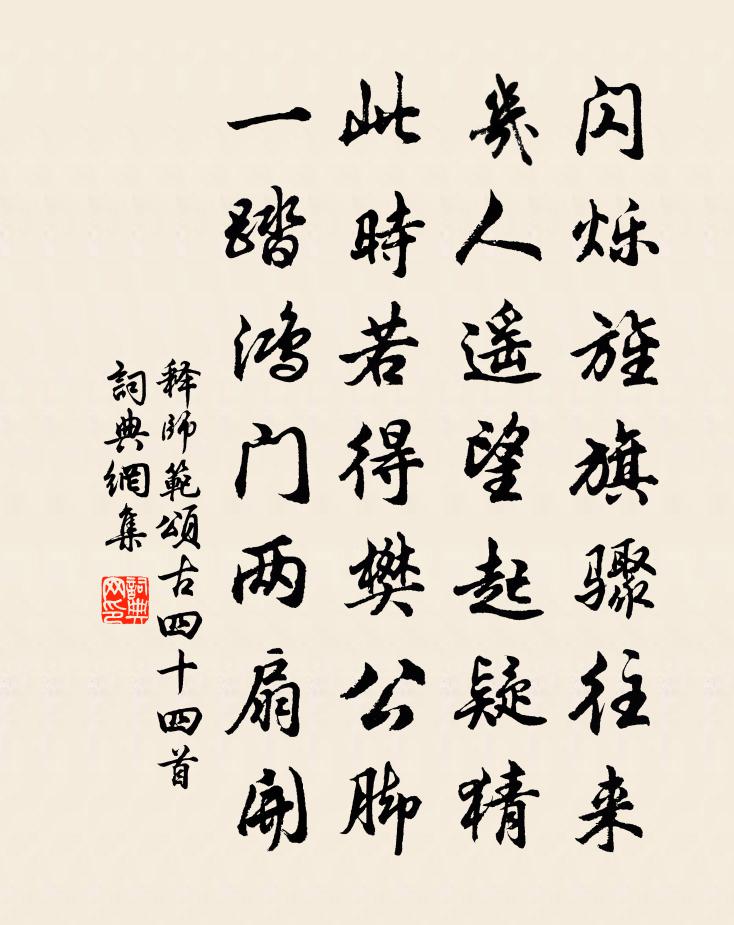 詩詞名句歷史字典書法欣賞書法字典國語詞典說文解字康熙字典古漢語字典標 題 作 者 詩 句 頌古四十四首作者:釋師範 朝代:宋代頌古四十四首原文閃爍旌旗驟往來,幾人遙望起疑猜。此時若得樊公腳,一踏鴻門兩扇開。詩詞問答問:頌古四十四首的作者是誰?答:釋師範問:頌古四十四首寫於哪個朝代?答:宋代釋師範頌古四十四首書法欣賞頌古四十四首書法作品詩詞推薦似村陳耆卿〔宋代〕縛茅本不傍孤村,盡日焚香深閉門。陌上紅塵高沒馬,誰知巢父箇中存。三月二十五日聞鵯鵊張耒〔宋代〕雲夢澤南春欲還,柯山鵯鵊曉關關。幽人夢覺殷勤聽,落月江風尚薄寒。詠歸亭馮椅〔宋代〕弓轉寒溪月一灣,下臨虎豹踞斕斑。林煙開處飛層閣,雲市窮頭獲遠山。衿佩光陰弦誦裹,舟梁人物畫圖間。紅塵【黃鐘】節節高盧摯〔元代〕題洞庭鹿角廟壁雨晴雲散,滿江明月。風微浪息,扁舟一葉。半夜心,三生夢,萬里別,悶倚篷窗睡些。壽母生朝四首項安世〔宋代〕君如快馬捷先鳴,上便追風不計程。楊監西江推格律,陸郎東流服才情。栽培花木心無事,彈壓湖山句有聲。如許謁金門洪瑹〔宋代〕風共雨。催盡亂紅飛絮。百計留春春不住。杜鵑聲更苦。細柳官河狹路。幾被嬋娟相誤。空憶墜鞭遺扇處。碧窗眉和中道游金明池韓維〔宋代〕山苑花光朱雪動,厭波橋影彩虹搖。飛揚鶯燕驚高管,偃蹇魚龍近畫橈。早識浮名身外事,久判閒日醉中消。幾年瓶中淮陽紅牡丹落盡有嘆三首楊萬里〔宋代〕只愁風雨妒花枝,翦入瓷瓶養卻伊。更下重簾深閉合,忽然花落又關誰。遊仙二首秦觀〔宋代〕雲車自天來,駕言游混茫。手持太一節,身佩使者章。龍處傍夭矯,馬龜伏以翔。朝元紫微上,所睹浩難量。實網宮詞張公庠〔宋代〕欲下金階翦牡丹,夜來風士怯輕寒。腰如束素天然細,不為傷春帶自寬。句孔武仲〔宋代〕黃公山下官悰冷,應有新吟續七哀。郴江百詠並序香泉阮閱〔宋代〕僧舍靈源靜不流,只供齋缽與茶甌。直應老衲投薰陸,石罅雲根久未收。望海潮 發高麗作趙可〔元代〕雲垂餘發,霞拖廣袂,人間自有飛瓊。三館俊游,百銜高選,翩翩老阮才名。銀漢會雙星。尚相看脈脈,似隔盈盈屬邑告稔寄轉運勸農二使台宋祁〔宋代〕稼雲彌望黷紆餘,雨遍公私告稔初。田父此時歌擊壤,牧人他夜夢為魚。勸符數下收遺{左禾右齊},漕穀相銜餉木蘭花慢(重九)京鏜〔宋代〕算秋來景物,皆勝賞、況重陽。正露冷欲霜,煙輕不雨,玉宇開張。蜀人從來好事,遇良辰、不肯負時光。藥市家代柬寄張端衡劉宰〔宋代〕句曲山頭白鶴飛,遙憐彩棒正宣威。仙家有喜迎仙吏,客路無塵點客衣。月澹郊原從犬臥,秋高籬落任雞肥。子真木蘭花慢秦觀〔宋代〕過秦淮曠望,迥瀟灑、絕纖塵,愛清景風蛩。吟鞭醉帽,時度疏林,秋來政情味淡。更一重煙水一重雲,千古行人送眉山孫夢得從饒伯輿李純父學趙汝騰〔宋代〕景山書來說蜀珍,與吾氣象清而真。束書亟歸侍溫清,力祈樸學為是正。程文不過工進取,何若杜門誦論語。一言句程師孟〔宋代〕城裡人家半讀書,學校未嘗虛里巷。見紫薇花憶微之白居易〔唐代〕一叢暗淡將何比?淺碧籠裙襯紫巾。除卻微之見應愛,人間少有別花人。名句推薦小來思報國,不是愛封侯。岑參《送人赴安西》 北風捲地白草折,胡天八月即飛雪。岑參《白雪歌送武判官歸京》 惟仁者宜在高位。孟子《孟子·離婁章句上·第一節》 倉無備粟,不可以待凶飢。墨子《墨子·05章 七患》 塞馬一聲嘶,殘星拂大旗。納蘭性德《菩薩蠻·朔風吹散三更雪》 憶昔花間相見後,只憑縴手,暗拋紅豆。歐陽炯《賀明朝·憶昔花間相見後》 一時輕信人言語.自有明人話不平。馮夢龍《警世通言·卷四》 重岩疊嶂,隱天蔽日。酈道元《三峽》 君子周而不比,小人比而不周。孔子弟子《論語·為政篇》 肌玉暗消衣帶緩,淚珠斜透花鈿側。文天祥《滿江紅·和王夫人滿江紅韻以庶幾後山妾薄命之意》