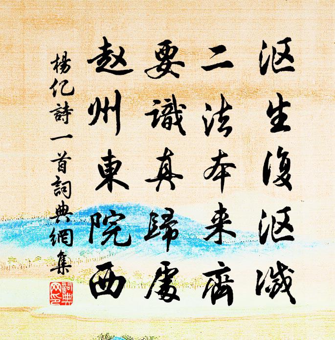 詩詞名句歷史字典書法欣賞書法字典國語詞典說文解字康熙字典古漢語字典標 題 作 者 詩 句 詩一首作者:楊億 朝代:宋代詩一首原文漚生復漚滅,二法本來齊。要識真歸處,趙州東院西。詩詞問答問:詩一首的作者是誰?答:楊億問:詩一首寫於哪個朝代?答:宋代楊億詩一首書法欣賞詩一首書法作品詩詞推薦送殷淑三首李白〔唐代〕海水不可解,連江夜為潮。俄然浦嶼闊,岸去酒船遙。惜別耐取醉,鳴榔且長謠。天明爾當去,應便有風飄。白鷺塞下曲二首令狐楚〔唐代〕雪滿衣裳冰滿須,曉隨飛將伐單于。平生意氣今何在,把得家書淚似珠。邊草蕭條塞雁飛,征人南望淚沾衣。黃塵太常引·客中聞歌項鴻祚〔清代〕杏花開了燕飛忙,正是好春光。偏是好春光,者幾日、風淒雨涼。 楊枝飄泊,桃根嬌小,獨自個思量。剛待不友人別墅趙庚夫〔宋代〕買山仍近水,結屋又安墳。此舉堪驚世,餘年獨羨君。釣舟須共載,禪榻亦平分。切莫施門戶,□藏恐礙雲。開禧元年四月自中都挈家還鄉寓居城南十二月汪莘〔宋代〕每恨投南鵲,尤憐向北枝。雖蒙今士笑,恐有後人思。運火解朝凍,咽津棄夜飢。不來溪上住,那得雪中詩。飲酒二十首同蘇翰林先生次韻追和陶淵明四晁補之〔宋代〕園林日夕好,花繁時鳥飛。少年玩芳物,不飲成坐悲。只今未白髮,念昔已依依。紛華戰吾道,決勝當有歸。挫銳在水軍宴韋司馬樓船觀妓李白〔唐代〕搖曳帆在空,清流順歸風。詩因鼓吹髮,酒為劍歌雄。對舞青樓妓,雙鬟白玉童。行雲且莫去,留醉楚王宮。東陂李新〔宋代〕珠槃出海山崢嶸,滎陽城東春水生。路沙陷車沒馬腳,行人避沙堤下行。箇中人利魚芡美,輕舠細綱晨縱橫。煙雲室思徐幹〔魏晉〕峨峨高山首,悠悠萬里道。君去日已遠,鬱結令人老。人生一世間,忽若暮春草。時不可再得,何為自愁惱?每誦減字木蘭花(雪詞)蘇軾〔宋代〕雲容皓白。破曉玉英紛似織。風力無端。欲學楊花更耐寒。相如未老。梁苑猶能陪俊少。莫惹閒愁。且折江梅上小漢宮春呂岩〔唐代〕橫笛聲沉,倚危樓紅日,江轉天斜。黃塵邊火澒洞,何處吾家。胎禽怨夜,來乘風、玄露丹霞。先生笑、飛空一劍春晴白玉蟾〔宋代〕宿靄縈余凍,鬆陰挾嫩晴。朝來花萬福,鶯奏起居聲。又和春日對酒蘇頌〔宋代〕倦遊城闕祗疏慵,偏愛君家好事風。後院按歌聲不歇,雕章得句曲方終。歡來趨向諸緣息,醉里情懷萬慮空。誰道三用韻何夢桂〔宋代〕何年鑄銅柱,請為問伏波。薊子去不遠,金狄誰再摩。世變落莽渺,吾意成蹉跎。盜跖飫肝膾,孔聖厄弦歌,禍福山中奉寄錢起員外兼簡苗發員外秦系〔唐代〕空山歲計是胡麻,窮海無梁泛一槎。稚子唯能覓梨栗,逸妻相共老煙霞。高吟麗句驚巢鶴,閒閉春風看落花。借問旅中作裴說〔唐代〕妄動遠拋山,其如餒與寒。投人言去易,開口說貧難。澤國雲千片,湘江竹一竿。時明未忍別,猶待計窮看。江城子 和蒼蓋郭秀才韻尹志平〔元代〕乘車坐馬走東西。論玄規。入幽微。天下崢嶸,隨分立階梯。吾教流通天地*,無不喜,盡歸依。其中訊息與誰期再賦酬吳鞠潭施樞〔宋代〕酌酒酬春醉晚紅,誰知書劍兩無功。漁竿冷浸半絲月,牛背閒消一笛風。仙夢不隨狂蝶亂,家書只倩素魚通。友聲明堂慶成五首任希夷〔宋代〕紫宸朝罷御端門,天宇澄清景氣溫。丹鳳樓中黃繖立,金雞竿上彩旗翻。萬人聳聽風雷號,四海均沾雨露恩。須信謝公定和二范秋懷林之奇〔宋代〕西風一葉脫,跡已不可掃。巷有白馬生,朝回焚諫草。誰雲事君難,是亦父子間。所要功補袞,不言能犯顏。名句推薦楝花飄砌。蔌蔌清香細。謝逸《千秋歲·詠夏景》 盈盈一點芳心,占多少春光,問卿知否?紅妝莫斗顧太清《玉燭新·白海棠》 秋已無多,早是敗荷衰柳。潘希白《大有·九日》 樂民之樂者,民亦樂其樂;憂民之憂者,民亦憂其憂。孟子《孟子·梁惠王章句下·第四節》 示上以足,示下以惠,怨自削減。來俊臣《羅織經·固榮卷第六》 惟有南來無數雁,和明月、宿蘆花。鄧剡《唐多令·雨過水明霞》 懷家寒食夜,中酒落花天。趙長卿《臨江仙·暮春》 居高聲自遠,非是藉秋風。虞世南《蟬》 松下問童子,言師採藥去。賈島《尋隱者不遇 / 孫革訪羊尊師詩》 無限傷心夕照中,故國淒涼,剩粉余紅。夏完淳《一剪梅·詠柳》