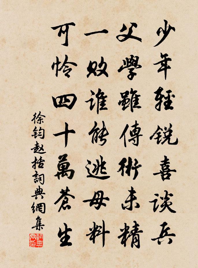 詩詞名句歷史字典書法欣賞書法字典國語詞典說文解字康熙字典古漢語字典標 題 作 者 詩 句 趙括作者:徐鈞 朝代:宋代趙括原文少年輕銳喜談兵,父學雖傳術未精。一敗誰能逃母料,可憐四十萬蒼生。詩詞問答問:趙括的作者是誰?答:徐鈞問:趙括寫於哪個朝代?答:宋代徐鈞趙括書法欣賞趙括書法作品詩詞推薦和錢學士喜雪王安石〔宋代〕手把詩翁憶雪詩,坐愁窮海瘴煙霏。誰令天上蒼茫合,忽見空中散漫飛。閶闔與風生氣勢,姮娥交月借光輝。山鴉和虞使君賦山茶花二首程公許〔宋代〕梅花蘸碧江當,似怪高人金玉音。詠絮可憐清寡伴,冠霞來與共論心。定知名迫瓊瑤響,莫情杯浮琥珀深。姑射清浣溪沙 夏日善住〔元代〕簾卷薰風夏日長。幽庭脈脈橘花香。閒看稚子引鴛鴦。四月雨涼思御夾,三吳麥秀欲移秧。不知身在水雲鄉。草衣木食釋文珦〔宋代〕草衣而木食,老子樂在內。身似玄空雲,蹤跡了無礙。雙松亦孤高,青青遠為封。富貴不須論,本非吾所愛。漫興九首方回〔宋代〕洶洶戰場元不懼,恓恓貧巷亦無憂。千金浪費如泥土,今日何人識故侯。釋老六言十首劉克莊〔宋代〕道家事頗恍惚,稗官書多詼諧。帝居非若溷也,天上豈有廁哉。送邵懷英赴召張栻〔宋代〕自君之西來,吾徒獲三益。匪惟欣晤言,望見意已適。俯仰歲再更,交情共金石。翩然別我去,寧復得此客。諸公郊廟歌辭。太清宮樂章。序入破第一奏佚名〔唐代〕真宗開妙理,沖教統清虛。化演無為日,言昭有象初。瑤台肅靈瑞,金闕映仙居。一奏三清樂,長回八景輿。陳伯比和回字複次韻晁補之〔宋代〕下里馮生寧屑去,湖海陳侯猶肯來。詩書好在家四壁,蒲柳蓊然城一隈。騎上下山亦疏矣,鰷從容出何為哉。市橋偈頌一百四十一首釋師範〔宋代〕九旬今日滿,那事意如何。無為無事人,往往成蹉跎。育王敢道不蹉跎,少年曾決龍蛇陣,老倒還同稚子歌。劉少師妻獻園宅為景靈宮基二首張嵲〔宋代〕中興禮物事彌惇,獻宅那知故事存。當日司徒功業就,舊居亦作奉誠園。句章望之〔宋代〕是水為佳境,中城枕碧湖。樓台萬室近,物象幾州無。蝶戀花 閱周南翁所藏書畫,惜其迂懷雅好,吳存〔元代〕傀儡場中青紫楦。縱有神丹,俗骨無由換。可惜米顛蘇內翰。風標何遠年何短。此日閒窗開寶玩。想見江船,當日黃魯直先王賜帖贊岳珂〔宋代〕賜帖不知其幾,而今猶其一。四印之錯出,百年之湮鬱,神呵鬼護,見此遺物。嗚呼,經固先德之所寓,而匪止於和徐子融韻陳文蔚〔宋代〕自憐涉世每多艱,事一縈心或厭煩。近日工夫可所似,有時慚愧夢中閒。丁亥沔陽春時即事簡吳叔永李曾伯〔宋代〕朝來漸可試春衣,弩末輕寒力已微。木葉未繁山尚瘦,桃花欲落花初肥。疆陲虜逐征鴻去,庭館人隨社燕歸。紫陌石魚湖上醉歌元結〔唐代〕石魚湖,似洞庭,夏水欲滿君山青。山為樽,水為沼,酒徒歷歷坐洲島。長風連日作大浪,不能廢人運酒舫。我持新竹韓愈〔唐代〕筍添南階竹,日日成清閟。縹節已儲霜,黃苞猶掩翠。出欄抽五七,當戶羅三四。高標陵秋嚴,貞色奪春媚。稀生首尾吟邵雍〔宋代〕堯夫非是愛吟詩,詩是堯夫喜老時。明著衣冠為士子,高談仁義作男兒。敢於世上明開眼,肯向人間浪皺眉。六十凍頭王氏藝芳堂周必大〔宋代〕一聞編簡香,如入芝蘭室。況將百尺樓,高貯三萬帙。清芬藹階庭,賸馥沾黨術。從渠海上夫,顛倒放李赤。名句推薦為君不能禁下而自禁者謂之劫,不能飾下而自飾者謂之亂,不節下而自節者謂之貧。韓非及後人《韓非子·難三》 野橋梅幾樹,並是白紛紛。洪升《雪望》 又莫是東風逐君來,便吹散眉間一點春皺蘇軾《洞仙歌·詠柳》 淚眼不曾晴,眉黛愁還聚游次公《卜運算元·風雨送人來》 忽大風起,塵氣莽莽然,城市依稀而已。蒲松齡《山市》 登鸞車,侍軒轅,遨遊青天中,其樂不可言。李白《飛龍引二首·其一》 南渡君臣輕社稷,中原父老望旌旗。趙孟頫《岳鄂王墓》 念天地之悠悠,獨愴然而涕下。陳子昂《登幽州台歌》 蕙風如薰,甘露如醴。左思《三都賦》 我欲乘槎,直窮銀漢,問津深入。許有壬《水龍吟·過黃河》