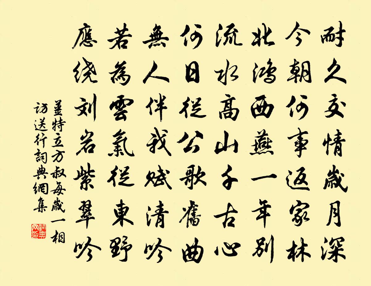詩詞名句歷史字典書法欣賞書法字典國語詞典說文解字康熙字典古漢語字典標 題 作 者 詩 句 方叔每歲一相訪送行作者:姜特立 朝代:宋代方叔每歲一相訪送行原文耐久交情歲月深,今朝何事返家林,北鴻西燕一年別,流水高山千古心。何日從公歌舊曲,無人伴我賦清吟。若為雲氣從東野。應繞劉岩紫翠吟。詩詞問答問:方叔每歲一相訪送行的作者是誰?答:姜特立問:方叔每歲一相訪送行寫於哪個朝代?答:宋代姜特立方叔每歲一相訪送行書法欣賞方叔每歲一相訪送行書法作品詩詞推薦次韻王宣義見過夜飲四絕毛滂〔宋代〕肯為張卿貴作奴,不嫌喚客手攜壺。全勝一葉唯茶灶,未負黃公賣酒壚。晚日程公許〔宋代〕西崦落照暈金鉦,斂退痴雲作嫩晴。忽忽暝煙行十里,前頭燈火是鵑城。比以拙詩戲調張籍不知作者已盈軸矣輒矣輒和鄭清之〔宋代〕展也虞朝遮績熙,合修厥貢暨熊貍。兕容於野雖非地,豹澤其文似識時。毛革正須供有用,血牙安事殺為嬉。國僑西江張耒〔宋代〕拂瓦輕霜鉛粉輕,東南日出竹窗明。小樓下見西江水,日日風光無限情。【南呂】一枝花_贈小園春些薛昂夫〔元代〕贈小園春些些並蒂紅,指指連枝翠。慳慳金谷路,窄窄五陵溪。一片段預告飛,泄漏春訊息。舞盤中歌扇底,颳得盡風送日侍者游兩府兼柬丁仲容先生王冕〔元代〕知君汗漫饒清興,東府西州路不多。牛斗正臨吳分野,城池還帶舊山河。春風揚子江頭去,夜月茅山石畔過。若見望月懷江上舊遊雍陶〔唐代〕往歲曾隨江客船,秋風明月洞庭邊。為看今夜天如水,憶得當時水似天。贈衡山侯霖樂雷發〔宋代〕家住衡山茗塢深,軒轅道士是知音。窊尊酒好聊同醉,石鼎詩難莫浪吟。雨外虺隤寒食路,花邊格磔故鄉心。卻懷送孫十尉溫縣錢起〔唐代〕飛花落絮滿河橋,千里傷心送客遙。不惜芸香染黃綬,惟憐鴻羽下青霄。雲衢有志終驤首,吏道無媒且折腰。急管次韻用學禮許月卿六〔宋代〕章泉姓字馥於梅,宅相相逢亦妙哉。見說章泉詩刻梓,幸分一本洗塵埃。次韻斯遠三十日見寄趙蕃〔宋代〕窗明內晴景,書味真雋永。長年悔遠遊,紛蠹幾莫整。子猷調固疏,竹可一日無。看渠姿爾瘦,瘦而何用腴。因茲送楊敬之倅湖南李涉〔唐代〕久嗟塵匣掩青萍,見說除書試一聽。聞君卻作長沙傅,便逐秋風過洞庭。次余仲庸松風閣韻十九首 其四裘萬頃〔宋代〕不見詩仙何遜來,春風幾度早梅開。竹籬茅舍自清絕,未用移根東閣栽。正月盡山間梅花猶有未放者方岳〔宋代〕南枝寒盡著花遲,入我新年第一詩。明月向人應有語,老天於物本無私。自通之後誰相得,未雪以前春不知。盡讓除日張子容〔唐代〕臘月今知晦,流年此夕除。拾樵供歲火,帖牖作春書。柳覺東風至,花疑小雪餘。忽逢雙鯉贈,言是上冰魚。第一冬夜戲書陸游〔宋代〕東歸剡曲寄彷徉,閒日雖冬亦自長。梅瘦有情橫淡月,雲輕無力護清霜。長魚通印鹽花白,珍鮓披綿麴糝香。一飽偕張總乾章帥機同游檀溪登極目和韻李曾伯〔宋代〕底須風景嘆新亭,且聽樽前賤子陳。拚卻玉山頹綠醑,莫將銀海眩黃塵。山容似畫屏環立,世事如棋局幾新。惟有和僧碧泉三首胡宏〔宋代〕人似春花自在開,本無根蒂孰栽培。一番零亂一番長,不是前花去又回。滿江紅佚名〔宋代〕好景欣逢,須記取、小陽春暖。算夜來浹日,今朝生旦。對此稱觴春酒獻,郁蔥佳氣琴堂滿。問使君、記紀絳人年和沈仲一北湖十詠粹白堂陳傅良〔宋代〕欲來花底竟差池,我有佳名誰與歸。翌日看花天一色,狐裘猶自織寒機。名句推薦心心視春草,畏向階前生。王維《雜詩三首 / 雜詠三首》 夜雪初霽,薺麥彌望。姜夔《揚州慢·淮左名都》 春雪滿空來,觸處似花開。東方虬《春雪》 風無纖埃,雨無微津。左思《三都賦》 夜深風竹敲秋韻,萬葉千聲皆是恨。歐陽修《玉樓春·別後不知君遠近》 中軍置酒飲歸客,胡琴琵琶與羌笛。岑參《白雪歌送武判官歸京》 天山雪後海風寒,橫笛偏吹行路難。李益《從軍北征》 功者難成而易敗,時者難得而易失也。司馬遷《史記·七十列傳·淮陰侯列傳》 朝聞遊子唱離歌,昨夜微霜初渡河。李頎《送魏萬之京》 悲歌可以當泣,遠望可以當歸。佚名《悲歌》