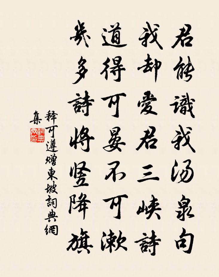 詩詞名句歷史字典書法欣賞書法字典國語詞典說文解字康熙字典古漢語字典標 題 作 者 詩 句 贈東坡作者:釋可遵 朝代:宋代贈東坡原文君能識我湯泉句,我卻愛君三峽詩。道得可晏不可漱,幾多詩將豎降旗。詩詞問答問:贈東坡的作者是誰?答:釋可遵問:贈東坡寫於哪個朝代?答:宋代釋可遵贈東坡書法欣賞贈東坡書法作品詩詞推薦連日酷暑異常攄悶而作晁說之〔宋代〕寒暑平分,東南之徼,何多暍哉。遠望炎洲,近觀火井,相與朝燼而夕灰。名曰冰紈霜練,服之一縷如十襲,而信讀蘇叔黨汝州北山雜詩次其韻陸游〔宋代〕寓形百年中,如臂屈伸頃;少壯幾何時,已復墮衰境。老人喜自潔,臨澗漱綠淨。佛龕香事已,僧缽供煮餅。山茶恩門致書遠及山居因獻之杜荀鶴〔唐代〕時難轉覺保身難,難向師門欲繼顏。若把白衣輕易脫,卻成青桂偶然攀。身居劍戟爭雄地,道在乾坤未喪間。必許渭河道中 其四王冕〔元代〕海氣團雲白,江風吹浪寒。飛鴻離塞遠,獨鶴唳更闌。慷慨論時事,羈棲笑楚冠。蕭蕭黃葉下,回首望長安。句曹緯〔宋代〕登臨獨立時。謝易實甫再惠廬山三峽泉張之洞〔清代〕江城炎燥 無風,忽有甘泉藥病翁。篇酌一家俱滿腹,勞人堪傲贊皇公。七月十七日夜翫月舒岳祥〔宋代〕遲月呼不出,海氣紅碧噓。何人捧隋璧,上處青松疏。松間著不得,飛徹萬里衢。散作千山雪,蘆花搖江湖。冰輪為王師宣子壽釋寶曇〔宋代〕風入床琴帝夢闌,蓬萊為輟老仙官。袖曾有縛於菟手,頭不須簪獬豸冠。桃李無言民自樂,冰霜折指吏應寒。西京偈六十九首釋道寧〔宋代〕歷歷分明,堂堂顯露。師子翻身,象王回顧。若能這裡會觀瞻,瞥轉玄關無別事。春山伴侶圖唐寅〔明代〕春山伴侶兩三人,擔酒尋花不厭頻。好是泉頭池上石,軟莎堪坐靜無塵。十和賀太淵得雄二首劉克莊〔宋代〕鬱鬱蔥蔥初抱送,驚驚怕怕永銷除。子瞻要待啼時看,介甫曾夸畫不如。先敞高門容駟馬,旋聞別館戲羊車。中庸放言十首黃庭堅〔宋代〕微雲起膚寸,大蔭彌九州。至仁雖愛物,用舍如春秋。晴空不成雨,遠岫行歸休。何疑陶淵明,一去如驚鷗。攝事齋宮偶書歐陽修〔宋代〕齋宮岑寂偶偷閒,猶覺閒中興未闌。美酒清香銷晝景,冷風殘雪作春寒。丹心未死惟憂國,白髮盈簪盍掛冠。誰為秋夜二首王安石〔宋代〕客臥書顛倒,蟲鳴坐寂寥。殘燈生暗暈,重露集寒條。真樂閒尤見,深禪靜更超。此懷無與晤,擁鼻一長謠。禪悅二首·其二張問陶〔清代〕門庭清妙即禪關,枉費黃金去買山。只要心光如滿月,在家還比出家閒。七夕二首劉禹錫〔唐代〕河鼓靈旗動,嫦娥破鏡斜。滿空天是幕,徐轉斗為車。機罷猶安石,橋成不礙槎。誰知觀津女,竟夕望雲涯。天衢醉中天王鼎〔元代〕彈破莊周夢,兩翅駕東風。三百座名園一采一個空,難道是風流孽種?唬殺尋芳的蜜蜂。輕輕扇動,把賣花人掮過送道士侄歸池陽韓翃〔唐代〕銀角桃枝杖,東門贈別初。幽州尋馬客,灞岸送驢車。野飯秋山靜,行衣落照餘。燕南群從少,此去意何如。泉州惠安縣迎藏經請小參偈釋宗杲〔宋代〕稽首十力大導師,三界獨尊無比況。示現成佛 * ,廣演無邊契經海。眾生心想念念殊,所 * 亦差別。 * 晝睡邵雍〔宋代〕晝睡功夫未易偕,羲皇以上合安排。心間無事飽食後,園裡有時閒步回。未午庭柯鶯屢囀,已殘花徑客稀來。請觀名句推薦滿園花菊鬱金黃,中有孤叢色似霜。白居易《重陽席上賦白菊》 千淘萬漉雖辛苦,吹盡狂沙始到金。劉禹錫《浪淘沙九首》 問訊湖邊春色,重來又是三年。張孝祥《西江月·問訊湖邊春色》 講性命之學者,不可無經濟之才。王永彬《圍爐夜話·第二六則》 父母威嚴而有慈,則子女畏慎而生孝矣。顏之推《顏氏家訓·教子篇》 中夜四五嘆,常為大國憂。李白《經亂離後天恩流夜郎憶舊遊書懷贈江夏韋太守良宰》 迢迢牽牛星,皎皎河漢女。佚名《迢迢牽牛星》 鴻雁不堪愁里聽,雲山況是客中過。李頎《送魏萬之京》 攀出牆朵朵花,折臨路枝枝柳。關漢卿《一枝花·不伏老》 匝路亭亭艷,非時裛裛香。李商隱《十一月中旬至扶風界見梅花》