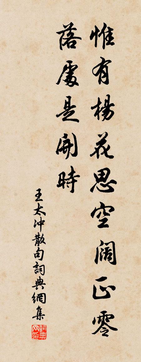 詩詞名句歷史字典書法欣賞書法字典國語詞典說文解字康熙字典古漢語字典標 題 作 者 詩 句 句作者:王太沖 朝代:宋代句原文惟有楊花思空闊,正零落處是開時。詩詞問答問:句的作者是誰?答:王太沖問:句寫於哪個朝代?答:宋代王太沖句書法欣賞句書法作品詩詞推薦卜運算元黃公度〔宋代〕薄宦各東西,往事隨風雨。先自離歌不忍聞,又何況、春將暮。愁共落花多,人逐征鴻去。君向瀟湘我向秦,後會酬王六霽後書懷見示張九齡〔唐代〕雲雨俱行罷,江天已洞開。炎氛霽後滅,邊緒望中來。作驥君垂耳,為魚我曝鰓。更憐湘水賦,還是洛陽才。鶯鶯歌(一作東飛伯勞西飛燕歌,為鶯鶯作)李紳〔唐代〕伯勞飛遲燕飛疾,垂楊綻金花笑日。綠窗嬌女字鶯鶯,金雀婭鬟年十七。黃姑上天阿母在,寂寞霜姿素蓮質。門掩詠興善寺佛殿災李榮〔唐代〕道善何曾善,言興且不興。如來燒赤盡,惟有一群僧。述懷梁意娘〔宋代〕蹤跡浮萍落五湖,一番相別一番疏。不知此去從何處,還許春風得見無。被旨祈禱數至天竺珪僧錄法文白雲堂詩為賦唐許及之〔宋代〕白雲峰下白雲堂,堂上高人一辨香。繞殿持經山四合,繚牆行道木千章。眾生示免嬰時苦,大士寧能與世忘。祈雨琴易士達〔宋代〕花間橫膝興何深,流水高山幾古今。一自杏壇聲響絕,不知誰解繼遺音。戍卒說沉黎事有感陸游〔宋代〕亭障曾無閱歲寧,頻聞夷落犯王靈。孤城月落冤魂哭,百里風吹戰血腥。瘴重厭看茅葉赤,春殘不放柳條青。焦頭靜江歸舟中讀書張栻〔宋代〕南風駕小雨,群山淨如沐。吾歸及新涼,所歷慰心目。軋軋柔櫓鳴,臥見山起伏。推枕意悠然,還取我書讀。平生自尉氏南至京皆水及人脛梅堯臣〔宋代〕陸行畏水深,舟行畏水淺。河流去時合,塗潦歸時踐。事與時相違,我慚行處蹇。人生莫為客,為客此安免。驀溪山(寄寶學)劉子翬〔宋代〕浮煙冷雨,今日還重九。秋去又秋來,但黃花、年年如舊。平台戲馬,無處問英雄;茅舍底,竹籬東,佇立時搔首題汪水雲詩十首羅志仁〔宋代〕斜陽葛嶺少人行,一片荒山系廢興。留得臨湖春雨觀,東風搖落木香棚。鷓鴣天 鶴林寺李齊賢〔元代〕夾道修篁接斷山。小橋流水走平田。雲間無處尋黃鶴,雪裡何人聞杜鵲。夸富貴,慕神仙。到頭還是夢悠然。僧窗呈萬菴十章爐鼎白玉蟾〔宋代〕須信先天事事無,陰陽陶鑄此形模。真空平等硃砂鼎,虛徹靈通偃月爐。九竅可風壇墠暖,二時失火藥材枯。只茲唐州東途作竇鞏〔唐代〕綠林兵起結愁雲,白羽飛書未解紛。天子欲開三面網,莫將弓箭射官軍。別韋少府李白〔唐代〕西出蒼龍門,南登白鹿原。欲尋商山皓,猶戀漢皇恩。水國遠行邁,仙經深討論。洗心向溪月,清耳敬亭猿。築室秋日小雨後作宋庠〔宋代〕晚陌收殘雨,高軒冒夕霏。風乾移舊鄉,月破隱空圍。敗葉相將舞,寒雲不肯飛。興無潘掾筆,何術寫心微。至日用張伯舉韻仇遠〔宋代〕博士先氈臥冷齋,有朋喜自遠方來。臘前一信春先到,隴首數枝梅已開。少忍少荒須辟穀,尚遲酒禁且銜杯。山中偶作連文鳳〔宋代〕春風躍馬看花時,肯作秋風鬢易衰。富貴百年皆長物,老來方悔讀書遲。點絳唇(壽)姜夔〔宋代〕祝壽筵開,畫堂深映花如繡。瑞煙噴獸。簾幕香風透。一點台星,化作人間秀。韶音奏。兩行紅袖。齊勸長生酒。名句推薦有過必悛,有不善必懼左丘明《國語·楚語·藍尹亹論吳將斃》 戚姬髡髮入舂市,萬古共悲辛。李白《中山孺子妾歌》 芝蘭生於深林,不以無人而不芳,君子修道立德,不謂窮困而改節。佚名《孔子家語·在厄》 曉看紅濕處,花重錦官城。杜甫《春夜喜雨》 謙謙君子,卑以自牧佚名《易傳·象傳上·謙》 天有其時,地有其財,人有其治,夫是之謂能參。荀子《荀子·天論》 女也不爽,士貳其行。士也罔極,二三其德。佚名《氓》 不怕官,只怕管。施耐庵《水滸傳·第二回》 綠池落盡紅蕖卻,荷葉猶開最小錢。楊萬里《秋涼晚步》 竹樹帶飛嵐,荇藻俱明麗。劉道著《湘江秋曉》