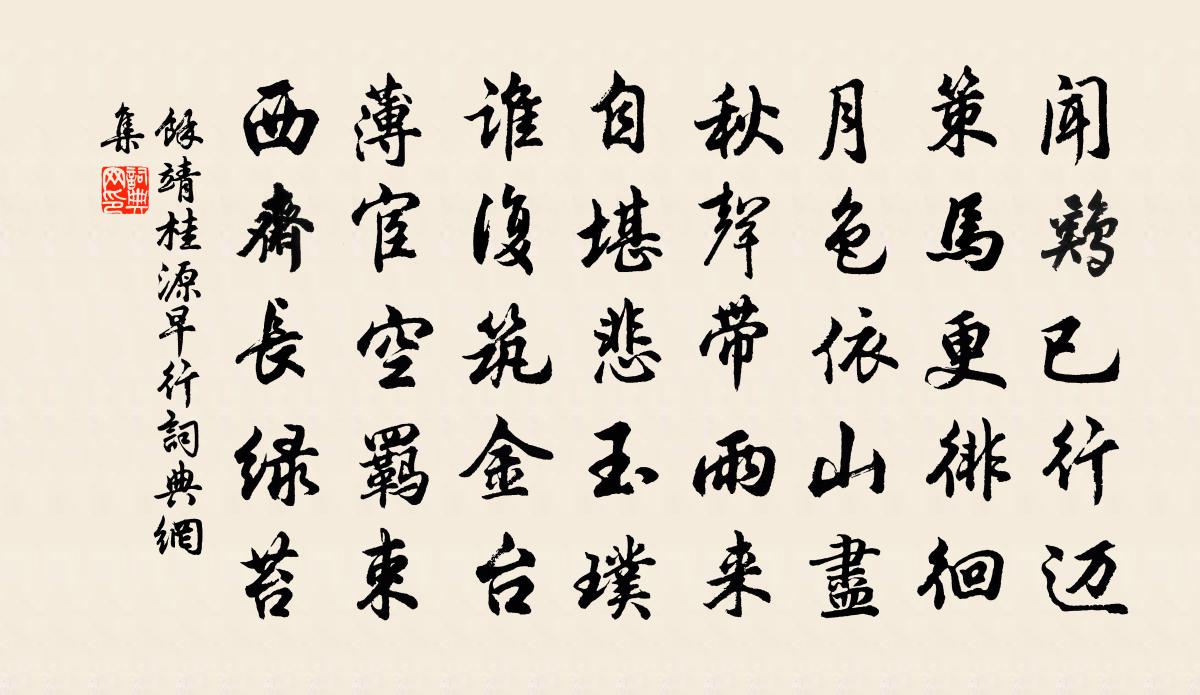 詩詞名句歷史字典書法欣賞書法字典國語詞典說文解字康熙字典古漢語字典標 題 作 者 詩 句 桂源早行作者:余靖 朝代:宋代桂源早行原文聞雞已行邁,策馬更徘徊。月色依山盡,秋聲帶雨來。自堪悲玉璞,誰復築金台。薄宦空羈束,西齋長綠苔。詩詞問答問:桂源早行的作者是誰?答:余靖問:桂源早行寫於哪個朝代?答:宋代余靖桂源早行書法欣賞桂源早行書法作品詩詞推薦思夔州陸游〔宋代〕武侯八陣孫吳法,工部十詩韶頀音。遺磧故祠春草合,略無人解兩公心。野狐釋心道〔宋代〕石崇富貴籛鏗壽,潘岳容儀子建才。但原東風齊著力,一時吹入我門來。禪人並化主寫真求贊釋正覺〔宋代〕明功借位,起幻入塵。百草頭邊有芳信,縱橫指點自家春。容州聞雁胡長卿〔宋代〕舊聞雁不到衡陽,今復南飛入瘴鄉。天闊隨陽皆可去,未應為界限瀟湘。西江月 贈潘道人李道純〔元代〕真土真鉛真汞,元神元氣元清。三元合一藥方成。個是全真上品。動靜虛靈不昧,成全實相圓明。形神俱妙樂無生宿漁浦陸游〔宋代〕東歸剡曲只三程,旅泊還如萬里行。燈影動搖風不定,船聲鼞鞳浪初生。曳裾非復白頭事,瞑目那求青史名。歸去送吳促庶待制出守長沙王珪〔唐代〕畫船催鼓送將行,一醉離觴下玉京。延閣漏間空紫橐,洞庭波起獵紅旌。曾冠獬廌奸回讋,卻佩龍泉種落驚。莫向比觀仲結諸公課會皆勍敵也行就舉南宮作此贈李流謙〔宋代〕文章末流乃科舉,剽東掠西何等語。得者矜誇失者羞,其中往往分賢否。一官生涎償不勉,譬之北轅求適楚。諸君頌古一百首釋智愚〔宋代〕此行莫擬幾時回,此去應須到五台。若過曼殊放光處,殷勤為我記歸來。玉樓春·紅酥肯放瓊苞碎李清照〔宋代〕紅酥肯放瓊苞碎。探著南枝開遍未。不知醞藉幾多香,但見包藏無限意。道人憔悴春窗底。悶損闌乾愁不倚。要來故太師和王輓詩三首韓元吉〔宋代〕宿衛登環尹,榮思四十春。威名傳瀚海,功烈上麒麟。卻敵凝山嶽,臨機妙鬼神。中興奉朝請,勞舊總無人。覓句張鎡〔宋代〕覓句先須莫苦心,從來瓦注勝如金。見成若不拈來使,箭已離弦作麽尋。偶作釋重顯〔宋代〕列岫霽新雨,憑欄祇澹交。夕陽明遠水,秋葉露空巢。思極曾無玷,神清未動爻。祇應千古意,誰得共雲坳。趙寶學輓詞二首林季仲〔宋代〕珠海光無盡,瑤山氣自溫。鴻基開烈祖,餘慶襲賢孫。妙墨潛虬動,雄詞駭浪翻。九重應震悼,同性失毛原。深村韓偓〔唐代〕甘向深村固不材,猶勝摧折傍塵埃。清宵玩月唯紅葉,永日關門但綠苔。幽院菊荒同寂寞,野橋僧去獨裴回。隔籬次韻和王員外雜游四韻吳融〔唐代〕一分難減亦難加,得似溪頭浣越紗。兩槳慣邀催去艇,七香曾占取來車。黃昏忽墮當樓月,清曉休開滿鏡花。誰見五貺詩訶陵樽皮日休〔唐代〕一片鱟魚殼,其中生翠波。買須能紫貝,用合對紅螺。盡瀉判狂藥,禁敲任浩歌。明朝與君後,爭那玉山何。冬日觀河清馬世德〔宋代〕邑宰崇明祀,侵晨苦見邀。未能乘快騎,且復御輕軺。瑞應黃流碧,晴清戾氣消。今朝風日暖,臨水且逍遙。辛未中元記夢夢與一僧談世事良久問答中有凡五邁〔宋代〕世人慾不死,焚香事大羅。死後欲超生,將身靠彌陀。個裡不透徹,仙佛如子何。我素不持戒,焉能斷膽臊。獨有趙紫芝運乾陳起〔宋代〕陋室與高門,東西互接畛。相聚雖不稠,相別殊難忍。風帆去程遙,到時秋未盡。少試裨畫材,計台作標準。恨無名句推薦壯心未與年俱老,死去猶能作鬼雄。陸游《書憤五首·其二》 香消翠減,雨昏煙暗,芳草遍江南。喬吉《小桃紅·春閨怨》 興,百姓苦;亡,百姓苦!張養浩《山坡羊·潼關懷古》 檳榔無柯,椰葉無陰。左思《三都賦》 雲雨朝還暮,煙花春復秋。李珣《巫山一段雲·古廟依青嶂》 酌酒以自寬,舉杯斷絕歌路難。鮑照《擬行路難·其四》 人不博覽者,不聞古今,不見事類,不知然否,猶目盲、耳聾、鼻癰者也。王充《論衡·卷十三·別通篇》 舍南舍北皆春水,但見群鷗日日來。杜甫《客至》 山光悅鳥性,潭影空人心。常建《題破山寺後禪院》 嗟險阻,嘆飄零。關山萬里作雄行。劉克莊《玉樓春·戲林推》