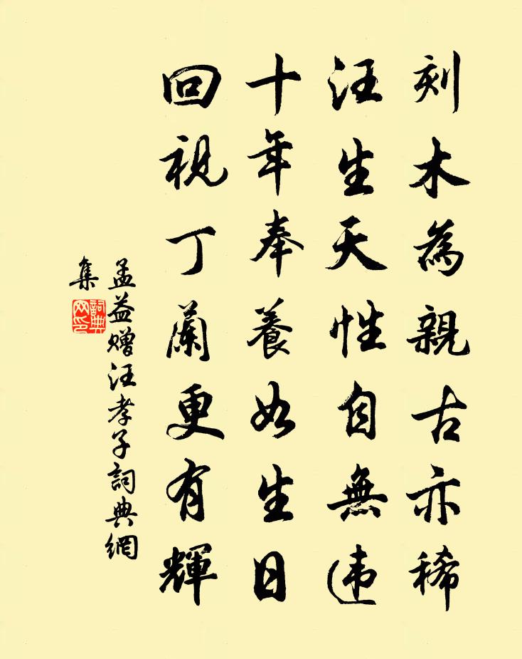 詩詞名句歷史字典書法欣賞書法字典國語詞典說文解字康熙字典古漢語字典標 題 作 者 詩 句 贈汪孝子作者:孟益 朝代:宋代贈汪孝子原文刻木為親古亦稀,汪生天性自無違。十年奉養如生日,回視丁蘭更有輝。詩詞問答問:贈汪孝子的作者是誰?答:孟益問:贈汪孝子寫於哪個朝代?答:宋代孟益贈汪孝子書法欣賞贈汪孝子書法作品詩詞推薦高宗聖神武文憲孝皇帝輓詩二首楊萬里〔宋代〕更造今光武,中興昔武丁。雲昭河洛畫,天作典謨經。立極餘三紀,頤神再一星。堯山鄰禹穴,松雪蔚爭青。造橋道者並諸化土寫求釋慧空〔宋代〕咄這老凍齈,是甚麼面孔。似馬頭又圓,謂驢耳不聳。有毒鱉鼻蛇,無底破漆桶。遍處持來攪聒人,十分是個滅胡游龍光寺胡大成〔宋代〕香宇依空結,虛軒傍水開。沙明鴻影度,逕靜竹風來。午磬傳清梵,晴花點綠苔。寥寥人境外,宴坐送餘杯。詠螃蟹朱貞白〔宋代〕蟬眼龜形腳似蛛,未嘗正面向人趨。如今飣在盤筵上,得似江湖亂走無。峨眉山廨趙汝回〔宋代〕褐衣蔬食苦吟身,肌骨雖清鬢雪新。栗里未營三畝宅,桃源已過一年春。也知官職難痴望,化得妻兒不誶貧。別寫哭趙清之崔與之〔宋代〕天南□□□重臨,遺愛猶存蔽□陰。鼓角三城新令肅,袴襦萬井舊恩深。養民但積和平福,蒞事常持敬簡心。遠業李夫人歌鮑溶〔唐代〕璿閨羽帳華燭陳,方士夜降夫人神。葳蕤半露芙蓉色,窈窕將期環珮身。麗如三五月,可望難親近。顰黛含犀竟不和友人盤石寺逢舊友溫庭筠〔唐代〕楚寺上方宿,滿堂皆舊遊。月溪逢遠客,煙浪有歸舟。江館白蘋夜,水關紅葉秋。西風吹暮雨,汀草更堪愁。移頓六韻乾隆〔清代〕逐水頻移頓,曾無廿里賒,建營今似昨,取勢正還斜。壘或多因舊,灶無須更加,賣蒸原有市,換馬要增茶。內外講徹禮記崇政殿開宴應制夏竦〔宋代〕幄坐尊儒術,華光御講筵。爰開柏梁宴,為畢曲台篇。法從飛緌接,藩房綺組聯。賜花均彩萼,陪鼎雜冬鮮。甘潤送鄭秀才歸寧張籍〔唐代〕桂楫彩為衣,行當令節歸。夕潮迷浦遠,晝雨見人稀。野芰到時熟,江鷗泊處飛。離琴一奏罷,山雨靄餘暉。次韻和吳沖卿傷何濟川梅堯臣〔宋代〕生愛虛名苦辯亡,淪精竭智可哀傷。誰將事附三公傳,自有文夸古戰場。墳土未乾還卜穴,挽聲才絕又新章。是非賢者之孝二百四十首茅容林同〔宋代〕雞乃為母設,蔬惟與客同。賢哉茅季偉,誤矣郭林宗。題扇七首陳造〔宋代〕東絹須題黃絹辭,老來斲句不能奇。定知爍石流金日,記我持觴賞雪時。對李花懷斯遠並屬無愧季奕趙蕃〔宋代〕桃花未發李生花,裝點林居亦自佳。但恨無人領張徹,乘雲共到玉川家。鷓鴣天·一夜冰澌滿玉石孝友〔宋代〕一夜冰澌滿玉壺。五更喜氣動洪爐。門前桃李知麟集,庭下芝蘭看鯉趨。泉脈動,草心蘇。日長添得繡工夫。試詢緣識宋太宗〔宋代〕知靜求難靜,忙心不可閒。艷陽天地熱,思暮日銜山。偶成黃敏求〔宋代〕熨開詩眼靜中觀,春在虛無杳靄間。風老山攀香世界,日烘躑躅錦屏山。峙糧備歲蜂開戶,堅壁防春燕抱關。不被嘉魚界中作孔武仲〔宋代〕楚澤秋窮未有霜,飄然如雁去隨陽。連空積藹湖天闇,極目無人水國荒。破浪不須論萬里,佩蘭聊欲寄三湘。駝裘霜風王同祖〔宋代〕一夜霜風動地寒,塞垣火未報平安。嫦娥亦帶傷心色,為照征人尚抱鞍。名句推薦山甫歸應疾,留侯功復成。張九齡《奉和聖制送尚書燕國公赴朔方》 一去隔絕國,思歸但長嗟。李白《千里思》 落日照大旗,馬鳴風蕭蕭。杜甫《後出塞五首》 外游者,求備於物;內觀者,取足於身。列子及其弟子《列子·仲尼》 算遺蹤、猶有枕囊留,相思物。吳文英《滿江紅·劉朔齋賦菊和韻》 夜來能有幾多寒,已瘦了、梨花一半。黃升《鵲橋仙·春情》 辛勤好似蠶成繭,繭老成絲蠶命休。馮夢龍《醒世恆言·卷三十五》 碧玉妝成一樹高,萬條垂下綠絲絛。賀知章《詠柳 / 柳枝詞》 孤花片葉,斷送清秋節。納蘭性德《清平樂·孤花片葉》 黃葉覆溪橋,荒村唯古木。柳宗元《秋曉行南谷經荒村》