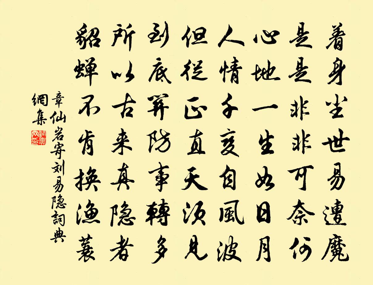詩詞名句歷史字典書法欣賞書法字典國語詞典說文解字康熙字典古漢語字典標 題 作 者 詩 句 寄劉易隱作者:章仙岩 朝代:宋代寄劉易隱原文著身塵世易遭魔,是是非非可奈何。心地一生如日月,人情千變自風波。但從正直天須見,到底關防事轉多。所以古來真隱者,貂蟬不肯換漁蓑。詩詞問答問:寄劉易隱的作者是誰?答:章仙岩問:寄劉易隱寫於哪個朝代?答:宋代章仙岩寄劉易隱書法欣賞寄劉易隱書法作品詩詞推薦摸魚子許有壬〔元代〕買陂塘旋載楊柳,年來於此承務。涼台燠館吾何有,聊芘一時風雨。洲映渚。向一片煙波,鼎峙嵯峨嶼。盤空硬語贈琴僧釋重顯〔宋代〕太古清音發指端,月當松頂夜堂寒。悲風流水多嗚咽,不聽希聲不用彈。哭趙紫芝劉克莊〔宋代〕奪到斯人處,詞林亦可悲。世間空有字,天下便無詩。盡出香分妓,惟留硯付兒。傷心湖上冢,誰葬復誰碑。安厚卿樞密母夫人輓詞二首蘇轍〔宋代〕家起側微中,身兼富貴終。慈仁本宜壽,勤約自成風。大府寧居久,名邦賜沐雄。共傳生子福,仍指讀書功。早歲和周少晳詠梅韻五首廖行之〔宋代〕孤根應得暖先回,天惜花房遣護開。早是冰肌自清絕,卻因冠玉更奇瑰。簡單周二子胡寅〔宋代〕回首清明遠矣哉,和風還挾禊辰來。麗人空憶行歌樂,曲水難追翰墨才。鬢髮飄蕭吾自祓,形骸放蕩孰相開。早知狀江南。孟春鮑防〔唐代〕江南孟春天,荇葉大如錢。白雪裝梅樹,青袍似葑田。虎丘寺路宴劉禹錫〔唐代〕青林虎丘寺,林際翠微路。立見山僧來,遙從鳥飛處。茲峰淪寶玉,千載惟丘墓。埋劍人空傳,鑿山龍已去。捫蘿汴河雨後呈同行馬秘書梅堯臣〔宋代〕雨霽晚虹收,河堤淨如掃。清陰拂人樹,翠色垂流草。漢漕走王都,華言雜夷獠。時方同馬生,野泊聊論道。題謝先生白雲庵曹道沖〔宋代〕桃源洞口武陵人,跳出紅塵二十春。但喜白雲深有趣,不知青眼近來親。丹砂已向坤爐伏,玉汞從坎鼎烹。活計一謝蘊文承議陽關圖晁說之〔宋代〕邂逅故人逃難處,王孫氣象獨昇平。詩吟摩詰如無味,畫到陽關別有情。過長峰逕遇雨,遣悶十絕句楊萬里〔宋代〕出得山來未見村,已知村近稍多田。坐看雲腳都垂地,回望峰頭已入天。南歌子佚名〔宋代〕有同年傅景仁長短句,走筆次韻,既抵嶠南,回首野處,後會之期未卜也。因鍥石湘灕江上,以寓萬里之思雲。紹烈女李三行胡天游〔清代〕大海何漫漫,千年不能移。太山自言高,精衛銜石飛。朝見精衛飛,暮見精衛飛。吐血填作塸,一旦成路蹊。豈唯寄新息王令藏春塢秦觀〔宋代〕令尹才高寺為空,歲時行樂與民同。旋開小塢藏春色,更制新聲寫土風。客向樽前忘爾汝,路穿花去失西東。無言偈頌六十五首釋普濟〔宋代〕有句無句,如藤倚樹,截鐵斬釘。水不借路,樹倒藤枯。西天鬍子沒髭鬚,蹋殺楊歧三腳驢。玉汝從溧陽來辱李晦庵以詩問訊次韻寄答二首趙蕃〔宋代〕新詩明勝錦,健筆快於錐。工部深陶冶,昌黎雜怪奇。殷勤能寄遠,風俗賴扶衰。屢作挑燈讀,何勝對雨思。石頭答庾郎丹詩何遜〔南北朝〕高樹蔭樓密。細草綠成被。黃鸝隱葉飛。蛺蝶縈空戲。陰岑自爾悅。寂寥予罕寄。相如阻禁闈。何由從簡易。嘲韋鏗佚名〔唐代〕飄風忽起團團旋,倒地還如著腳?。莫怪殿上空行事,卻為元非五品才。楊梅項安世〔宋代〕吾家裡曲修家木,葉如海桐實如谷。聞名謂是金作丸,見面恍驚珠奪目。直將甘軟換嚴酸,坐使筠籠薦金屋。越山名句推薦末俗以繁華相尚,終覺冷淡處趣味彌長。王永彬《圍爐夜話·第 * 則》 一節見則百節知矣。劉向《說苑·尊賢》 憑闌半日獨無言,依舊竹聲新月似當年。李煜《虞美人·風回小院庭蕪綠》 遨歡任落風前帽,促飲爭吹酒上花。宋祁《九日置酒》 鏡水夜來秋月,如雪。溫庭筠《荷葉杯·鏡水夜來秋月》 飛光飛光,勸爾一杯酒。李賀《苦晝短》 憑觴靜憶去年秋,桐落故溪頭。晏幾道《訴衷情·憑觴靜憶去年秋》 心生,種種魔生;心滅,種種魔滅。吳承恩《西遊記·第十三回》 開到荼蘼花事了。曹雪芹《紅樓夢·第六十三回》 不成拋擲,夢裡終相覓。王國維《點絳唇·屏卻相思》