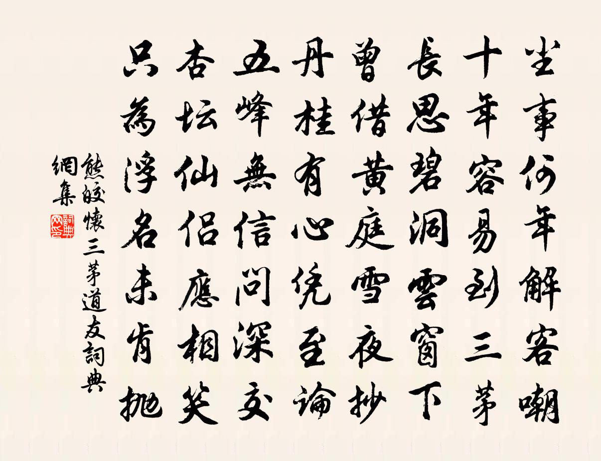 詩詞名句歷史字典書法欣賞書法字典國語詞典說文解字康熙字典古漢語字典標 題 作 者 詩 句 懷三茅道友作者:熊皎 朝代:唐代懷三茅道友原文塵事何年解客嘲,十年容易到三茅。長思碧洞雲窗下,曾借黃庭雪夜抄。丹桂有心憑至論,五峰無信問深交。杏壇仙侶應相笑,只為浮名未肯拋。詩詞問答問:懷三茅道友的作者是誰?答:熊皎問:懷三茅道友寫於哪個朝代?答:唐代問:懷三茅道友是什麼體裁?答:七律熊皎懷三茅道友書法欣賞懷三茅道友書法作品注釋全唐詩:卷737-22詩詞推薦偈頌一百零二首釋紹曇〔宋代〕死柴頭,無煙火。信口一吹,面門爍破。可憐龍門遠知客禮首座。火爐頭熱血相噴,分爭你我,笑倒嵩山破灶墮。鷓鴣天葛勝仲〔宋代〕采采黃花鵠彩濃。吹開一夜為霜風。已邀騷客陶元亮,不用歌妓盛小叢。秋易老,莫匆匆。齊山高興古今同。欲知六州歌頭劉褒〔宋代〕憑深負阻,蜂舞肆奔騰。龍江上,妖氛漲,鯨海外,白波驚。羽檄交飛急,玉帳靜,金韜閟,恢遠馭,振長櫻。密秋館言懷錢起〔唐代〕蟋蟀已秋思,蕙蘭仍碧滋。蹉跎獻賦客,嘆息此良時。日夕雲台下,商歌空自悲。九峰阮閱〔宋代〕九峰深處是禪關,依舊居人說瞭然。一句本來男女話,當時應為灌溪傳。偈頌四十一首釋慧暉〔宋代〕壯月今朝半月明,上來衲子眼睲睲。難瞞眾眼病堂尅,何和洞家兒子情。題謝康樂石門作王徵〔宋代〕吾聞永嘉守,□□□□心。勝跡若猶在,雲澗清且深。綠蘿自蒙密,白日易森沉。□□松篠□,石門□登臨。碧潭失調名佚名〔宋代〕花底傾杯,花影嬌隨人醉。答家朝南二絕洪咨夔〔宋代〕角聲悽惋笛聲乾,獨立黃昏不奈寒。未省半山梅在否,東風歸路憶長乾。渡錢塘二首釋寶曇〔宋代〕潮生西浦未全平,頃刻潮回岸有聲。落日人從官渡去,西風誰識此時情。不如吳越中流盡,贏得江山老眼明。試問紹興以後祀五方帝六十首佚名〔宋代〕[圜鍾為宮]白藏序,庶彙向成。有嚴這時禮,用答幽靈。風馬雲車,來燕來寧。洋洋在上,休福是承。題江山風月樓三首姚勉〔宋代〕風月江山自四時,箇中誰識活天機。會渠結峙融流意,方解吟光弄霽歸。小師惠彰請贊釋惟一〔宋代〕雇我游世間,如雲在天上。任緣而去住,不作去住想。南北信所之,東西無定向。為人少方便,動便攔腮掌。恁地一斛珠(秋閨)秦觀〔宋代〕碧雲寥廓。倚闌悵望情離索。悲秋自怯羅衣薄。曉鏡空懸,懶把青絲掠。江山滿眼今非昨。紛紛木葉風中落。別巢答林逮贄卷因以送行劉克莊〔宋代〕都忘幾桉有華箋,但怪虹光夜屬天。唐律胚胎梨嶺作,古文骨髓艾軒傳。蚤陳董大夫三策,肯覓原夫輩一聯。若過飛仙嶺張先〔宋代〕路接曉天人近月,真仙去後祇雲歸。嶺頭舊曰上升日,空有山禽自在飛。答婦兄林公遇四首劉克莊〔宋代〕挹君如玉雪,未易得親疏。何日深山裡,同燈共讀書。角招 故園舊有老梅數樹,自庚午至庚辰,十邵亨貞〔元代〕年來惟起步月前村之歡。辛巳正月二十四日,曹雲翁以紅萼一權見予,風度絕韻,舊感橫生,念之不置,因綴此闋闕下元夕令領寄大有張詠〔宋代〕月華瀟灑始徘徊,時起平津雅宴開。照座玉山皆俊彩,驚人綺句盡仙才。秋風未泛鴟夷楫,浮世皆登郢隗台。的被閒居雜興十首薛嵎〔宋代〕四時俱橐簽,一氣自迴旋。誰謂春風力,能專萬物權。榮枯忘晦朔,霜雪抱貞堅。賦分有深淺,殊非天道偏。名句推薦茅檐長掃淨無苔,花木成畦手自栽。王安石《書湖陰先生壁》 萬里歸來顏愈少,微笑,笑時猶帶嶺梅香。蘇軾《定風波·南海歸贈王定國侍人寓娘》 學不可以已。荀子《荀子·勸學》 柳葉開銀鏑,桃花照玉鞍。駱賓王《送鄭少府入遼共賦俠客遠從戎》 今夫飛蓬遇飄風而行千里,乘風之勢也。商鞅《商君書·禁使》 帳底吹笙香吐麝,更無一點塵隨馬。蘇軾《蝶戀花·密州上元》 獨抱影兒眠,背看燈花落。汪懋麟《誤佳期·閨怨》 別離在今晨,見爾當何秋。韋應物《送楊氏女》 醉里且貪歡笑,要愁那得工夫。辛棄疾《西江月·遣興》 報答春光知有處,應須美酒送生涯。杜甫《江畔獨步尋花七絕句》