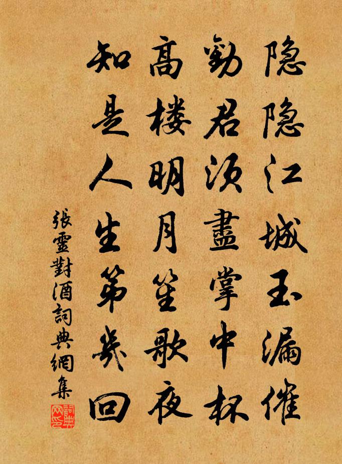 詩詞名句歷史字典書法欣賞書法字典國語詞典說文解字康熙字典古漢語字典標 題 作 者 詩 句 對酒作者:張靈 朝代:明代對酒原文隱隱江城玉漏催,勸君須盡掌中杯。高樓明月笙歌夜,知是人生第幾回。詩詞問答問:對酒的作者是誰?答:張靈問:對酒寫於哪個朝代?答:明代問:對酒是什麼體裁?答:七絕張靈對酒書法欣賞對酒書法作品詩詞推薦偈傾一百六十九首釋智朋〔宋代〕一棒一喝,疾雷破山,一提一唱,崩空峭壁。諸佛傍觀有分,諸祖拈掇不出。只如入已還閉。徽安門曉望歐陽修〔宋代〕都門收宿霧,佳氣鬱◇◇。曉日寒川上,青山白霧中。樓台萬瓦合,車馬九衢通。恨乏登高賦,徒知京邑雄。山齋郭印〔宋代〕我本丘壑姿,脫巾為謀食。隨牒幾推遷,銅章領岩邑。初期竊餘閒,焚香弄書冊。文法何苦多,日力不暇給。訟紙句釋惠崇〔宋代〕江花凌霰發,山溜入池深。鵲橋仙(壽趙帥)李仲光〔宋代〕詩書元帥,風流人物,看取方瞳如漆。銅駝陌上若相逢,當一笑、摩挲金狄。相門事業,中書考第,未數汾陽功績一半兒王鼎〔元代〕鴉瓴般水鬢似刀裁,小顆顆芙蓉花額兒窄。待不梳妝怕娘左猜。不免插金釵,一半兒蓬鬆一半兒歪。掃花游(贈芸隱)吳文英〔宋代〕草生夢碧,正燕子簾幃,影遲春午。倦茶薦乳。看風簽亂葉,老沙昏雨。古簡蟫篇,種得雲根療蠹。最清楚。帶明過彭澤孟郊〔唐代〕揚帆過彭澤,舟人訝嘆息。不見種柳人,霜風空寂歷。送通判黃國博入浙梅堯臣〔宋代〕西風半空鳴且號,吳天點破吳鴻高。東溪車馬走送客,白露衰蘭輕若毛。客當西歸乃東去為何,欲及八月十五夜觀偈頌一百三十六首釋惟一〔宋代〕六年雪嶺竟無成,練得身形似鶴形。盡謂見明星悟道,何曾悟道見明星。入山何富,出山何貧,知心能幾人。發桐廬李彌遜〔宋代〕江盡溪流合,行舟落照催。櫂歌來月浦,帆影上風桅。路轉山容改,潮平水色回。兵戈滿天下,飄泊壯心摧。冬日讀白集愛其貧堅志士節病長高人情之句作陸游〔宋代〕鏡湖有隱者,莫知何許人。出與風月游,居與猿鳥鄰。似生結繩代,或是葛天民。我欲往從之,煙波浩無津。山館對月胡仲弓〔宋代〕山寺聞晨鐘,深省靜中發。展轉睡不成,推窗看明月。和答胡用之孫應時〔宋代〕浪喜功名少壯時,發今種種更奚為。窮通信我心如鐵,謗譽從渠口勝碑。息駕便應追靖節,弄弦寧復待鍾期。燭湖公餘對竹王禹偁〔宋代〕冠褐飄飄戶退公,引吟留坐一叢叢。買添幽景渾無價,洗卻繁陰別有風。曾任雪欺終古綠,也從桃映暫時紅。此君探梅次韻章庭倚李洪〔宋代〕江園試覓去年梅,花下遨遊得暫陪。脈脈早迎南日至,垂垂先放北枝開。江邊牆角添詩興,月落參橫喚夢回。一見句諶祜〔宋代〕花今國在橫浦南,看誰冰雪來同參。入南出南此時節,元佑名卿花底雪。骨香直到桑海翻,花尚永存香豈滅。少年游(十之三·林鐘商)柳永〔宋代〕層波瀲灩遠山橫。一笑一傾城。酒容紅嫩,歌喉清麗,百媚坐中生。牆頭馬上初相見,不準擬、恁多情。昨夜懷闌唐律寄呈父鳳山提舉十首汪元量〔宋代〕夜來夢裡到吾廬,夢破潸然淚似珠。吳女北游簪素柰,湘娥南望泣蒼梧。風吹遠浦秋鴻杳,月出空山夜鶴孤。忽憶過袁村袁說友〔宋代〕在昔有袁村,今到袁村路。峰傍呼父老,同姓亦三數。貴賤本無種,苗裔有疏附。我家建家派,一經立門戶。安用名句推薦秋花冒綠水,密葉羅青煙。李白《古風·其五十九》 貧者士之常也,死者人之終也,處常得終,當何憂哉?列子及其弟子《列子·天瑞》 資之深,則取之左右逢其原。孟子《孟子·離婁章句下·第十四節》 等閒識得東風面,萬紫千紅總是春。朱熹《春日》 人有逆天之時,天無絕人之路。馮夢龍《醒世恆言·卷三十二》 承恩不在貌,教妾若為容。杜荀鶴《 * 怨》 其持之有故,其言之成理。荀子《荀子·非十二子》 民非谷不生。陳壽《三國志·吳書·吳主傳》 卷旗夜劫單于帳,亂斫胡兒缺寶刀。馬戴《出塞詞》 樓上黃昏欲望休,玉梯橫絕月中鉤李商隱《代贈二首》