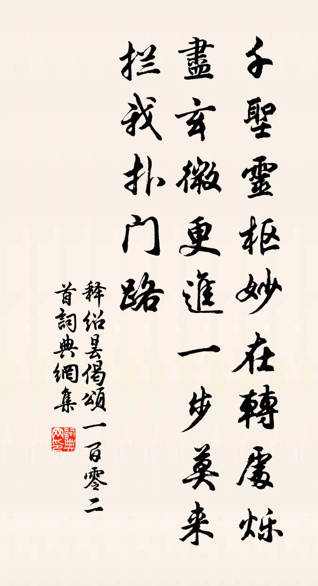 詩詞名句歷史字典書法欣賞書法字典國語詞典說文解字康熙字典古漢語字典標 題 作 者 詩 句 偈頌一百零二首作者:釋紹曇 朝代:宋代偈頌一百零二首原文千聖靈樞,妙在轉處。爍盡玄微,更進一步,莫來攔我撲門路。詩詞問答問:偈頌一百零二首的作者是誰?答:釋紹曇問:偈頌一百零二首寫於哪個朝代?答:宋代釋紹曇偈頌一百零二首書法欣賞偈頌一百零二首書法作品詩詞推薦頌古一百則釋正覺〔宋代〕弦筈相銜,網珠相對。發百中而箭箭不虛,攝眾景而光光無礙。得言句之總,持住遊戲之三昧。妙其間也宛轉偏圓閒十詠仇遠〔宋代〕樹隔殘鍾遠欲無,野雲漠漠雨疏疏。飛蚊盡逐南風去,父子燈前共讀書。贈蕊珠侍經潘常吉白玉蟾〔宋代〕一點紅塵惹人心,蘂珠殿上墮遺簪。當時同降瑤台路,只是於今鼓鶴林。夢到人間不知退,夜夜窗下調玉琴。笑指次韻謝張安撫以詩送梅實項安世〔宋代〕夢隨清淺看扶疏,軍將敲門報疾驅。此解可辭兒女笑,使君風味似寒儒。南山羅漢贊十六首黃庭堅〔宋代〕佛光影中大杜多,八萬細行滅塵勞。愛護有情如眼目,胡奴來供濾水囊。手持白拂起清風,奉持所聞佛直指。小根寒食雨霽曾協〔宋代〕亂雲將雨趁狂風,掃溉氛埃瞬息中。指點山川開淨綠,按行花草失欹紅。槐榆改火年年事,簫鼓迎神處處同。自是立秋日登樂遊園白居易〔唐代〕獨行獨語曲江頭,回馬遲遲上樂游。蕭颯涼風與衰鬢,誰教計會一時秋?句吳光〔宋代〕人情不似溪流水,不改當時枕上聲。至正戊戌九日感懷葉顒〔元代〕風急登高野客傷,悲笳聲里過重陽。正須擊劍論《孤憤》,何暇攜壺舉一觴!白骨不埋新戰恨,黃花空發舊枝香。偈頌六十八首釋法薰〔宋代〕秋聲滿林壑,秋雨滴梧桐。門外未歸客,飄泊在途中。歸也,歸也,通身白汁,下載清風。玉抱肚楊無咎〔宋代〕同行同坐。同攜同臥。正朝朝暮暮同歡,怎知終有拋嚲。記江皋惜別,那堪被、流水無情送輕舸。有愁萬種,恨未寄里中諸友賞菊二首姜特立〔宋代〕問訊故園今若何,不堪歸計尚蹉跎。只應許下千叢菊,今歲雨勻花更多。乾道聖德頌曹勛〔宋代〕維聖有作,紹隆興運。天經地義,宗堯越舜。風俗惇厚,日星清潤。冰天桂海,鹹祗成訓。皇矣藝祖,肇開宗祊。君復處士棲大師夙有玩月泛湖之約予以臥病致釋智圓〔宋代〕涼風吹眾木,羸病轉加前。伏枕誰相問,中秋月又圓。清光浮遠嶠,冷色混平川。不得同支許,乘舟樂浩然。出使在途,所騎馬死,改乘肩輿,將歸長安,白居易〔唐代〕驛路崎嶇泥雪寒,欲登籃輿一長嘆。風光不見桃花騎,塵土空留杏葉鞍。喪乘獨歸殊不易,脫驂相贈豈為難。并州新雨喜得王卿書問錢起〔唐代〕苦雨暗秋徑,寒花垂紫苔。愁中綠尊盡,夢裡故人來。果有相思字,銀鉤新月開。和林堂長韻陳宓〔宋代〕山齋盡日激清湍,未許人間俗客看。搗藥暇時來舞鶴,誦書聲里答鳴鸞。千年正統源流遠,三聖遺書簡牘殘。顧我到此王諶〔宋代〕到此添離恨,垂楊已拂肩。擔輕緣少鏹,衣暖欲抽綿。春事遽如許,客懷殊未然。竹籬沽酒市,雨濕杏花煙。贈道者朱慶餘〔唐代〕獨住神仙境,門當瀑布開。地多臨水石,行不惹塵埃。風起松花散,琴鳴鶴翅回。還歸九天上,時有故人來。臨江仙(叔母生日次韻許侍郎奕臨江仙為壽)魏了翁〔宋代〕春院繡簾垂__,一天風月橫陳。慈親初度紀嘉名。每從歌舞地,猶記傑魁人。大句忽隨烏鵲至,恍如前歲逢春。名句推薦安詳是處事第一法,謙退是保身第一法,涵容是處人第一法,灑脫是養心第一法。陳繼儒《小窗幽記·集醒篇》 天外黑風吹海立,浙東飛雨過江來。蘇軾《有美堂暴雨》 明月,明月,胡笳一聲愁絕。戴叔倫《轉應曲·邊草》 乘興南遊不戒嚴,九重誰省諫書函。李商隱《隋宮》 他鄉逢七夕,旅館益羈愁。孟浩然《他鄉七夕》 歸來飽飯黃昏後,不脫蓑衣臥月明。呂岩《牧童 / 令牧童答鍾弱翁》 矮紙斜行閒作草,晴窗細乳戲分茶。陸游《臨安春雨初霽》 時光只解催人老,不信多情,長恨離亭,淚滴春衫酒易醒。晏殊《採桑子·時光只解催人老》 有約不來過夜半,閒敲棋子落燈花。趙師秀《約客》 銀燭秋光冷畫屏,輕羅小扇撲流螢。杜牧《秋夕》