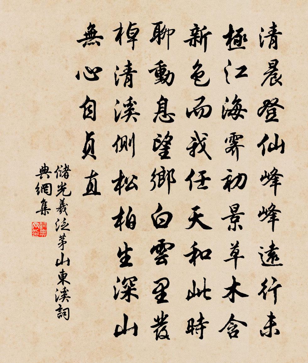 詩詞名句歷史字典書法欣賞書法字典國語詞典說文解字康熙字典古漢語字典標 題 作 者 詩 句 泛茅山東溪作者:儲光羲 朝代:唐代泛茅山東溪原文清晨登仙峰,峰遠行未極。江海霽初景,草木含新色。而我任天和,此時聊動息。望鄉白雲里,發棹清溪側。松柏生深山,無心自貞直。詩詞問答問:泛茅山東溪的作者是誰?答:儲光羲問:泛茅山東溪寫於哪個朝代?答:唐代問:泛茅山東溪是什麼體裁?答:五古儲光羲泛茅山東溪書法欣賞泛茅山東溪書法作品注釋全唐詩:卷136_24詩詞推薦十月初三日自邑夜歸舒岳祥〔宋代〕北風茅店晚炊遲,吠犬聲中踏黑歸。溪上人家應夜績,松明一點出疏籬。鷓鴣天(重九席上再賦)辛棄疾〔宋代〕有甚閒愁可皺眉。老懷無緒自傷悲。百年旋逐花陰轉,萬事長看鬢髮知。溪上枕,竹間棋。怕尋酒伴懶吟詩。十分客過張耒〔宋代〕歲窮北風卷平楚,張子畏寒深閉戶。叩門過我者為誰,束帶出見亦良苦。俯眉謂客子勿瞠。我心善煩勿多語。天寒送真長書記知舞陽黃庶〔宋代〕塵土淹沉客,詩書夢寐身。又辭千里幕,去布一同春。路想多歸戶,庭應絕澇民。青衫莫嗟嘆,知已在陶鈞。水調歌頭汪莘〔宋代〕誰與玩芳草,公子未西歸。天然脫去雕飾,秋水落芙蕖。發軔朝兮東壁,弭節夕兮西極,故國入躊躇。夢裡不知路滿庭芳 示門人,令往文登設貧王處一〔元代〕彭李劉哥,三人一志,能和滿縣知交。寧心效力,相助各堅牢。今日文山去也,設貧會、無論卑高。嚴冬苦,迎風宿雲夢館歐陽修〔宋代〕北鴈來時歲欲昏,私書歸夢杳難分。井桐葉落池荷盡,一夜西窗雨不聞。秦淮馬之純〔宋代〕城中那有大川行,惟有秦淮入帝城。十里牙檣並錦纜,萬家碧瓦與朱甍。船多直使水無路,人鬧不容波作聲。流到次韻陳茲明五絕句史彌寧〔宋代〕買得湖陰數頃秋,斬新窗戶府清流。了無俗子溷人意,況有清尊澆客愁。悼室人詩江淹〔南北朝〕神女色姱麗。乃出巫山湄。逶迤羅袂下。鄣日望所思。佳人獨不然。戶牖絕錦綦。感此增嬋娟。屑屑涕自滋。清光和楊同州寒食乾坑會後,聞楊工部欲到,知予白居易〔唐代〕夜飲歸常晚,朝眠起更遲。舉頭中酒後,引手索茶時。拂枕青長袖,欹簪白接蘺。宿酲無興味,先是肺神知。擬行路難鮑照〔南北朝〕璇閨玉墀上椒閣,文窗繡戶垂綺幕。中有一人字金蘭,被服纖羅蘊芳藿。春燕差遲風散梅,開幃對影弄禽爵。含歌次歸耕堂稀字韻楊冠卿〔宋代〕神京千里雁書稀,關塞傳聞驛騎飛。報導天驕遁沙漠,袞衣行從翠華歸。減字木蘭花石孝友〔宋代〕空階雨過。細草搖搖光入座。斜日多情。戀戀幽窗故故明。沈吟無語。立遍梧桐庭下樹。病葉先秋。零亂風前片段壽陽罷郡日有詩十首與追懷…物。肥河維舟阻凍祗待敕命李紳〔唐代〕罷分符竹作閒官,舟凍肥河擬棹難。食蘗苦心甘處困,飲冰持操敢辭寒。夜燈空應漁家火,朝食還依雁宿灘。西奏詠雞繆鑒〔宋代〕數載書窗伴讀鳴,群中剛雉羽毛新。今朝命試牛刀手,望斷函關夜度人。贈汲郡太守詩陸雲〔魏晉〕善問伊何。惠音孔韶。肇允衡門。翻飛宰朝。肅雍芳林。芬響凌霄。穆矣和風。育爾清休。頌證道歌證道歌釋印肅〔宋代〕逆行順行天莫測,鄧隱峰破禪規則。叢林動念幾千般,倒立歸真誰勝得。過廢江寧縣(王昌齡曾尉此縣)羅隱〔唐代〕縣前水色細鱗鱗,一為夫君吊水濱。漫把文章矜後代,可知榮貴是他人。鶯偷舊韻還成曲,草賴余吟盡解春。我亦台中里行詠佚名〔宋代〕柱下雖為史,台中未是官。何時聞必也,早晚見任端。名句推薦早是他鄉值早秋,江亭明月帶江流。王勃《秋江送別二首》 嶺水爭分路轉迷,桄榔椰葉暗蠻溪。李德裕《謫嶺南道中作》 對秋深,離恨苦,數夜滿庭風雨。孫光憲《更漏子·對秋深》 仁遠乎哉?我欲仁,斯仁至矣。孔子弟子《論語·述而篇》 想文君望久,倚竹愁生步羅襪。姜夔《八歸·湘中送胡德華》 帶長劍兮挾秦弓,首身離兮心不懲。屈原《國殤》 為高必因丘陵,為下必因川澤。孟子《孟子·離婁章句上·第一節》 傳屐朝尋藥,分燈夜讀書。於鵠《題鄰居》 報答春光知有處,應須美酒送生涯。杜甫《江畔獨步尋花七絕句》 八陣圖名成臥龍,六韜書功在飛熊。查德卿《蟾宮曲·懷古》