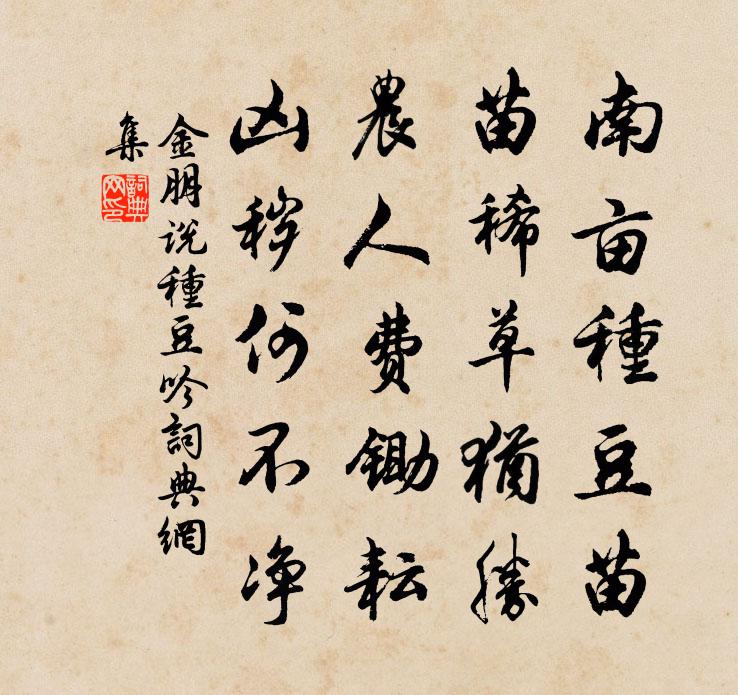 詩詞名句歷史字典書法欣賞書法字典國語詞典說文解字康熙字典古漢語字典標 題 作 者 詩 句 種豆吟作者:金朋說 朝代:宋代種豆吟原文南畝種豆苗,苗稀草猶勝。農人費鋤耘,凶穢何不淨。詩詞問答問:種豆吟的作者是誰?答:金朋說問:種豆吟寫於哪個朝代?答:宋代金朋說種豆吟書法欣賞種豆吟書法作品詩詞推薦醉桃源(和昌甫)韓淲〔宋代〕固窮齋里語吾生。言之必可行。扶疏夏木既啼鶯。更逢魚計成。多雅尚,少時情。滄浪漁父纓。高歌寧與俗爭鳴。木棉艾可叔〔宋代〕收來老繭倍三春,匹似真棉白一分。車轉輕雷秋紡雪,弓彎半月夜彈雲。衣裘卒歲吟翁暖,機杼終年織婦勤。聞得禪人並化主寫真求贊釋正覺〔宋代〕行起解絕,宗全說缺。根根塵塵兮元自現成,佛佛祖祖兮何勞施設。本色當行家,賞音個時節。遲日風流轉柳腰,望江南張繼先〔宋代〕四通九達,青玉交輝。天作高山,地靈若此。常相謂曰:身處真人之墟,而不知也。登戲珠峰,以見虎蹲龍躡,遠感事楊冠卿〔宋代〕我車昔載脂,柳色初濯濯。甩歸脫征驂,柳葉半黃落。恍然僅一夢,已費十晦朔。只應為客老,惘惘不自覺。寄題太和宰趙嘉言勤民二圖題通濟渡船圖楊萬里〔宋代〕歲歲桃花水到時,野航客子命如絲。趙侯小試濟川手,雪浪翻天不濺伊。首尾吟邵雍〔宋代〕堯夫非是愛吟詩,詩是堯夫秋出時。樓上清風猶足喜,水邊芳草未全衰。才涼便可停新酒,薄暮初能著袷衣。都沒南陔五章二章八句三章四句鄭剛中〔宋代〕陟彼南陔,有風惟薰。曷念劬勞,華發盈巾。彼發之華,尚可翦也。嗟嗟吾親,不可見也。同父送松江蟹高似孫〔宋代〕人間寧有幾松江,蟹到強時橙也黃。非是龜蒙無此雋,自從茂世孰為仁。乾坤大半漁為宅,雪月從頭筆做休。不讀謝答聞善二兄九絕句黃庭堅〔宋代〕公擇醉面桃花紅,人百忤之無慍容。莘老夜闌傾數斗,焚香默坐日生東。書直舍壁陸游〔宋代〕道山西下路,杳杳歷重廊。地寂聞傳漏,簾疏有斷香。渠清水馬健,屋老瓦松長。欲出重欹枕,無何覓故鄉。讀范吏部三高祠堂記樓鑰〔宋代〕三高之風天與高,三高之靈或可招。小山以後無此作,具區笠澤空寥寥。幾從垂虹盪雙槳,寓目滄浪獨怊悵。筆端詠雨楊凝〔唐代〕塵浥多人路,泥歸足燕家。可憐繚亂點,濕盡滿宮花。紫溪莊舍讀癸丑壁間舊題轉眼忽十八年同游十劉學箕〔宋代〕念昔考槃,碩人之滿。琴豆觴酒,寤寐笑歌。逝者弗返,涕泗滂沱。念彼不樂,傷如之何。宿蓮花寺頃從清獻公游今十年矣毛滂〔宋代〕一徑通松竹,入門聞夜香。青燈孤照佛,斜月靜歸廊。未厭逢僧拙,終慚涉世忙。十年猶彷佛,一夢自淒涼。放言五首元稹〔唐代〕近來逢酒便高歌,醉舞詩狂漸欲魔。五斗解酲猶恨少,十分飛盞未嫌多。眼前仇敵都休問,身外功名一任他。死是次韻嵩師彥正留別郭印〔宋代〕兩公清氣入人肝,玉樹森森逼我寒。揮麈繽紛驚落屑,和詩來往疾跳丸。興餘不管牙籤亂,坐久翻憂蠟炬殘。輕別荒徑釋文珦〔宋代〕荒逕入林微,蓬廬客到稀。苔痕侵藥裹,山色冷吟衣。蚯蚓耕泥起,蜻蜒點水飛。坐來忘萬事,靜看宿雲歸。和龐丞相宋祁〔宋代〕顧我支離甚,惟公念不才。朱顏為列郡,白髮入中台。閣道通天祿,宮門拂斗魁。論班元後鄭,作賦或延枚。病肘西湖為陳世崇餞行壑大〔宋代〕我昔見君方成童,長吉才華驚鉅公。人間科第不屑就,直使聲名聞九重。乃翁引上凝殿,子虛不待他人薦。入直承名句推薦朱弦已為佳人絕,青眼聊因美酒橫。黃庭堅《登快閣》 公天下之身,公天下之物,其唯至人矣!列子及其弟子《列子·楊朱》 寧可人負我,切莫我負人。佚名《增廣賢文·上集》 桃花三十六陂,鮫宮睡起,嬌雷乍轉。吳文英《瑞龍吟·德清清明競渡》 滿月飛明鏡,歸心折大刀。杜甫《八月十五夜月二首》 愛之如父母, 仰之如日月,敬之如鬼神,畏之如雷霆姚察、姚思廉《梁書·列傳·卷三十八》 形在江海之上,心存魏闕之下劉勰《文心雕龍·神思》 春草如有情,山中尚含綠李白《金門答蘇秀才》 孤花片葉,斷送清秋節。納蘭性德《清平樂·孤花片葉》 莫辭酒味薄,黍地無人耕。杜甫《羌村三首·其三》