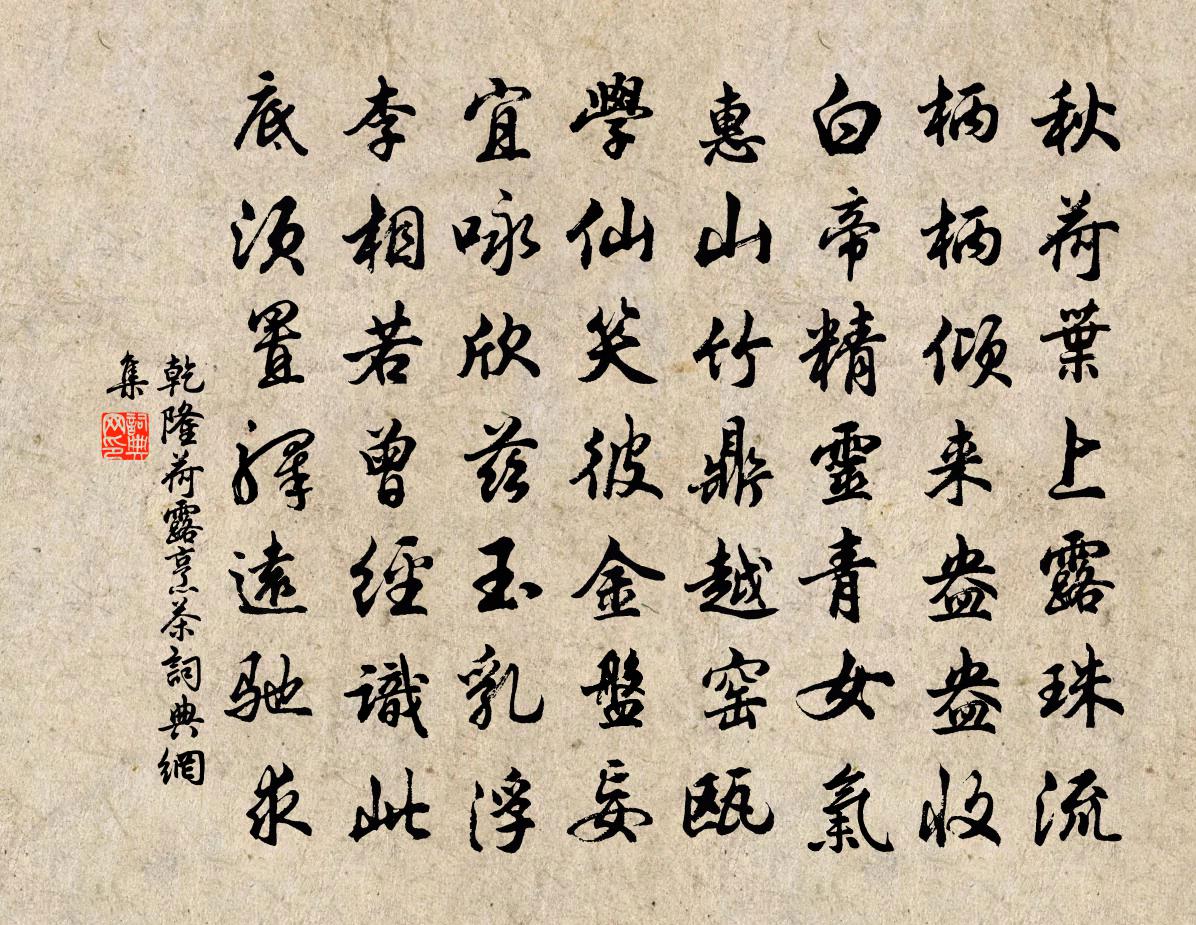 詩詞名句歷史字典書法欣賞書法字典國語詞典說文解字康熙字典古漢語字典標 題 作 者 詩 句 荷露烹茶作者:乾隆 朝代:清代荷露烹茶原文秋荷葉上露珠流,柄柄傾來盎盎收。白帝精靈青女氣,惠山竹鼎越窯甌。學仙笑彼金盤妄,宜詠欣茲玉1*1乳浮。李相若曾經識此,底須置驛遠馳求。詩詞問答問:荷露烹茶的作者是誰?答:乾隆問:荷露烹茶寫於哪個朝代?答:清代乾隆荷露烹茶書法欣賞荷露烹茶書法作品詩詞推薦訴衷情蔡伸〔宋代〕亭亭秋水玉芙蓉。天際水浮空。碧雲望中空暮,人在廣寒宮。雙縷枕,曲屏風。小房櫳。可憐今夜,明月清風,無臥羊山鄭士懿〔宋代〕見羊疑是已叱石,見石翻疑未叱羊。非石非羊何所見,這些意思難商量。戰城南何承天〔南北朝〕戰城南,沖黃塵,丹旌電烻鼓雷震。勍敵猛,戎馬殷,橫陣亘野若屯雲。仗大順,應三靈,義之所感士忘生。長劍漢宮春(重和)徐鹿卿〔宋代〕吏隱南昌,問盤根幾世,長子孫枝。仙風道骨如此,信不吾欺。素姿傾國,□難昏、坐覺愆期。算好與、水仙作配一畝張耒〔宋代〕一畝秋蔬半成實,灶突無煙已三日。良人傭車斃車下,老婦抱子啼空室。秋風九月天已寒,飢腸不飽衣苦單。我身清明日先勞動掛楮錢王炎〔宋代〕昔人最重去墳墓,絕喜歸來老一邱。豈是他山無筍蕨,只緣故國有松楸。百年暫住人間世,千古俱為地下游。色境夏日盩厔郊居寄姚少府李頻〔唐代〕古木有清陰,寒泉有下深。蟬從初伏噪,客向晚涼吟。白日欺玄鬢,滄江負素心。甚思中夜話,何路許相尋。洞庭寄所思趙嘏〔唐代〕日斷蘭台空望歸,錦衾香冷夢來稀。書中自報刀頭約,天上三看破鏡飛。孤浪謾疑紅臉笑,輕雲忽似舞羅衣。遙知謝東園主人惠蔡公草書陳宓〔宋代〕開軒但覺快心眸,百載雲煙靄未收。誰謂昔人成邁往,每於遺墨見風流。看中猛勢驤龍虎,藏處寒光射鬥牛。白璧立春內中帖子詞皇帝閣王珪〔唐代〕丹門瑞霧紫濛濛,日到蓬萊正殿東。只看御爐香欲起,佩環齊響半天中。曠軒錢時〔宋代〕巨鰲飛出水精宮,蹙踏群山氣象雄。更覺我來軒愈曠,乾坤舒捲一襟風。寄槐庭丘葵〔宋代〕吾道付滄浪,衰年尚異鄉。畏人江草合,懷舊暮雲長。老我已無用,如君終未忘。天寒無過雁,夜夜獨鳴蛩。次韻任道食荔支有感三首黃庭堅〔宋代〕今年荔子熟南風,莫愁留滯太史公。五月照江鴨頭綠,六月連山柘枝紅。感舊四首黃景仁〔清代〕大道青樓望不遮,年時系馬醉流霞。風前帶是同心結,杯底人如解語花。下杜城邊南北路,上闌門外去來車。匆匆和參寥明發見鄰家花二首陳師道〔宋代〕滿城桃李一番新,深院繁枝別得春。從此詩翁有新語,不須紅濕少城闉。和傅侍郎至臨漳感舊十詠陳淳〔宋代〕依山種竹襯山佳,傍水栽花水妒霞。一意生生俱好玩,休分紅翠有無遮。應天長許棐〔宋代〕濺紫飄紅風又雨。一刻韶芳留不住。燕吞聲,鶯誶語。待得晴來人已去。怯新歌,憐舊舞。冷落艷腔芳譜。要識此送詹司業陳師道〔宋代〕學舍論交二十年,白頭相對固依然。才難孰為吾君惜,果滿寧容我輩先。熟路長驅聊緩步,百全一發不虛弦。故懷秋雨二首張耒〔宋代〕離披衰柳已無蟬,黃葉閉門風雨天。陶令無錢難得醉,竹窗過午枕書眠。南郊祠所上章攝事二首宋祁〔宋代〕上辛茲攝事,瑞祝本通天。自此春秋筆,還書大有年。名句推薦打起黃鶯兒,莫教枝上啼。金昌緒《春怨 / 伊州歌》 言則稱於湯文,行則譬於狗豨。墨子《墨子·46章 耕柱》 不在其位,不謀其政。孔子弟子《論語·泰伯篇》 汀洲無浪復無煙,楚客相思益渺然。劉長卿《自夏口至鸚鵡洲夕望岳陽寄源中丞》 是故去智而有明,去賢而有功。韓非及後人《韓非子·主道》 惜衣有衣,惜食有食。馮夢龍《警世通言·卷三》 涼月如眉掛柳灣,越中山色鏡中看。戴叔倫《蘭溪棹歌》 治生乎君子,亂生乎小人。荀子《荀子·王制》 木與木相摩則然,金與火相守則流莊子《莊子·雜篇·外物》 鵬北海,鳳朝陽。辛棄疾《鷓鴣天·送廓之秋試》