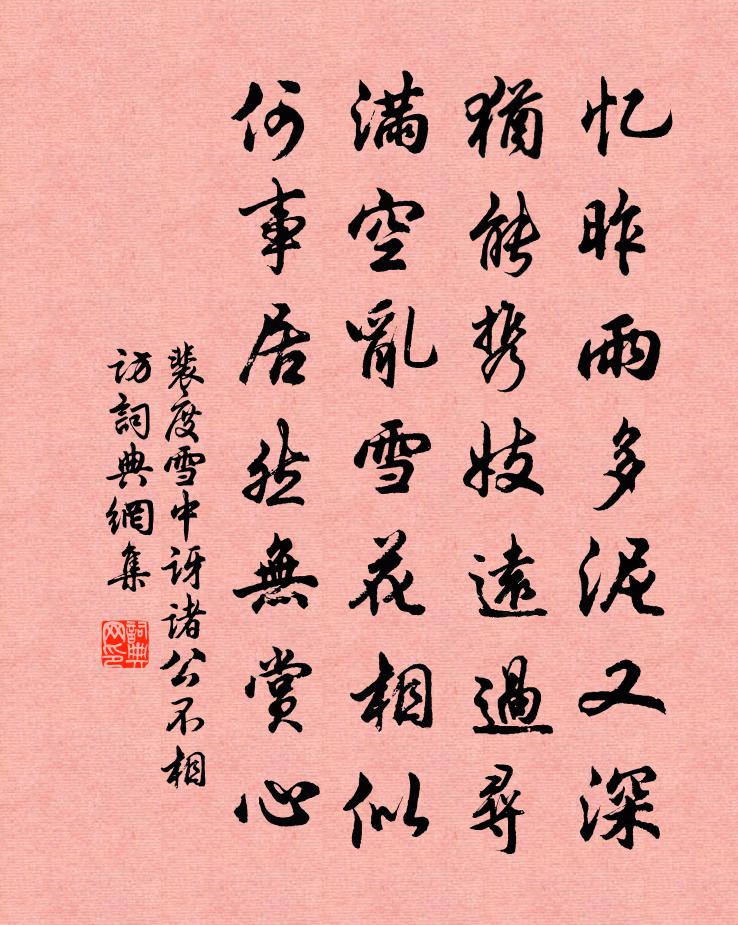 詩詞名句歷史字典書法欣賞書法字典國語詞典說文解字康熙字典古漢語字典標 題 作 者 詩 句 雪中訝諸公不相訪作者:裴度 朝代:唐代雪中訝諸公不相訪原文憶昨雨多泥又深,猶能攜妓遠過尋。滿空亂雪花相似,何事居然無賞心。詩詞問答問:雪中訝諸公不相訪的作者是誰?答:裴度問:雪中訝諸公不相訪寫於哪個朝代?答:唐代問:雪中訝諸公不相訪是什麼體裁?答:七絕裴度雪中訝諸公不相訪書法欣賞雪中訝諸公不相訪書法作品注釋全唐詩:卷335-17詩詞推薦重九姜特立〔宋代〕淵明頗愛重九名,我亦愛飽重九酒。已辦 * 與紅萸,喚起陶公為四友。旅次江亭楊衡〔唐代〕扣舷不能寐,皓露清衣襟。彌傷孤舟夜,遠結萬里心。幽興惜瑤草,素懷寄鳴琴。三奏月初上,寂寥寒江深。鷓鴣天徐俯〔宋代〕宜笑宜顰掌上身。能歌能舞惡精神。臉邊紅入桃花嫩,眉上青歸柳葉新。嬌不語,易生嗔。尊前還是一番春。深杯題慈谿慶安寺古松馮輗〔宋代〕寒松一乾老蒼蒼,古寺門前歲月長。匠伯偶圖舟楫利,禪翁方患斧斤傷。得全此日同齊櫟,勿翦他年經召棠。可但玉兒鄧林〔宋代〕金蓮華上俞尼子,永壽神仙羅繡綺。苑中荊荻市令嚴,玉像支離瓦官寺。六宮鴨划起淫風,太白便應懸妲己。此身臨安三絕 錦溪蘇軾〔宋代〕楚人休笑沐猴冠,越俗徒夸翁子賢。五百年間異人出,盡將錦繡裹山川。過福禪師蘭若王維〔唐代〕岩壑轉微徑,雲林隱法堂。羽人飛奏樂,天女跪焚香。竹外峰偏曙,藤 * 更涼。欲知禪坐久,行路長春芳。自笑二首楊公遠〔宋代〕自笑人生立切難,甘辛滋味飽曾參。頭顱潦倒梅橫雪,心地通明月印潭。詩欠驚人徒著意,事多忤谷更休談。何如再次張丞韻陳造〔宋代〕龍職陰晴肯轉圜,寒侵春事倍常年。彌旬稔聽盆翻雨,一室何殊瓮里天。多病可堪嚴酒戒,高舂未憖枕書眠。忘憂東陽道上黃鎮成〔元代〕山谷蒼煙薄,穿林白日斜。崖崩迂客路,木落見人家。野碓喧春水,山橋枕淺沙。前村烏桕熟,疑是早梅花。溪上戴復古〔宋代〕小樓蕭灑面晴川,裊裊西風掃暮煙。碧水明霞兩相照,秋光全在夕陽天。探春慢張炎〔宋代〕寄戚五雲。書之,幾脫腕也列屋烘爐,深門響竹,催殘客里時序。投老情懷,薄游滋味,消得幾多淒楚。聽雁聽風夜行船(送胡彥直歸郡醉中作)趙長卿〔宋代〕短棹輕舟排辦了。歌聲斷、晚霞殘照。紅蓼坡頭,綠楊堤外,離恨知多少。別後莫教音信杳。嘆光陰、初自來堪笑過顯濟廟前石磯竹枝詞二首楊萬里〔宋代〕石磯作意惱舟人,束起波濤遣怒奔。撐折萬篙渾不枉,石磯嬴得萬餘痕。游玉林午飯和曲池觀偃松過法華院於上主觀東程公許〔宋代〕玉林散策才亭午,九曲流觴對偃松。脫盡皮膚見真實,臥睦桃李競丰容。上方細睦錐沙刻,丈室連澆 * 濃。蜀客鄭唐仲輓詞林亦之〔宋代〕三閭未死已招魂,卻是狂夫不要論。誰肯將身緣問道,十年臥病菊花村。減字木蘭花(題深道寄傲軒)佚名〔宋代〕結廬人境。萬事醉來都不醒。鳥倦雲飛。兩得無心總是歸。古人逝矣。舊日南窗何處是。莫負青春。即是昇平寄傲呈竹軒張史君二首王邁〔宋代〕竹軒治郡政成時,卻值王孫慶玉墀。無吏下鄉民點塔,捐田入學士礱碑。平反陰德堪娛母,清白家風更課兒。見說過東林山倪思〔宋代〕世道荊棒似弈棋,奪身千仞復何辭。九霄地冷衣襟薄,五月山寒杖履遲。雲外晚風馳鐵馬,日邊香霧瑣金螭。直須句徐似道〔宋代〕小桃洗面添光澤,未點胭脂已自紅。名句推薦人之忌,在好為人師。孟子《孟子·離婁章句上·第二十三節》 萬歲山前珠翠繞,蓬壺殿里笙歌作岳飛《滿江紅·登黃鶴樓有感》 野曠天清無戰聲,四萬義軍同日死。杜甫《悲陳陶》 一年滴盡蓮花漏。碧井酴酥沈凍酒。毛滂《玉樓春·己卯歲元日》 湖清霜鏡曉,濤白雪山來。李白《送友人尋越中山水》 芳洲拾翠暮忘歸,秀野踏青來不定。張先《木蘭花·乙卯吳興寒食》 有情不管別離久。情在相逢終有。晏幾道《秋蕊香·池苑清陰欲就》 十五入漢宮,花顏笑春紅。李白《怨歌行》 廢一善,則眾善衰。賞一惡,則眾惡歸。黃石公《三略·下略》 不務天時,則財不生;不務地利,則倉廩不盈管仲《管子·牧民》