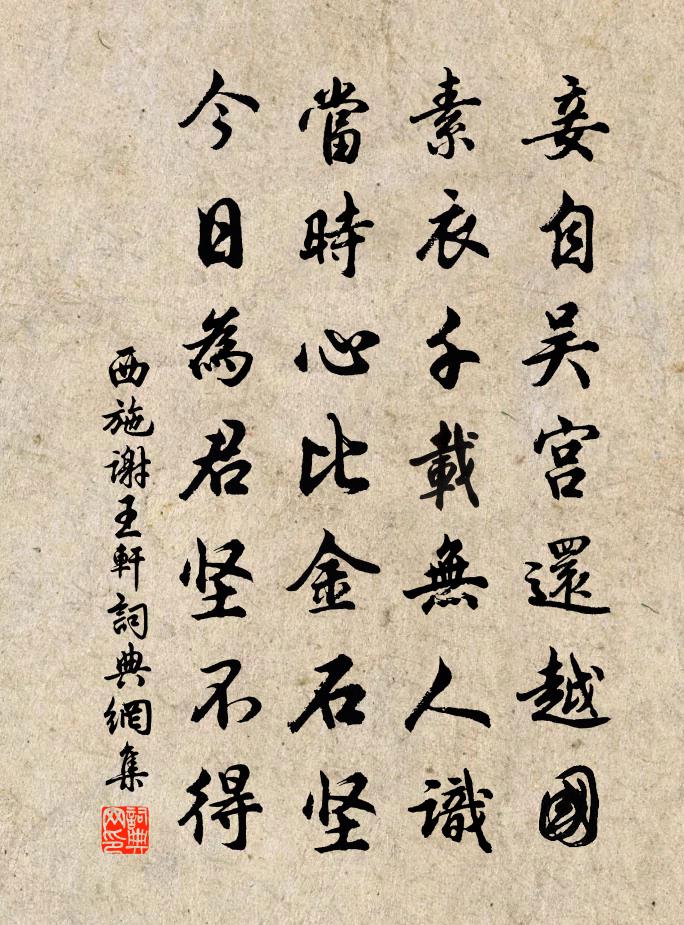 詩詞名句歷史字典書法欣賞書法字典國語詞典說文解字康熙字典古漢語字典標 題 作 者 詩 句 謝王軒作者:西施 朝代:唐代謝王軒原文妾自吳宮還越國,素衣千載無人識。當時心比金石堅,今日為君堅不得。詩詞問答問:謝王軒的作者是誰?答:西施問:謝王軒寫於哪個朝代?答:唐代問:謝王軒是什麼體裁?答:七古西施謝王軒書法欣賞謝王軒書法作品注釋全唐詩:卷866-33詩詞推薦偈頌三十首釋慧暉〔宋代〕路遮戶外,家包雲中。客游三月,主居月宮。休堂頌黃庭堅〔宋代〕頭上安頭,如何得休。殺佛殺祖,方得按堵。北郁單越,西瞿耶尼。事同一家,吃飯著衣。向上一路,千聖貶眼。為杭州日送客舟中唐詢〔宋代〕山雨霏微不滿空,畫船來往疾輕鴻。誰知獨臥珠簾裹,一榻無塵四面風。寒食雨中,同舍約游天竺,得十六絕句呈陸務楊萬里〔宋代〕若道尋春被雨催,如何隨處兩三杯。晚晴曉雨如翻手,有底虧儂不好來。秘閣觀書薛紹彭〔宋代〕訪古求書二十年,二王真跡幾人傳。每尋同好得訊息,聞韶忘味心拳拳。諸家真贗可屈指,緹巾入手分媸妍。道山次魏知元韻三首陳造〔宋代〕魏郎日共無喧酒,舊學新詩得細論。可見高情重離別,又同一舸宿煙村。再和張秋山杭州孤山二首何夢桂〔宋代〕處士橫橋野水流,先生家住暮雲稠。百年故國成塵夢,千古青山憶舊遊。林下客盟寒白鶴,梅邊詩稿問蒼頭。公來題滕學士九華山書堂梅堯臣〔宋代〕處山方畏淺,曾慕結深廬。要與雲峰近,寧將野客疏。澗苗來入俎,林鳥或窺書。何事輕茲樂,而從出塞車。景祐祀社稷三首佚名〔宋代〕禮崇明福,維聲斯酒。潔粢豈盛,分時徼牲。齊莊嚴祗,升燎於槱。其報伊何,如山如阜。禪人並化主寫真求贊釋正覺〔宋代〕智極而藏,靜極而光。蕉雷之展,葵日之芳。占寶器而蠻眼碧,理華須而蜂股黃。中規中矩兮乍圓乍方。久在病告近方赴直偶成拙詩二首歐陽修〔宋代〕清晨下直大明宮,馳馬悠然宿露中。金闕雲開滄海日,天街雨後綠槐風。歲華忽忽雙流矢,鬢髮蕭蕭一病翁。名在病中絕句陸游〔宋代〕青熒猶有佛燈明,點滴時聞竹露聲。欲睡不成還起坐,麗譙風順報三更。句釋惠崇〔宋代〕梵容分古像,唐語入新經。似范景山陳著〔宋代〕我輩豈池蛟,飛騰此一交。天門驚路梗,冰港笑舟膠。甘甚新薇蕨,依然故草茅。從今門外事,洗耳學由巢。西江月王哲〔元代〕常把內真頻看,休教外景長侵。尖竿尖上細搜尋。正見嬰兒弄影。雅詠高吟叫笑,清風皓月吹臨。分開傳作紫共金夔州元宵和曾端伯韻四首郭印〔宋代〕綺陌家家不下簾,花光世界總成蓮。村歌社舞歡乎處,都道今年勝去年。次韻泮宮直宿早秋四首傅察〔宋代〕一方明月落長空,萬里餘輝鎖玉櫳。蟬韻啾啾來遠木,槐雲裊裊弄清風。共邀載酒陶彭澤,走訪談經載侍中。景物壽皇聖帝挽章三首陳造〔宋代〕慈儉遵先志,剛明肖上乾。題期千一遇,躋治五三前。他日山藏壑,終天澤漏泉。稽山穿望眼,松影五雲連。墨戲二首蘭陳與義〔宋代〕鄂州遷客一花說,仇池老仙五字銘。併入晴窗三昧手,不須辛苦讀騷經。山中姜特立〔宋代〕不到山中久,山寒景益奇。凍泉零雪谷,墜葉弄風絲。名句推薦握手西風淚不乾,年來多在別離間。納蘭性德《於中好·送梁汾南還為題小影》 君疑臣則臣必死。羅貫中《三國演義·第一百一十九回》 零落江南不自由。兩綢繆。料得吟鸞夜夜愁。姜夔《憶王孫·番陽彭氏小樓作》 重岡已隔紅塵斷,村落更年豐。元好問《人月圓·重岡已隔紅塵斷》 十年驅馳海色寒,孤臣於此望宸鑾。戚繼光《望闕台》 無人知此意,歌罷滿簾風。陳與義《臨江仙·高詠楚詞酬午日》 楊枝飄泊,桃根嬌小,獨自個思量。項鴻祚《太常引·客中聞歌》 偏借其權勢,則上下易位矣,此言人臣之不可借權勢。韓非及後人《韓非子·備內》 修竹傍林開,喬松倚岩列。德隱《新秋晚眺》 長江如虹貫,蟠繞其下。宋濂《閱江樓記》