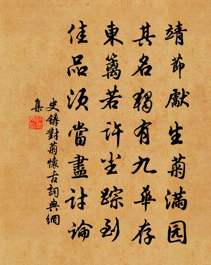 詩詞名句歷史字典書法欣賞書法字典國語詞典說文解字康熙字典古漢語字典標 題 作 者 詩 句 對菊懷古作者:史鑄 朝代:宋代對菊懷古原文靖節先生菊滿園,其名獨有九華存。東籬若許塵蹤到,佳品須當盡討論。詩詞問答問:對菊懷古的作者是誰?答:史鑄問:對菊懷古寫於哪個朝代?答:宋代史鑄對菊懷古書法欣賞對菊懷古書法作品詩詞推薦六月五日集英殿策士從官待宣於內軍器庫廓洪咨夔〔宋代〕漢廷與目策英豪,投釣知誰首掣鰲。百日紅蓮綸閣迥,萬年枝拂禁城高。內廓坐永風生席,輦路歸遲月映袍。西抹寒山贊釋普度〔宋代〕沒伎倆,愛吟詩。一句子,少人知。寥寥靜聽松風吹。和文遠叔行春楊萬里〔宋代〕行腳宜晴翠,看雲恐夕黃。何村不花柳,此社要柴桑。一笑當誰領,同來得許忙。老懷翻作惡,不剩半分狂。送吳門葉元老歸浮光魏了翁〔宋代〕龍標之南路窮絕,峨峨群峰倚天脅。頑雲壓溪鳶跕翅,很石橫空馬溝血。葉君尺箠度崔嵬,朱霞白鶴雲端來。蠻邦悲淮南劉過〔宋代〕淮民窮到骨,忍復搥其肌。不知鐵錢禁,作俑者為誰。行商斷來路,清野多流離。主人日邊來,四牡驅以馳。或雲次韻韶俯李通直二首蘇軾〔宋代〕青山只在古城隅,萬里歸來卜築初。會見四山朝鶴駕,更看三李跨鯨魚。欲從抱朴傳家學,應怪中郎得異書。待我觀南塘四首呈沈守陳傅良〔宋代〕夾道歡呼百裡間,不論扶杖與勝冠。公年幾許顏何似,遲放牙檣待我看。蒙恩易鎮豫章丐假還鄉途中偶成十七首吳芾〔宋代〕村徑迷南北,晨興乃錯行。悟來還已遠,卻悔早貪程。金剛隨機無盡頌淨心行善分第二十三釋印肅〔宋代〕菩提元等平,摩尼一顆明。非色非非色,了自本無名。湖山雜賦陸游〔宋代〕門前天鏡倒千峰,舍後菰蒲與海通。乘興出遊無遠近,煙波何處覓孤篷?挽新市張監酒三首黃榦〔宋代〕淡薄心無累,行藏惠及人。詩書長孫子,雍睦化比鄰。我亦塵中客,來司翁底春。從公得遺範,惆悵重書紳。詩一首杭州老尉〔宋代〕當年同試大明宮,文字雖同命不同。我作尉時君作相,東皇元沒兩般風。因客說秋秫水傷復用前韻陳傅良〔宋代〕風鱠不須鹽豉好,霜螯須著酒船深。無由種秫求旁舍,旁舍秋螟已蠹心。浪淘沙王庭珪〔宋代〕翠袖卷輕紗。玉腕慵遮。蕊珠宮殿倚彤霞。不憤江南梅信早,爭下香車。月露洗凝華。艷壓群葩。暗傳春信到天涯送陸務觀赴七閩提舉常平茶事周必大〔宋代〕暮年桑薴毀茶經,應為征行不到閩。今有雲孫持使節,好因貢焙祀茶神。薄倖·淡妝多態賀鑄〔宋代〕淡妝多態,更的的、頻回眄睞。便認得琴心先許,欲綰合歡雙帶。記畫堂、風月逢迎,輕鼙淺笑嬌無奈。向睡鴨爐發岳市三首劉克莊〔宋代〕明仲竄蠻煙,欽夫棄盛年。空令後死者,有淚滴遺編。送楊秀才貫休〔唐代〕北山峨峨香拂拂,翠漲青奔勢巉崒。赤松君宅在其中,紫金為牆珠作室。玻璃門外仙獓睡,幢節森森絳煙密。水精沈存尚林亭夜宴牟融〔唐代〕草堂寂寂景偏幽,到此令人一縱眸。松菊寒香三徑晚,桑榆煙景兩淮秋。近山紅葉堆林屋,隔浦青簾拂畫樓。終日送司馬季思通守沿檄天台二首謝伋〔宋代〕靜聽天台事,茲行毋憚勞。水和青嶼出,霞起赤城高。佛寺炊烏飯,仙宮壓白醪。奉符須少緩,處處可游遨。名句推薦父兮生我,母兮鞠我。佚名《蓼莪》 且就洞庭賒月色,將船買酒白雲邊。李白《游洞庭湖五首·其二》 情似遊絲,人如飛絮。淚珠閣定空相覷。周紫芝《踏莎行·情似遊絲》 不因俊俏難為友,正為風流始讀書。曹雪芹《紅樓夢·第七回》 靜女其孌,貽我彤管。佚名《靜女》 貴上極則反賤,賤下極則反貴。司馬遷《史記·貨殖列傳》 君是南山遺愛守,我為劍外思歸客。蘇軾《滿江紅·江漢西來》 善化不足,惡化有餘。佚名《增廣賢文·上集》 五更鐘動笙歌散,十里月明燈火稀。賀鑄《思越人·紫府東風放夜時》 教人學而執有命,是猶命人葆而去其冠也。墨子《墨子·48章 公孟》