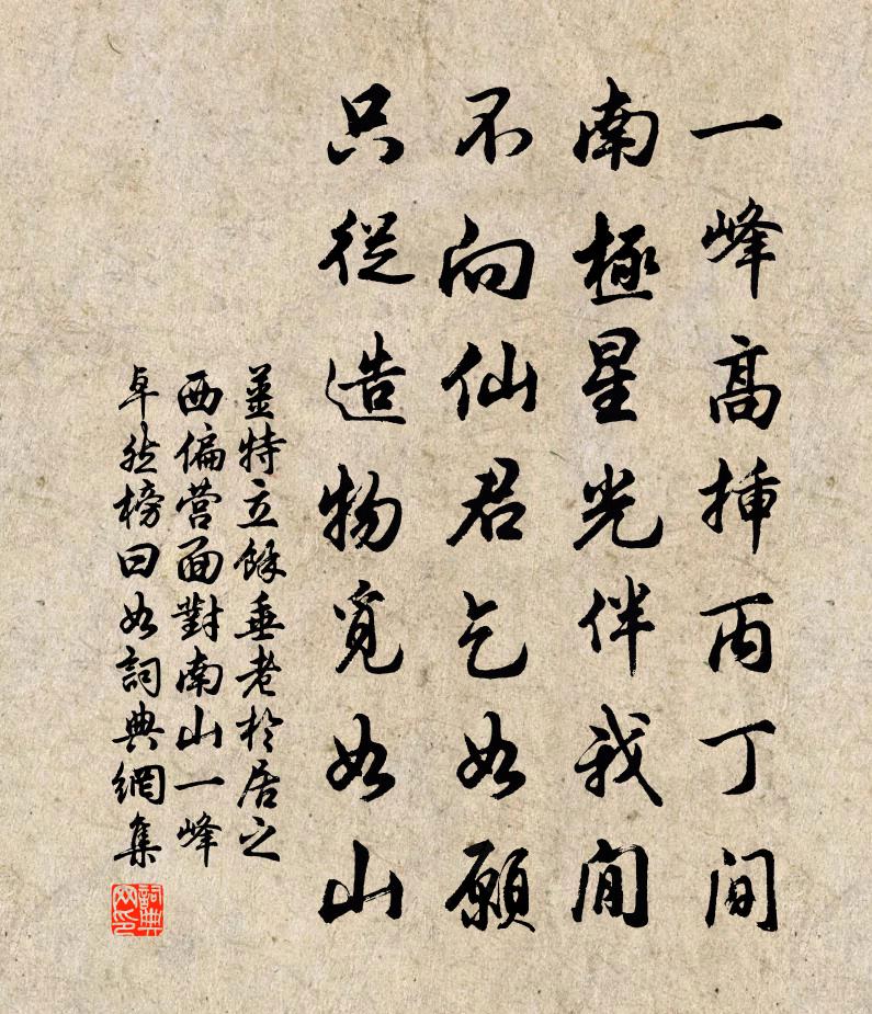 詩詞名句歷史字典書法欣賞書法字典國語詞典說文解字康熙字典古漢語字典標 題 作 者 詩 句 余垂老於居之西偏營面對南山一峰卓然榜曰如作者:姜特立 朝代:宋代原文一峰高插丙丁間,南1~1極1*1星光伴我閒。不向仙君乞如願,只從造物覓如山。詩詞問答問:《余垂老於居之西偏營面對南山一峰卓然榜曰如》的作者是誰?答:姜特立問:該詩寫於哪個朝代?答:宋代書法欣賞余垂老於居之西偏營面對南山一峰卓然榜曰如書法作品詩文賞析【原題】:余垂老於居之西偏營面對南山一峰卓然榜曰如山蓋取詩人意也詩詞推薦望江南/憶江南洪适〔宋代〕傾蓋侶,古語誦鄒陽。曲水一觴今意懶,陽關三疊重情傷。離恨落花當。人截鐙,歸騎莫倉黃。誰肯甘心迷簿領,六如亭劉克莊〔宋代〕吳兒解記真娘墓,杭俗猶存蘇小墳。誰與惠州耆舊說,可無抔土覆朝雲。偈頌六十八首釋法薰〔宋代〕巴陵三轉語,鈍置老僧門。靈山無半句,報盡破庵恩。再次徐先輩二首敖陶孫〔宋代〕淺聞懲闕漏,國小到凡將。始制初龍遁,流風漸烏颺。汔今緗帙富,益我手抄忙。半世真書癖,衰年忽酒狂。壯懷次韻洪令谷瑞平遠台蘇籀〔宋代〕能賦憑高所得多,海雲岩崿若君何。兼通西竺瞿曇意,欲和南風虞舜歌。怪石甘泉作檀施,長廊古殿蔭多羅。相期見李蘇州示男阿武詩,自感成詠白居易〔唐代〕遙羨青雲里,祥鸞正引雛。自憐滄海伴,老蚌不生珠。題謝艮齋畫笥四首王炎〔宋代〕熟視天機日日新,無邊物色盡橫陳。人教巧手工摹寫,粉墨何能便逼真。七日呂城守閘項安世〔宋代〕官閘嶒{宏宀換山左}晝閉塗,商舡嘈囐夜銜櫓。臥聽篙子灣灣月,坐待州家急急符。石罅漏泉鳴錦瑟,篷窗篩雨秋野即事釋文珦〔宋代〕深原草徑斜,煙際兩三家。老屋門無鑰,清溪底見沙。斷蟬嘶敗柳,孤蝶巒寒花。歷省曾游處,分明似若耶。挽劉金部陳元晉〔宋代〕忠清家法見聞中,蜀產凋零又到公。搞偽一門誠節誼,明倫數語最精忠,郎替勇退聲名重,使傳賢勞惠利豐。時事杏花天(劉司法喜詠北湖次其韻)張孝忠〔宋代〕愛尋水竹添情況。任雲臥、溪邊石上。銜杯樂聖成遊蕩。不為弓彎舞樣。北湖迥、風飄彩舫。□笑擊、馮夷薄相。蘇台汪元量〔宋代〕闔閭門外草如霜,到此躊躇欲斷腸。紅陣教成人已去,黃池會罷事堪傷。將雛野鹿銜枯薺,挾 * 烏噪夕陽。越蠡題僧惠升壁宋祁〔宋代〕何年飛虎錫,此地鎖鷹房。水入禪心定,花飄供裓香。高談犀飾麈,清啜茗成槍。千騎嘗留此,籠紗照屋樑。贈新平少年李白〔唐代〕韓信在淮陰,少年相欺凌。屈體若無骨,壯心有所憑。一遭龍顏君,嘯吒從此興。千金答漂母,萬古共嗟稱。而我池上看金沙花數枝過酴醾架盛開二首王安石〔宋代〕酴醾一架最先來,夾水金沙次第栽。濃綠扶疏雲對起,醉紅撩亂雪爭開。城南行劉攽〔宋代〕八月江湖秋水高,大堤夜坼聲嘈嘈。前村農家失幾戶,近郭扁舟屯百艘。蛟龍婉蜒水禽白,渡頭老翁須雇直。城南賀新郎·夏景蘇軾〔宋代〕乳燕飛華屋。悄無人、桐陰轉午,晚涼新浴。手弄生綃白團扇,扇手一時似玉。漸困倚、孤眠清熟。簾外誰來推繡傷曹娘二首宋之問〔唐代〕鳳飛樓伎絕,鸞死鏡台空。獨憐脂粉氣,猶著舞衣中。河伯憐嬌態,馮夷要姝妓。寄言遊戲人,莫弄黃河水。樂府曹植〔魏晉〕巢許蔑四海。商賈爭一錢。採蓮曲俞君宣〔宋代〕小姨學採蓮,兩腕白於雪。花色妬緗裙,瓣瓣紅如血。西鄰小姑亦採蓮,隔岸徒聞語笑喧。從來不相識,相呼好並名句推薦一點殘紅欲盡時。乍涼秋氣滿屏幃。周紫芝《鷓鴣天·一點殘紅欲盡時》 芰荷迭映蔚,蒲稗相因依。謝靈運《石壁精舍還湖中作》 還君明珠雙淚垂,恨不相逢未嫁時。張籍《節婦吟·寄東平李司空師道》 春風十里揚州路,卷上珠簾總不如。杜牧《贈別》 易得凋零,更多少無情風雨趙佶《宴山亭·北行見杏花》 酒逢知己千杯少,話不投機半句多歐陽修《春日西湖寄謝法曹韻》 一聲聲,一更更。万俟詠《長相思·雨》 親賢臣,遠小人。諸葛亮《出師表/前出師表》 烈士暮年,壯心不已。曹操《龜雖壽》 蕃漢斷訊息,死生長別離。張籍《沒蕃故人》
