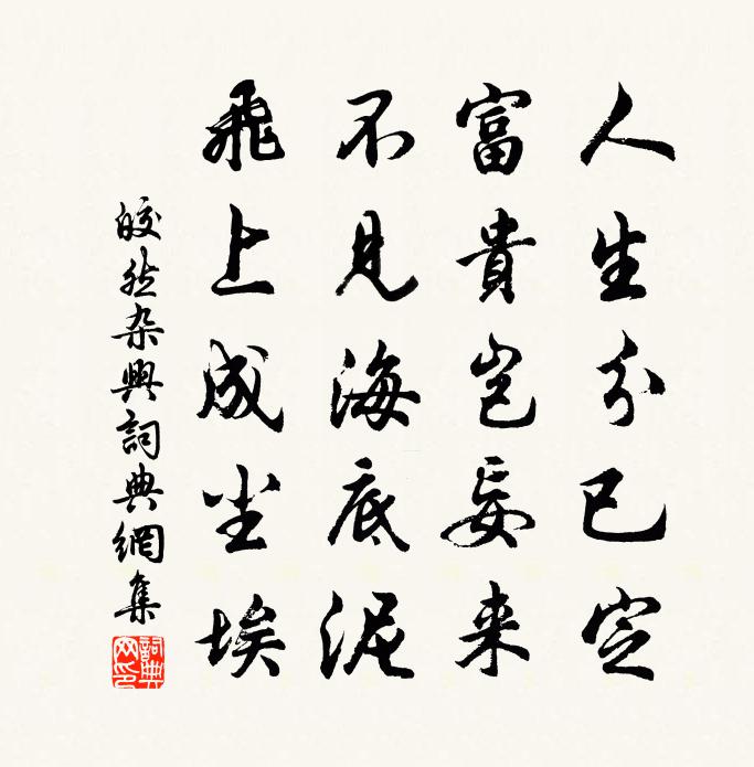 詩詞名句歷史字典書法欣賞書法字典國語詞典說文解字康熙字典古漢語字典標 題 作 者 詩 句 雜興作者:皎然 朝代:唐代雜興原文人生分已定,富貴豈妄來。不見海底泥,飛上成塵埃。詩詞問答問:雜興的作者是誰?答:皎然問:雜興寫於哪個朝代?答:唐代問:雜興是什麼體裁?答:五絕皎然雜興書法欣賞雜興書法作品注釋全唐詩:卷818-75詩詞推薦寄隨守向大夫三首釋子淳〔宋代〕歲寒木谷老林坰,茲沐恩光入翠層。再整絲輪垂釣手,隨緣溳水且騰騰。贈回雪李群玉〔唐代〕回雪舞縈盈,縈盈若回雪。腰支一把玉,只恐風吹折。如能買一笑,滿斗量明月。安得金蓮花,步步承羅襪。題伏龜山北隅徐鉉〔唐代〕茲山信岑寂,陰崖積蒼翠。水石何必多,宛有千岩意。孰知近人境,旦暮含佳氣。池影搖輕風,林光澹新霽。支頤兜率寺作林憲〔宋代〕月色到江上,角聲過山來。山城半綠樹,佳處仍樓台。古屋翠微頂,疏檐宜晚開。隱几月入座,山長潮信回。臨江仙晁沖之〔宋代〕謾道追歡惟九日,年年此恨偏濃。今朝吹帽與誰同。黃花都未拆,和淚泣西風。應恐登臨腸更斷,故交煙雨迷空。紹興祀大火十二首佚名〔宋代〕{太簇為徽}小太率禮,不愆於行。展采錯事,秩祀孔時。維今之故,閱我數度。修厥典常,神其來顧。汴河汲井孔武仲〔宋代〕解纜古城陰,繫舟綠榆影。浩蕩觀濁流,咫尺有甘井。譬如坐湯鑊,傍觀冰玉冷。望之首不回,清泉逐修綆。余香乾道七年恭上太上皇帝太上皇后尊號十一首佚名〔宋代〕斂福於郊,逢時之泰。揭名日月,侔德覆載。自我作古,域中有大。永言保之,眉壽無害。讀王伯大都承奏疏王邁〔宋代〕近得故人盈紙書,卻將取辱笑吾徒。世間處胡可羞事,曾見歐陽責范無。鳳求凰賀鑄〔宋代〕園林冪翠,燕寢凝香。華池繚繞飛廊。坐按吳娃清麗,楚調圓長。歌闌橫流美眄,乍疑生、綺席輝光。文園屬意,法雲秀禪師真贊黃庭堅〔宋代〕法雲大士,天骨岩岩。如來津梁,我實荷擔。手捉日月,斷取莊嚴。國土入此佛土,位置城南。有目無目,疑聖疑有惠新醬及酒者朱翌〔宋代〕拾遺久住浣花橋,生理誰能濟一毫。攜醬藉糟來過我,故人惟有孟倉曹。山市蒲松齡〔清代〕奐山山市,邑八景之一也,然數年恆不一見。孫公子禹年與同人飲樓上,忽見山頭有孤塔聳起,高插青冥,相顧驚秋雨王珪〔唐代〕秋容浩蕩夕雲高,旻宇蕭然絕一毫。漢塞草平嘶牧馬,越溪風急送歸舠。天衢夜失清蟾魄,海國寒飛白鷺濤。誰共宣和壬寅十月余游江南二士一日道同月岩方崇鄭剛中〔宋代〕先親膝下共遊人,孤影飄零隻我身。今日再來如隔工,泫然衰淚落江濱。萬年歡程大昌〔宋代〕老鈍迂疏,盡世間樂事,不忺不覷。痴向韋編,根究卦爻來處。渾沌包中天地。謝東家、從頭指示。便和那、八八贈趙子野歌周文璞〔宋代〕與君雖為外兄弟,語話尋常見肝肺。自從不見半年餘,每望吳雲輒流涕。苹溪松江同一波,半年不見當奈何。長安烏棲曲董嗣杲〔宋代〕綠陰涼透城頭樹,月明正照烏棲處。黃昏角起吹晴雲,烏欲啼愁愁夜分。夜分湖波幻絕境,境絕月漾玻瓈冷。棲烏發潭口文天祥〔宋代〕吹面北風來,拂鬢堅冰至。軒冕委道途,袞繡易氈毳。百年雜醜好,始酬四方誌。浩歌激浮雲,亭亭復攬轡。浪淘沙(中秋陰雨,同顯忠、椿年、諒之坐寺門作)朱敦儒〔宋代〕圓月又中秋。南海西頭。蠻雲瘴雨晚難收。北客相逢彈淚坐,合恨分愁。無酒可銷憂。但說皇州。天家宮闕酒家樓名句推薦一半黃梅雜雨晴,虛嵐浮翠帶湖明,閒雲高鳥共身輕。鄭文焯《浣溪沙·從石樓石壁往來鄧尉山中》 所謂壹刑者,刑無等級。商鞅《商君書·賞刑》 草螢有耀終非火,荷露雖團豈是珠。白居易《放言五首·其一》 萬一禪關砉然破,美人如玉劍如虹。龔自珍《夜坐二首》 蛛絲暗鎖紅樓,燕子穿簾處。吳文英《荔枝香近·七夕》 河水洋洋,北流活活詩經《碩人》 天入平湖晴不風,夕帆和雁正浮空。陳與義《登岳陽樓》 不以規矩,不能成方圓孟子《孟子·離婁章句上·第一節》 忙日苦多閒日少,新愁常續舊愁生。陸游《浣溪沙·和無咎韻》 車遙遙兮馬洋洋,追思君兮不可忘。傅玄《車遙遙篇》