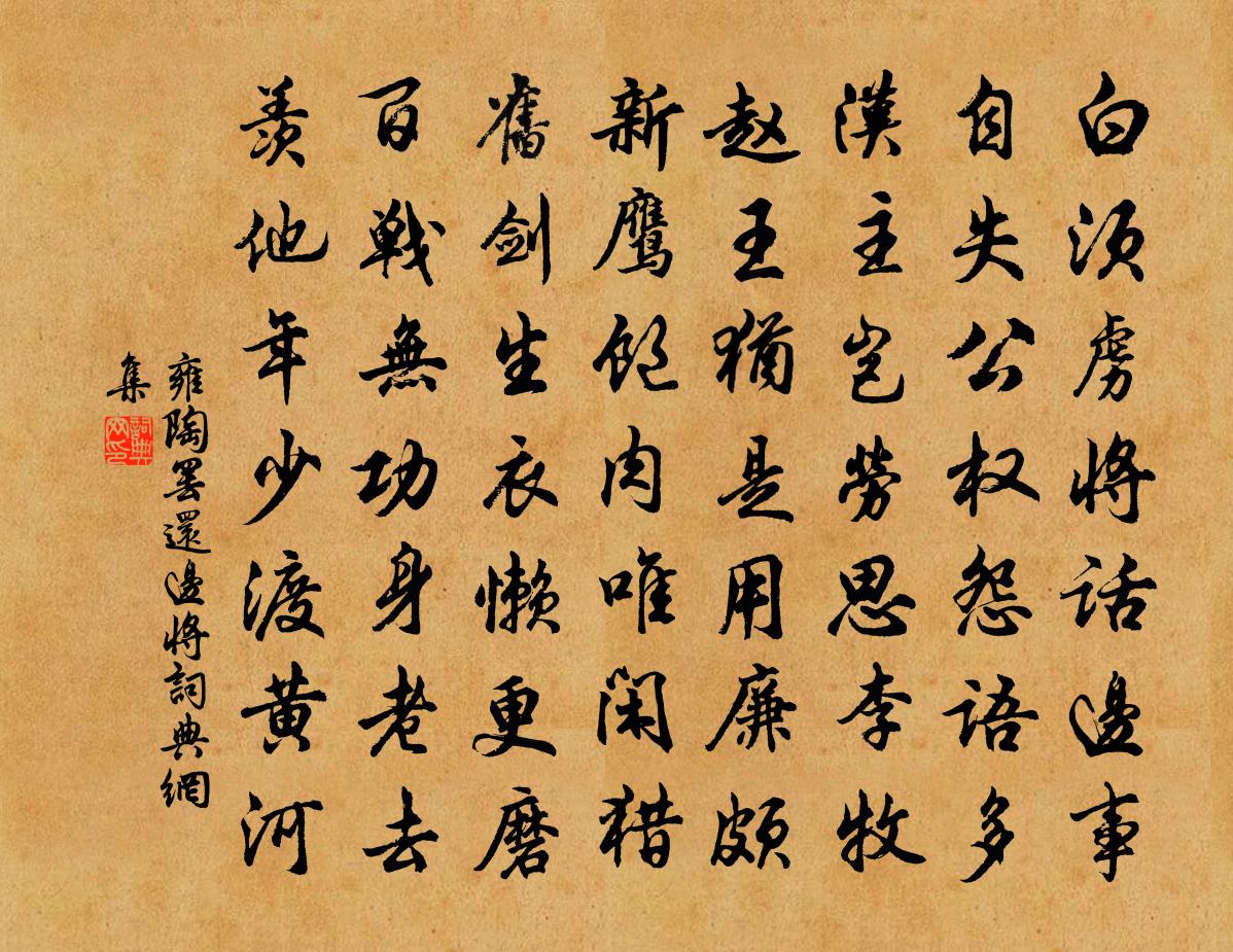 詩詞名句歷史字典書法欣賞書法字典國語詞典說文解字康熙字典古漢語字典標 題 作 者 詩 句 罷還邊將作者:雍陶 朝代:唐代罷還邊將原文白須虜將話邊事,自失公權怨語多。漢主豈勞思李牧,趙王猶是用廉頗。新鷹飽肉唯閒獵,舊劍生衣懶更磨。百戰無功身老去,羨他年少渡黃河。詩詞問答問:罷還邊將的作者是誰?答:雍陶問:罷還邊將寫於哪個朝代?答:唐代雍陶罷還邊將書法欣賞罷還邊將書法作品詩詞推薦題束季博山園二十首石橋牟巘五〔宋代〕神仙好狡獪,空飛萬里行。石橋小如許,鐵杖響彭鏗。夏日過鄭七山齋杜審言〔唐代〕共有樽中好,言尋谷口來。薜蘿山逕入,荷芰水亭開。日氣含殘雨,雲陰送晚雷。洛陽鐘鼓至,車馬系遲回。挽徐居士二首金履祥〔宋代〕昔年澇旱苦頻仍,南北郊關自越秦。東浙於時猶道殣,嚴邦此地況山民。能回涸轍西江水,頓起翳桑寒谷春。神理沁園春 次前韻劉敏中〔元代〕別後何如,兩鬢全霜,寸心尚丹。但酒腸蕭瑟,常因病窄,詩懷寥落,強為秋寬。無補公家,坐縻廩粟,自笑閒身翁媼嘆趙汝鐩〔宋代〕早曦赫空歲不熟,炊甑飛塵煮薄粥。翁媼飢雷常轉腹,大兒嗷嗷小兒哭。愁死未死此何時,縣道賦不遺毫里。科胥九隴津集盧照鄰〔唐代〕落落樹陰紫,澄澄水華碧。復有翻飛禽,裴回疑曳舄。送張秀才北上時將赴海傅若金〔元代〕身逐征帆赴海涯,道逢行李問京華。涓人解致燕王馬,卜史工占蜀客槎。冠蓋早朝星在樹,管弦春宴月當花。盛時菩薩蠻王去疾〔宋代〕吳波深波聲急。闌乾下瞰魚龍宅。江北與江南。斜陽山外山。十洲三島地。夢裡身曾至。今日醉危亭。神仙邀我盟題曹實庵珂雪詞陳維崧〔清代〕滿酌涼州醞。愛佳詞、一編《珂雪》,雄深蒼穩。萬馬齊暗蒲牢吼,百斛蛟螭囷蠢。算笛拍、鶯簧休混。多少詞場覽古四十二首 其二十八楊維楨〔元代〕羲之在東床,風操夙所稱。藍田謄轉重,胡乃意不平。出吊屈在我,反惡固其情。以此悻悻死,無異匹婦輕。詹仲信出示卜居詩佳甚作二絕句謝之陸游〔宋代〕十里相望亦未遙,何由頻得慰無聊。老來萬事慵開眼,獨喜詩盟不寂寥。剡溪竹紙三首曾幾〔宋代〕會稽竹箭東南美,化作經黃紙疊層。舊日土毛無用處,剡中老卻一溪藤。臨刑詩鄭頲〔唐代〕幻生還幻滅,大幻莫過身。安心自有處,求人無有人。魯從事清暉閣穆修〔宋代〕庾郎真好事,溪閣斬新開。水石精神出,江山氣色來。疏煙分鷺立,遠靄見帆回。公退資清興,閒吟倚檻裁。君子有所思行陸機〔魏晉〕命駕登北山。延佇望城郭。廛里一何盛。街巷紛漠漠。甲第崇高闥。洞房結阿饋。曲池何湛湛。清川帶華薄。邃宇句李善美〔宋代〕峴首何人碑,行客獨垂淚。南軒曾極〔宋代〕劍磨驢膊倦征途,三歲南軒客寓居。建業水甘供日飲,波間亦有武昌魚。山居避難六首陳著〔宋代〕避地托山翁,歸心亦欲東。西村明騎火,北渡撼兵風。抖擻塵衣黑,摩挲淚眼紅。何如且深隱,苟活老光鴻。挽荊南師張左司詩項安世〔宋代〕昔者登簾閣,先生病已瘳。從容當世事,反覆萬端尤。力盡千家活,身疲十日留。向來天下乾,端為一城休。夜讀鞏仲至閩中詩有懷其人陸游〔宋代〕詩思尋常有,偏於客路新。能追無盡景,始見不凡人。細讀公奇作,都忘我病身。蘭亭盡名士,逸少獨清真。名句推薦煙籠寒水月籠沙,夜泊秦淮近酒家。杜牧《泊秦淮》 地中有山,謙;君子以裒多益寡,稱物平施。佚名《易傳·象傳上·謙》 空山不見人,但聞人語響。王維《鹿柴》 夫兩貴之不能相事,兩賤之不能相使,是天數也。荀子《荀子·王制》 酒意詩情誰與共?淚融殘粉花鈿重。李清照《蝶戀花·暖雨晴風初破凍》 論至德者不和於俗,成大功者不謀於眾。司馬遷《史記·趙世家》 大丈夫相時而動。曹雪芹《紅樓夢·第四回》 撩亂舞晴空,發人無限思。劉禹錫《柳花詞三首》 天子,兵強馬壯者當為之,寧有種耶!薛居正《舊五代史·後晉·列傳十三》 相思血,都沁綠筠枝。姜夔《小重山令·賦潭州紅梅》
