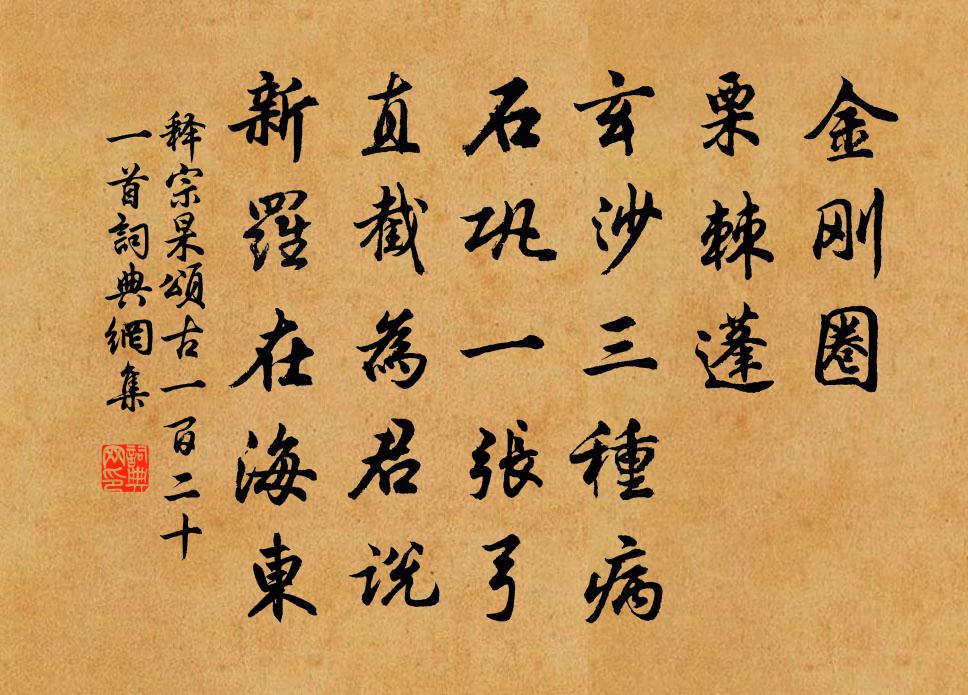 詩詞名句歷史字典書法欣賞書法字典國語詞典說文解字康熙字典古漢語字典標 題 作 者 詩 句 頌古一百二十一首作者:釋宗杲 朝代:宋代頌古一百二十一首原文金剛圈,栗棘蓬。玄沙三種病,石鞏一張弓。直截為君說,新羅在海東。詩詞問答問:頌古一百二十一首的作者是誰?答:釋宗杲問:頌古一百二十一首寫於哪個朝代?答:宋代釋宗杲頌古一百二十一首書法欣賞頌古一百二十一首書法作品詩詞推薦辛丑歲暮三首戴復古〔宋代〕臘盡無多日,吾生有幾年。老於人事懶,貧覺世情偏。獨枕江湖夢,閉門風雪天。三杯動詩興,得句落梅邊。永安渠石銘佚名〔唐代〕百年為市後為池。秋夜安國觀聞笙劉禹錫〔唐代〕織女分明銀漢秋,桂枝梧葉共颼飀。月露滿庭人寂寂,霓裳一曲在高樓。亂中偷路入故鄉裴說〔唐代〕愁看賊火起諸烽,偷得餘程悵望中。一國半為亡國燼,數城俱作古城空。西江月王哲〔元代〕堪嘆木金相間。夫庚婦開顏。聲美處水潺潺。清流出澗。滋潤黃芽無限。便教白雪循環。西江月里我躋攀。步步銀送陳養晦謁閬風舍先生四首戴表元〔宋代〕嚼雪餐冰二十年,空月日月自風煙。從君識盡搜詩法,不透薌岩不是仙。五泄山寺廖虞弼〔宋代〕招提深鎖綠苔幽,故遣高人向此留。萬疊雲山從地涌,雙源瀑布自天流。風翻象宇松聲碎,雨過禪房竹翠浮。試問畫堂春·落紅鋪徑水平池秦觀〔宋代〕落紅鋪徑水平池,弄晴小雨霏霏。杏園憔悴杜鵑啼,無奈春歸。柳外畫樓獨上,憑欄手捻花枝,放花無語對斜暉,奉挽近故太夫人史氏二首度正〔宋代〕有子來為牧,孜孜奉母慈。涵濡千里澗,雍睦一家推。壽考國人願,循良聖主知。詔書催令伯,嘆息想遺規。誠齋指檐頭雪為詩材二首袁說友〔宋代〕春風著意向春宵,巧作冰澌細細飄。正好千門競燈火,故添萬瓦燦瓊瑤。誰憐梅蕊猶含玉,大遣楊花為奪標。一段次前韻酬王景雲見和三首陳著〔宋代〕與子相逢別未長,新詩寄我寂寞鄉。嚼情咀義心如醉,背立西風不自將。順堂夜雨錢時〔宋代〕海棠初綻錦成林,多少人間富貴心。雋永一燈論語課,蕭蕭風雨夜堂深。晴望楊萬里〔宋代〕愁於望處一時銷,山亦霜前分外高。枸杞一叢渾落盡,只殘紅乳似櫻桃。偈公六十五首釋鹹傑〔宋代〕一新一舊,跳出窠臼。一出一入,胡餅里呷汁。一擒一縱,開眼作夢。一照一用,鱔魚走入麻油翁。劉晁之家園六詠佇棹姜特立〔宋代〕青溪一曲似清湘,刳木臨流制小航。莫怪時時來佇棹,一生心事水雲鄉。九日郡齋有感薛逢〔唐代〕白日貪長夜更長,百般無意更思量。三冬不見秦中雪,九日惟添鬢畔霜。霞泛水文沈暮色,樹凌金氣發秋光。樓前與李十一夜飲元稹〔唐代〕寒夜燈前賴酒壺,與君相對興猶孤。忠州刺史應閒臥,江水猿聲睡得無。分流水司空曙〔唐代〕古時愁別淚,滴作分流水。日夜東西流,分流幾千里。通塞兩不見,波瀾各自起。與君相背飛,去去心如此。望茅山六言三首周文璞〔宋代〕羽衣藥叟歡迎,手執蘭花共行。從此十年不調,可能久視長生。傷亂韓偓〔唐代〕岸上花根總倒垂,水中花影幾千枝。一枝一影寒山里,野水野花清露時。故國幾年猶戰鬥,異鄉終日見旌旗。交親名句推薦言有招禍也,行有招辱也,君子慎其所立乎。荀子《荀子·勸學》 露下旗濛濛,寒金鳴夜刻。李賀《塞下曲》 復恐匆匆說不盡,行人臨發又開封。張籍《秋思》 世人結交須黃金,黃金不多交不深。張謂《題長安壁主人》 士有妒友,則賢交不親;君有妒臣,則賢人不至。荀子《荀子·大略》 得失一朝,而榮辱千載。范曄《後漢書·列傳·荀韓鐘陳列傳》 君寵益嬌態,君憐無是非。王維《西施詠》 近來何處有吾愁,何處還知吾樂。辛棄疾《念奴嬌·賦雨岩》 一念開明,反身而誠王陽明《傳習錄·卷中·答陸原靜書》 燕燕輕盈,鶯鶯嬌軟,分明又向華胥見。姜夔《踏莎行·自沔東來丁未元日至金陵江上感夢而作》